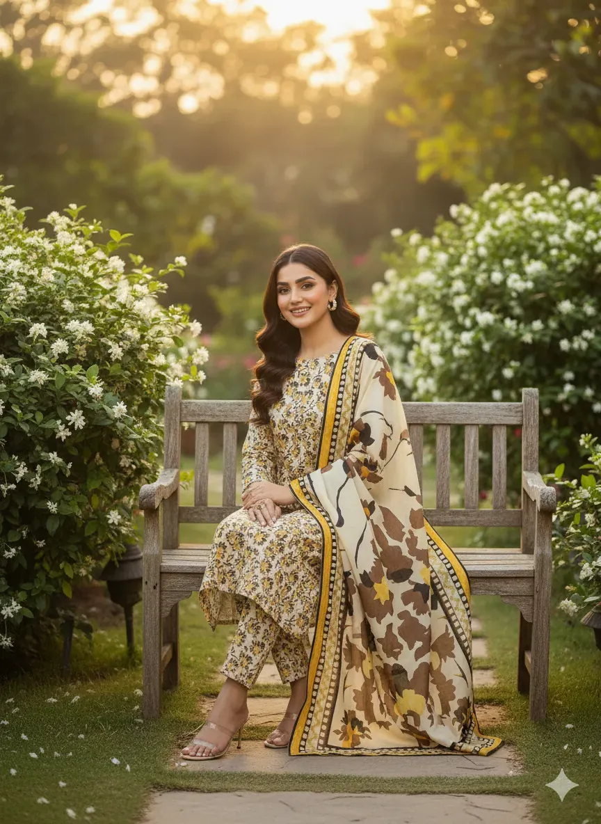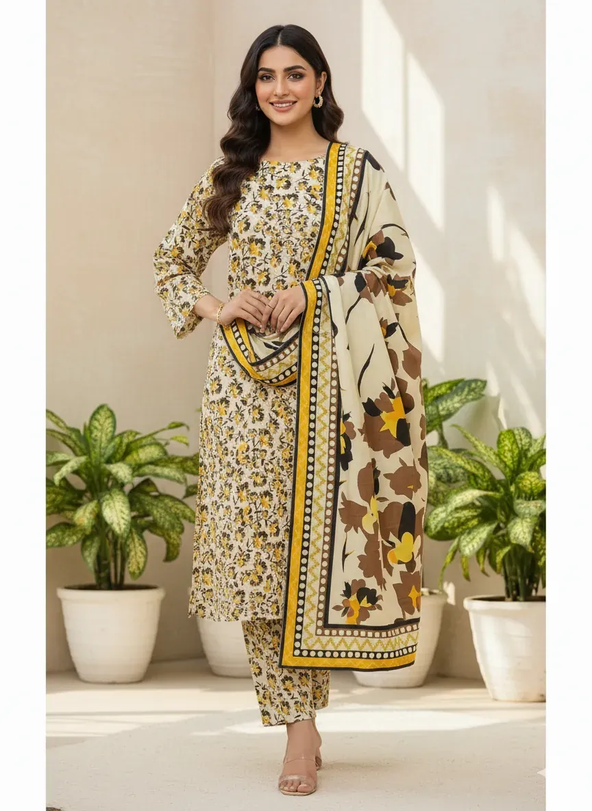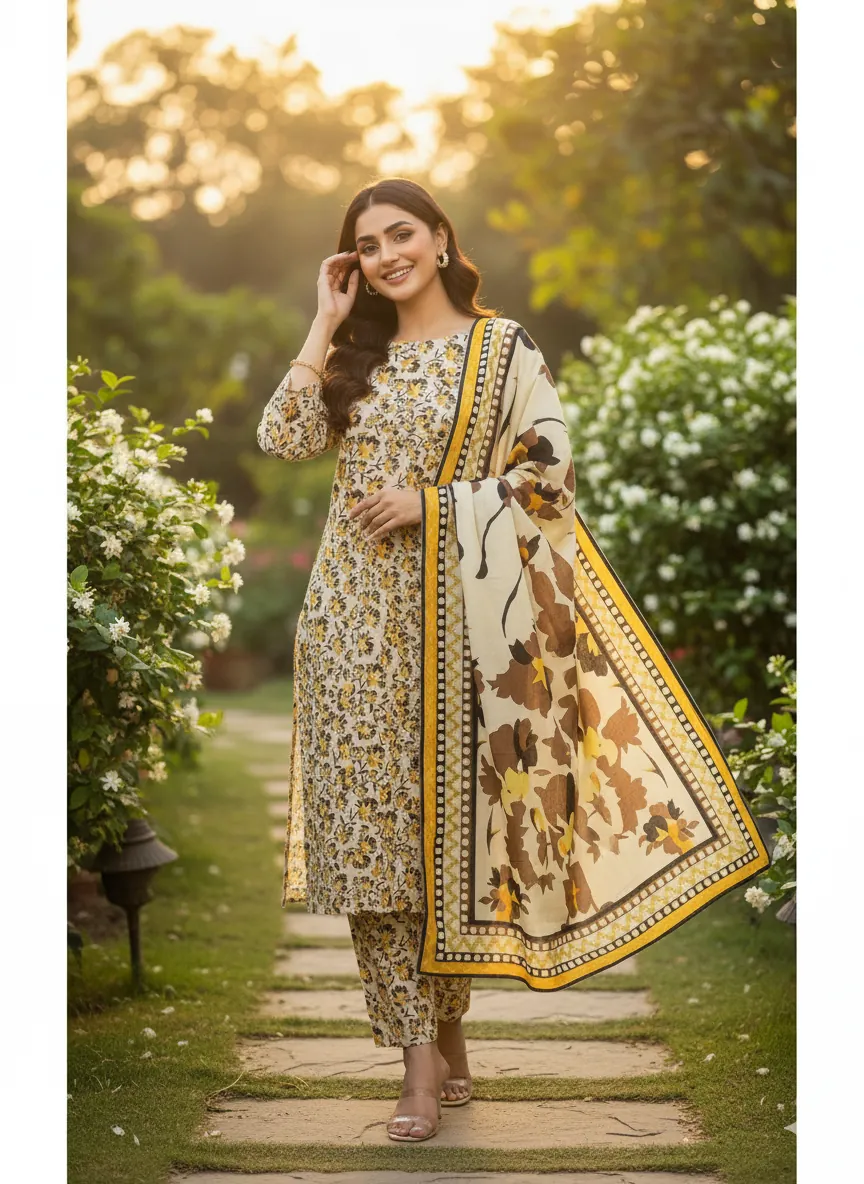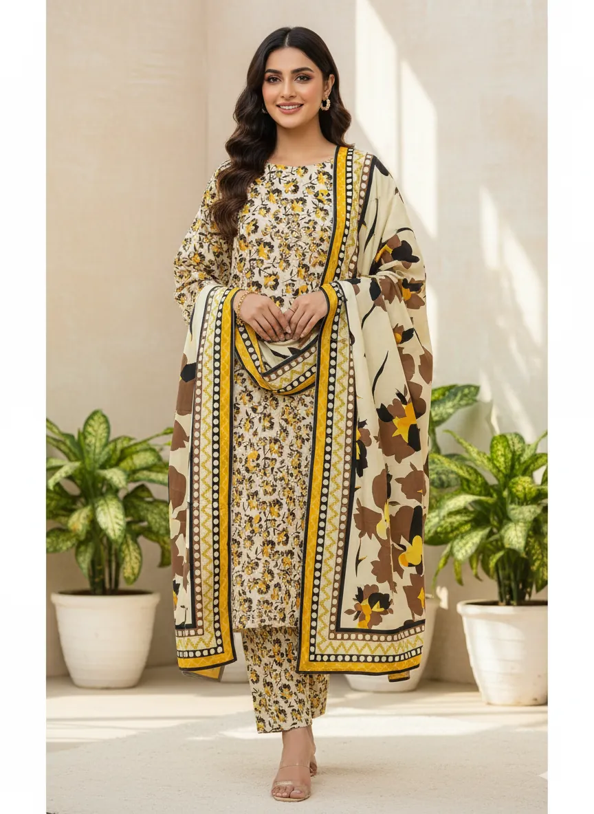 Discover the perfect blend of tradition and modern style with this authentic Bonanza Original linen suit. The 'Misri Gold' design showcases a beautiful mix of warm mustard yellow, rich brown, and classic black floral motifs set against an elegant cream background. The all-over printed shirt provides a graceful and flowing silhouette, while the matching printed trouser completes the ensemble with cohesive style. A vibrant printed linen dupatta, featuring a bold geometric pattern, adds a dynamic and eye-catching element to the set. Crafted from premium, breathable linen, this suit is not only visually stunning but also incredibly comfortable for all-day wear. The fabric and color quality are guaranteed to be 100% authentic, ensuring a high-quality product that lasts. This unstitched suit provides the freedom to be tailored to your perfect fit, making it an essential addition to your wardrobe for any season.