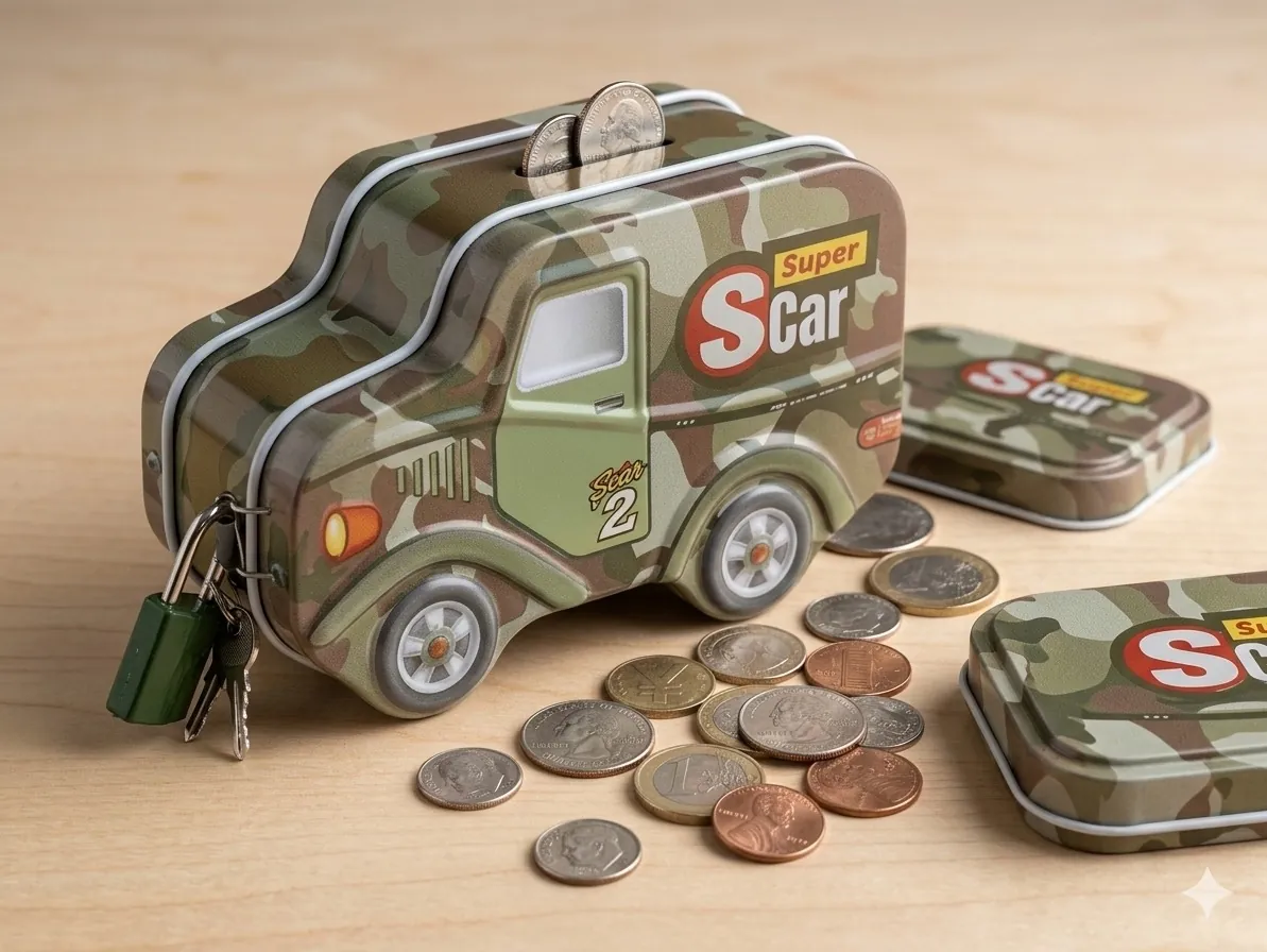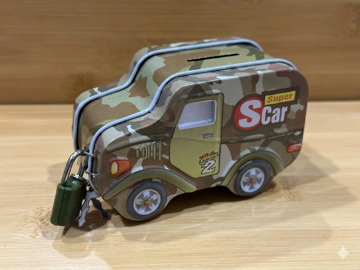 Take your savings on a mission with the Camouflage Truck Metal Piggy Bank. Crafted from high-quality, lightweight tinplate, this savings box is designed to look like a rugged military transport vehicle. The exterior features a classic green and brown camo pattern, complete with "Super Scar" branding and realistic truck details.