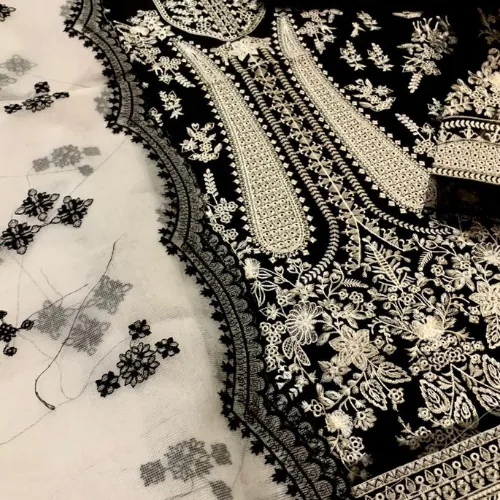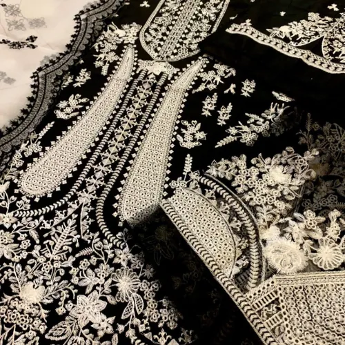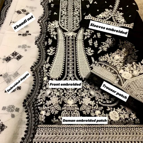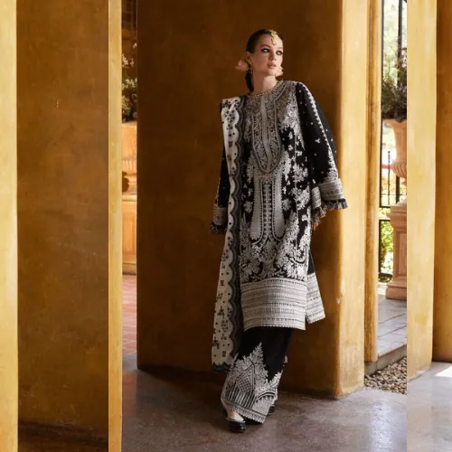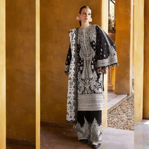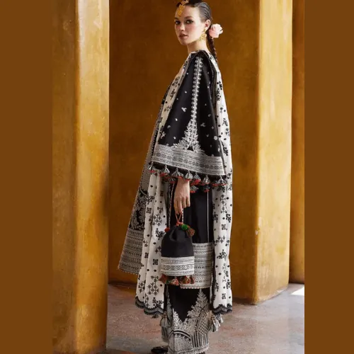 Step into the spotlight with this exquisite creation from Charizma's Most Demanding Edition. Designed for those with a flair for the dramatic and a love for traditional craftsmanship, this 3-piece unstitched suit is a true work of art. The deep black Dhank fabric serves as the perfect canvas for the dense, contrasting off-white embroidery that flows across the ensemble.