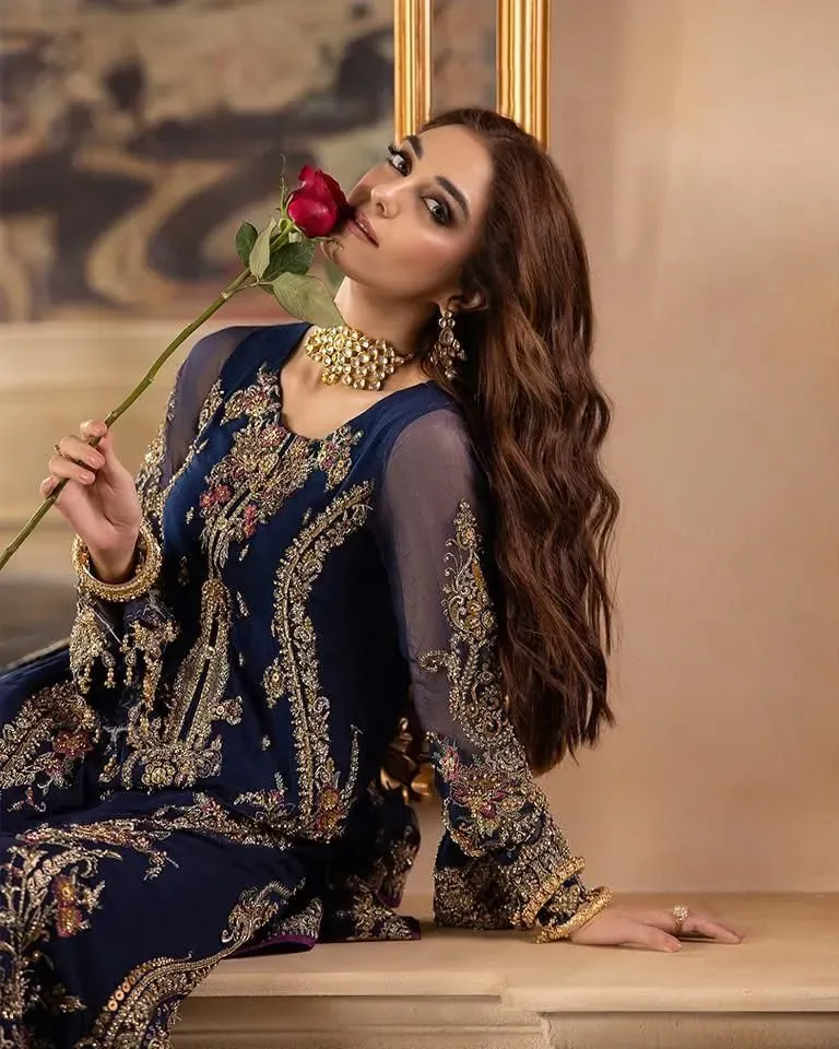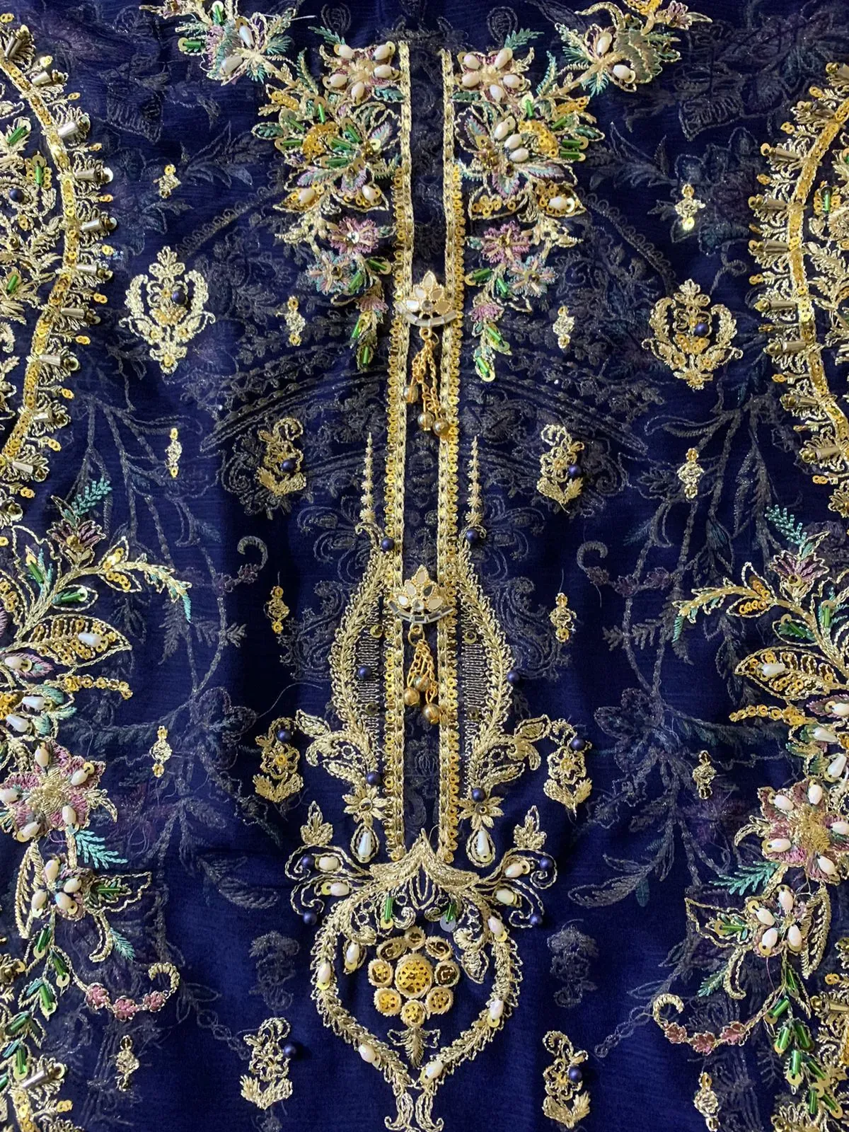 This CHARIZMA Formal Suit is a masterpiece of craftsmanship, designed to make you shine at any special occasion. The rich navy blue chiffon fabric is meticulously adorned with detailed hand embroidery, creating a breathtaking pattern of golden and multicolored motifs. The heavily worked daman (hem) and stunning sleeves showcase exceptional artistry, with sequins adding a touch of sparkle and glamour.