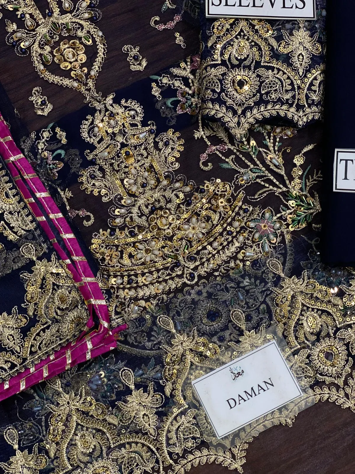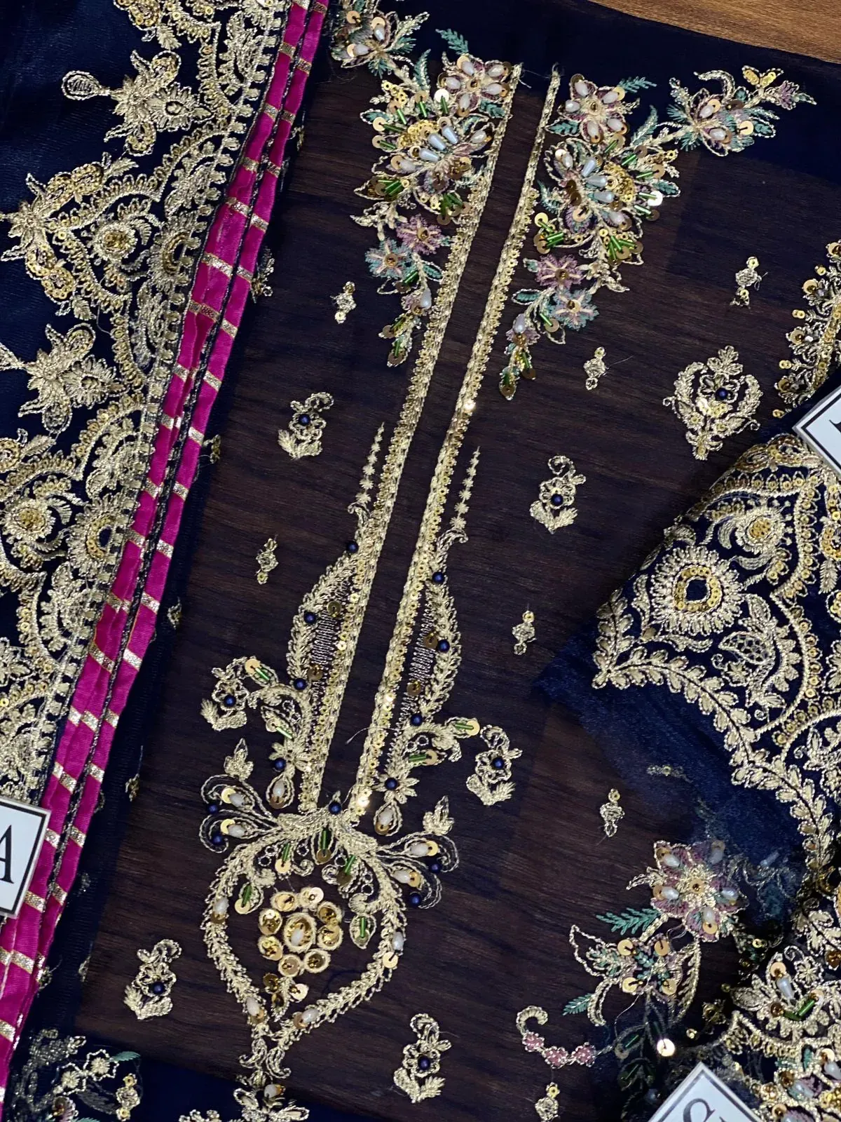 CHARIZMA Formal Embroidered Navy Blue Chiffon Suit | Pakistani Bridal & Wedding Dress with Net Dupatta