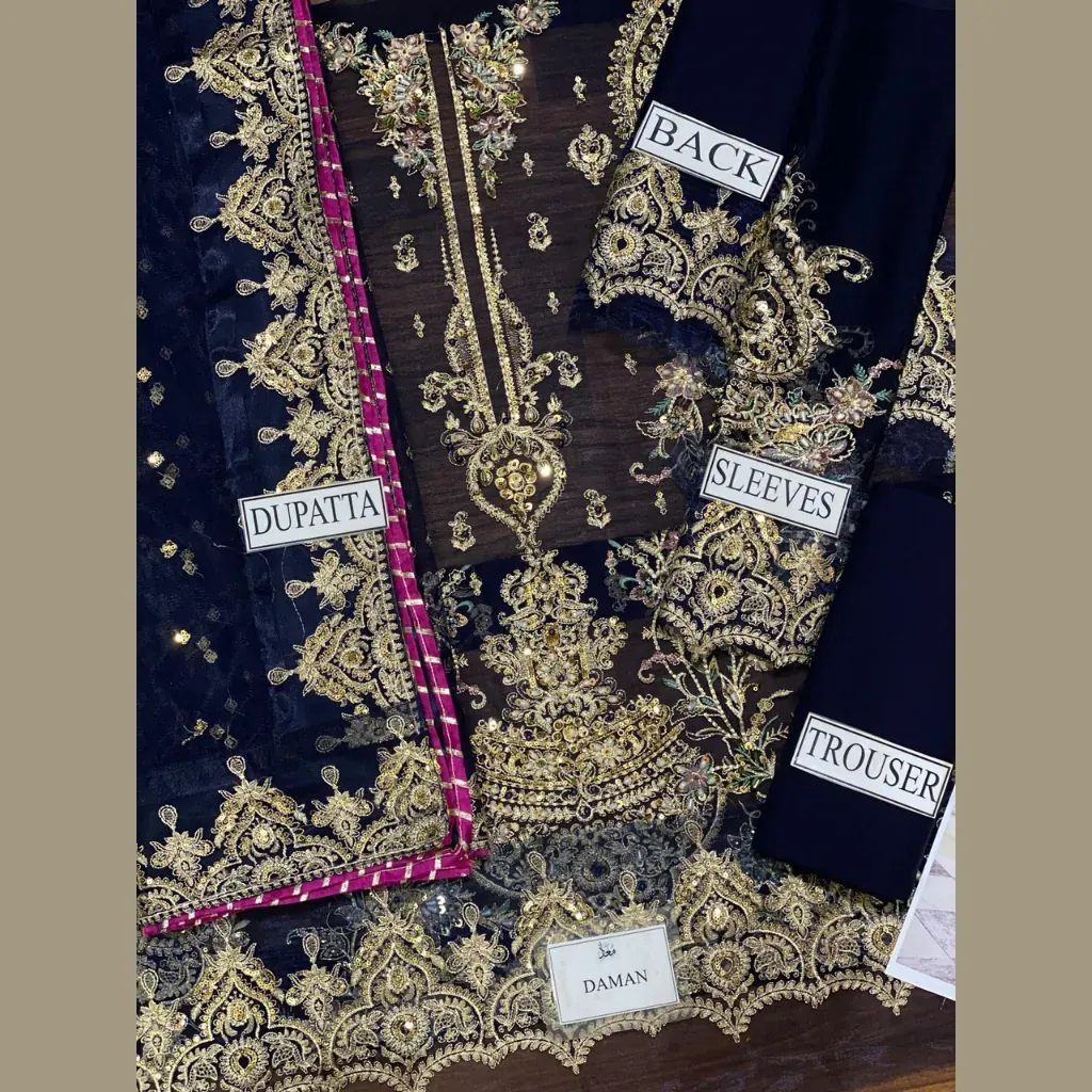 The front panel is richly embroidered with sequence & moti work, while the neckline and daman feature exquisite hand embellishments. The sleeves come with elegant chiffon embroidery, and the back is kept plain for a graceful balance. Paired with a soft malai trouser and a ready-to-wear net embroidered dupatta, this dress ensures a complete luxury look.