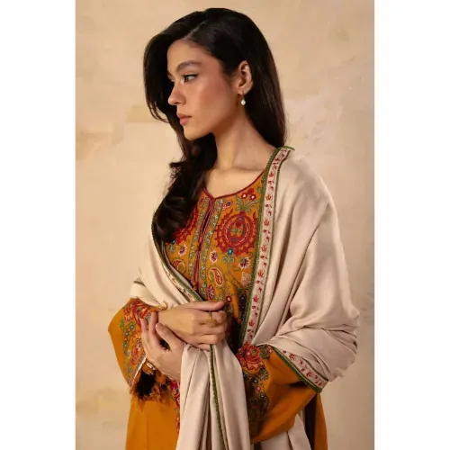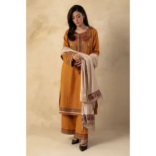The ensemble is completed with a dhanak embroidered shawl, enhanced with pallu work that gives it a graceful and distinguished appearance. Perfect for winter festivities, formal gatherings, and evening occasions, this suit provides both warmth and elegance in a single design. With its premium fabric and exquisite embroidery, it is an ideal choice for those who want to make a lasting impression