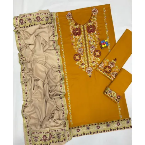 The COCO Dhanak Embroidered Luxury 3-Piece Unstitched Suit is a masterpiece designed for women who value elegance, comfort, and timeless fashion. Crafted from high-quality dhanak fabric, it features a beautifully embroidered front and sleeves that highlight intricate needlework. The embroidered daman adds extra refinement, ensuring every detail reflects luxury and sophistication. Paired with a dyed dhanak trouser finished with an embroidered patch, the outfit combines traditional charm with a modern edge.