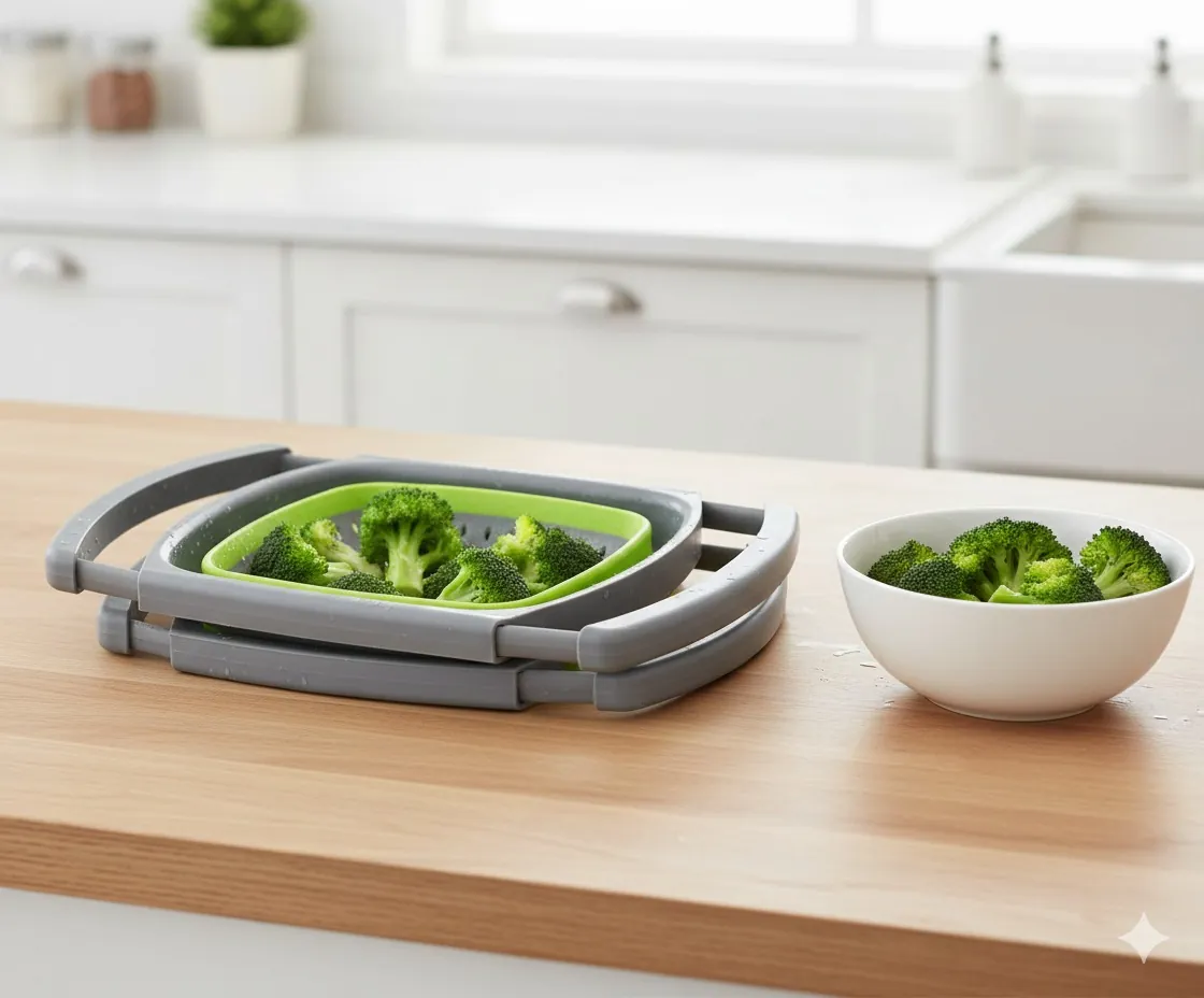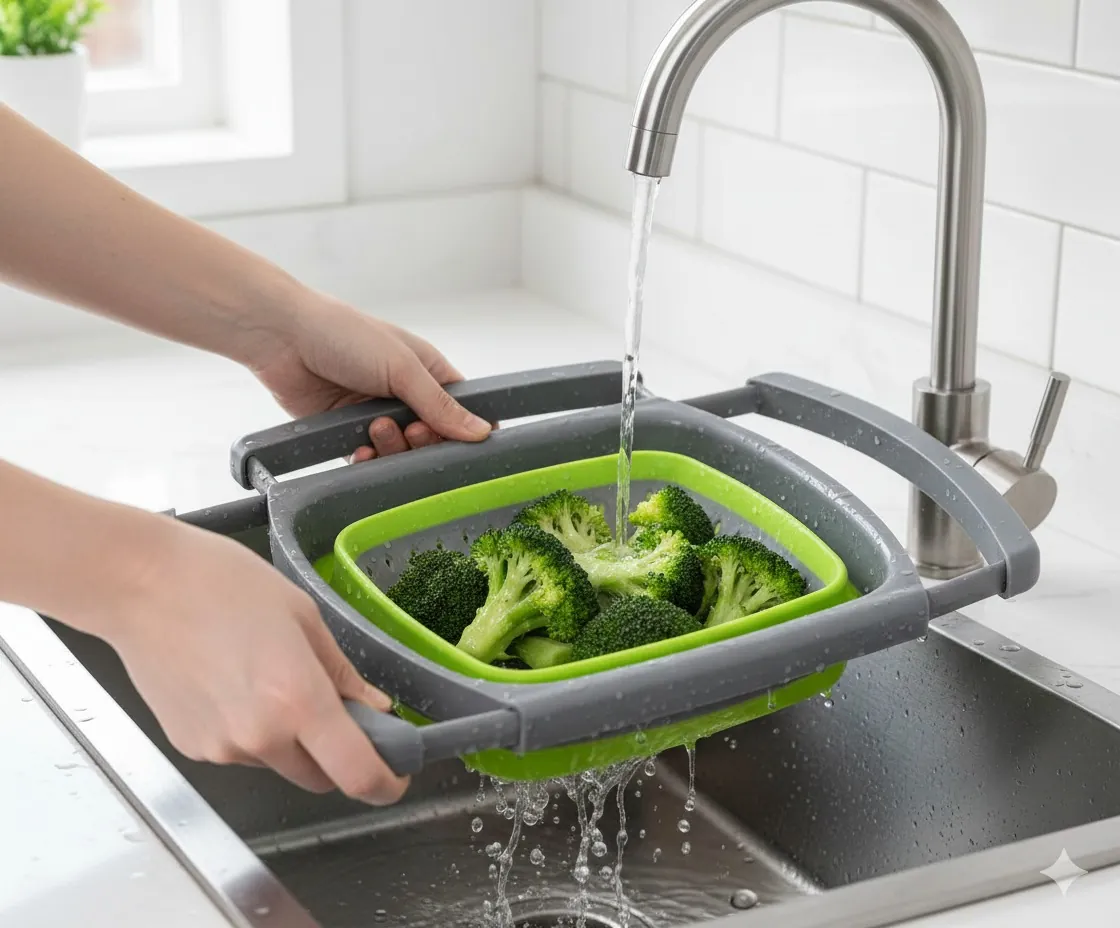 Experience the ultimate convenience in food preparation with our premium Collapsible Over-the-Sink Colander. Designed for modern, space-conscious kitchens, this dual-tone green and grey strainer eliminates the clutter of bulky traditional baskets. The innovative extendable handles stretch to bridge across your sink, providing a stable, hands-free workspace that prevents splashing and keeps your food away from the sink floor.