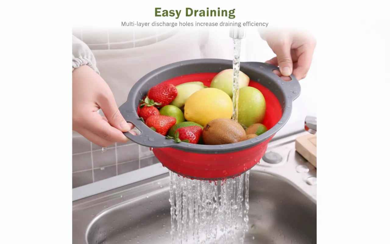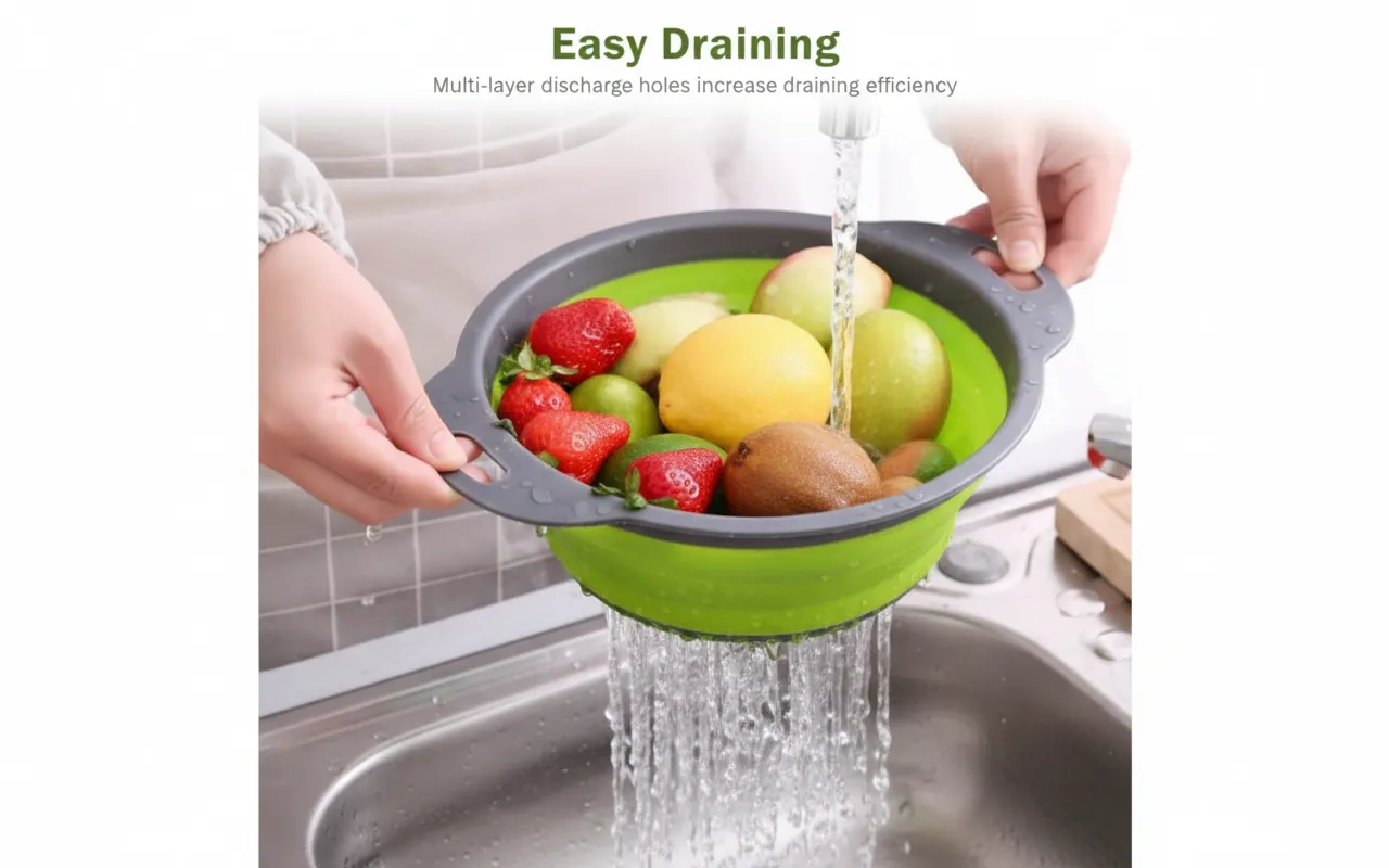 Whether you are rinsing fresh berries, draining boiling water from pasta, or using it as a countertop fruit bowl, this basket adapts to your needs. The sturdy, ergonomic handles ensure a secure grip even when wet, and the perforated bottom provides rapid drainage to keep your produce fresh and clean. When you're done, simply press down to collapse it into a slim profile (less than 2 inches thick), making it the ultimate solution for small apartments, RVs, camping, or busy family kitchens. Upgrade your kitchen with this versatile, space-saving collapsible basket. Perfect for washing fruits, straining pasta, or draining vegetables, this durable and heat-resistant colander folds flat to fit in any drawer or cabinet.