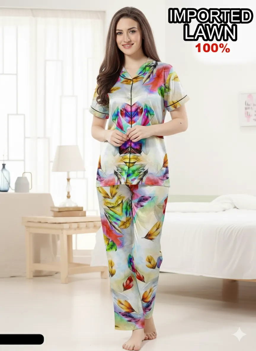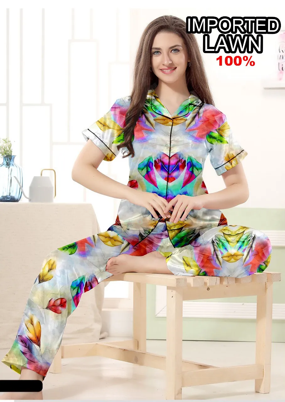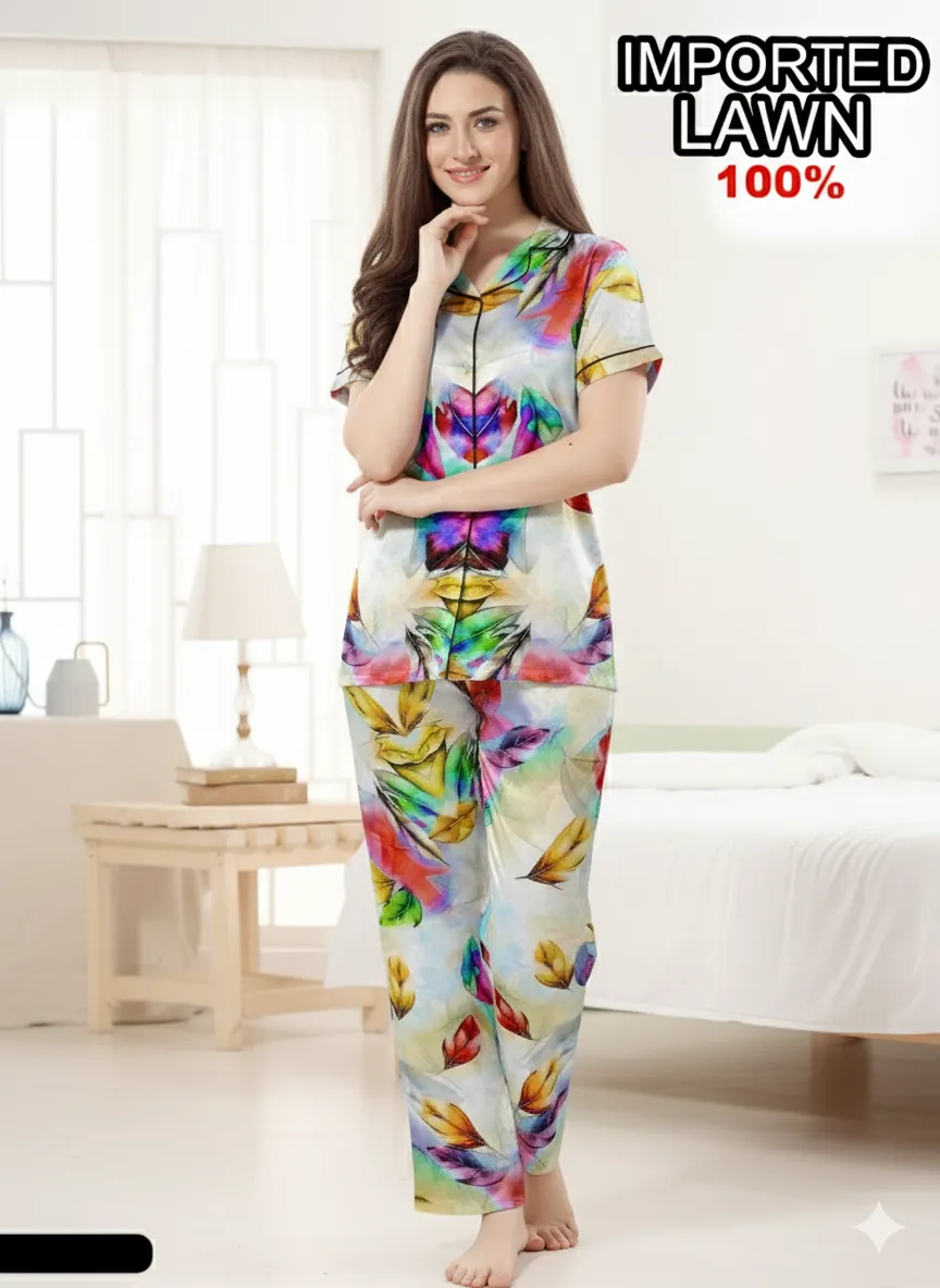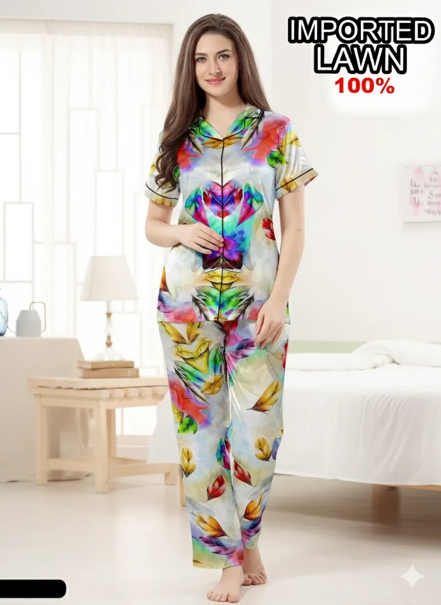 Colorful Floral Printed 2-Piece Lawn Night Suit for Women – Imported Fabric – Medium & Large
