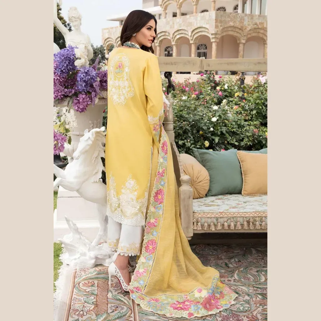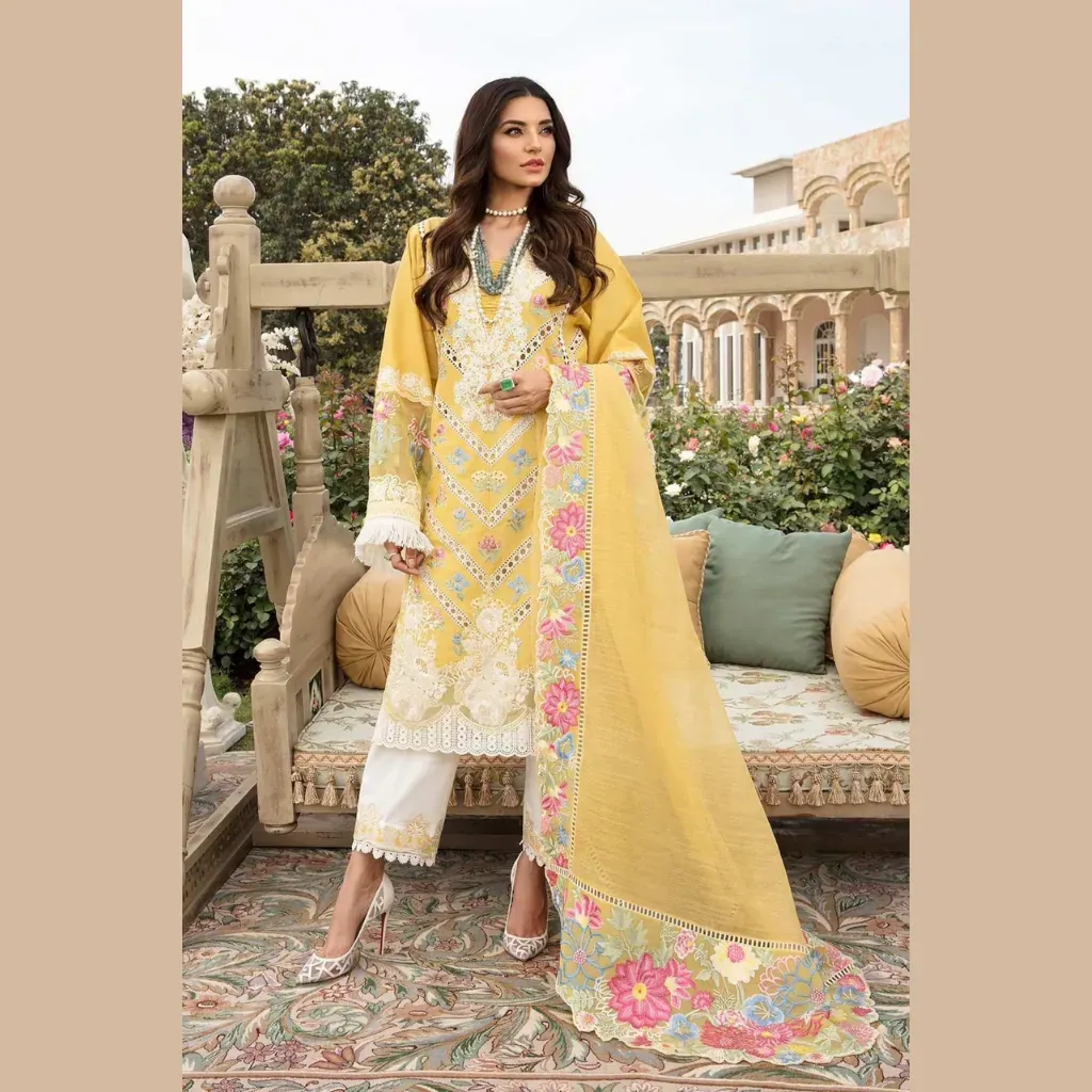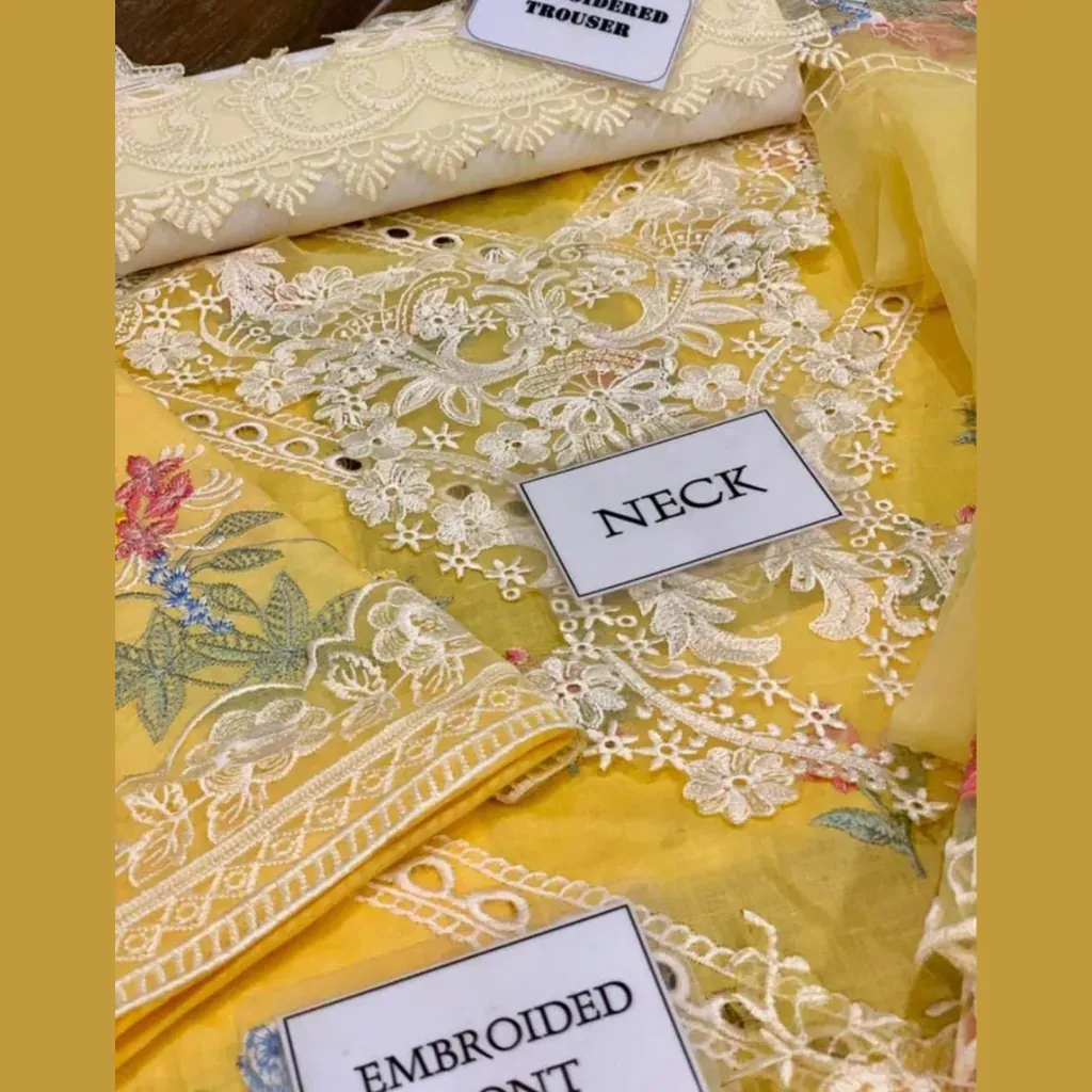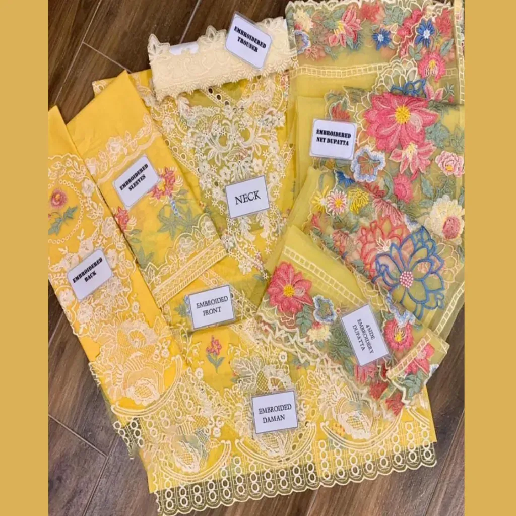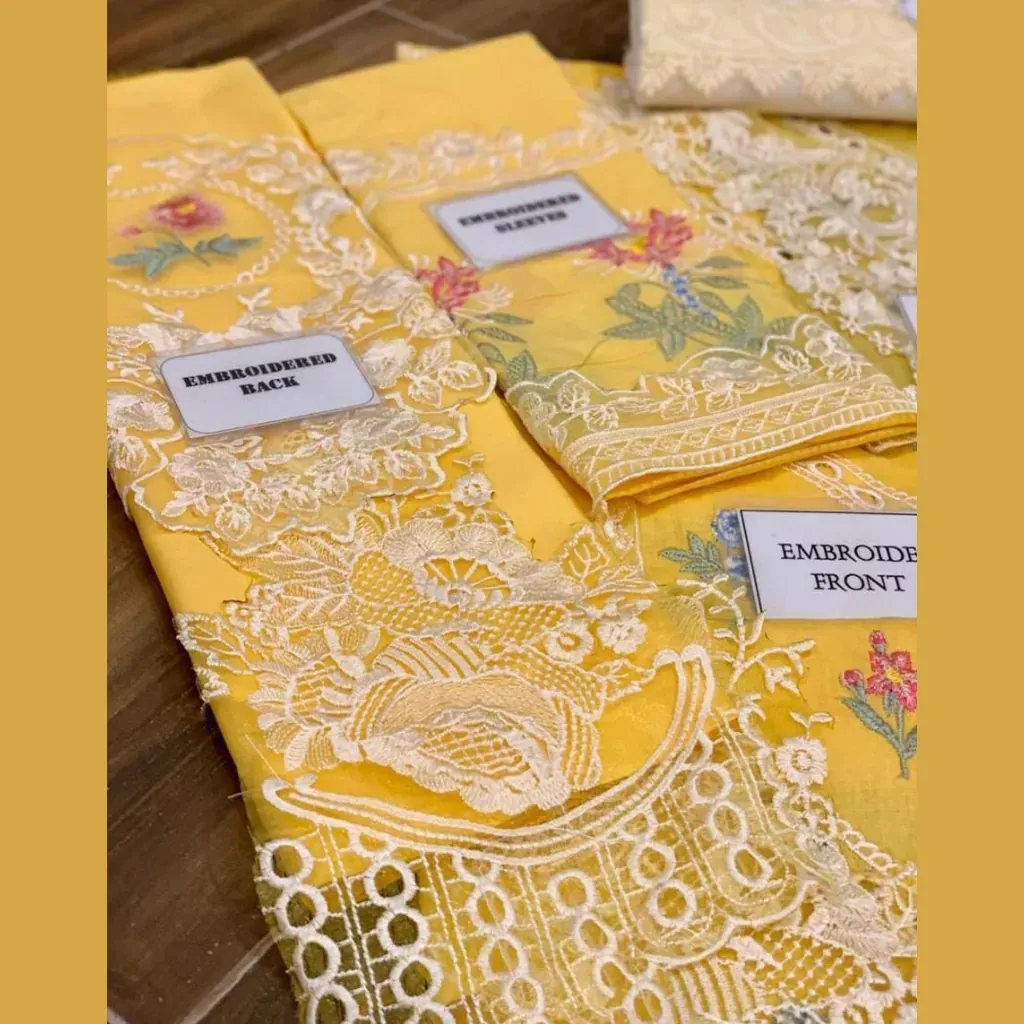 The cotton sleeves come with fine embroidery and detailed borders, while the back features a cotton base enhanced with embroidered bunches, adding a balanced and stylish touch. The highlight of this outfit is the embroidered organza dupatta with two-sided embroidered pallus and elegant attachments, making it a statement piece of the ensemble.