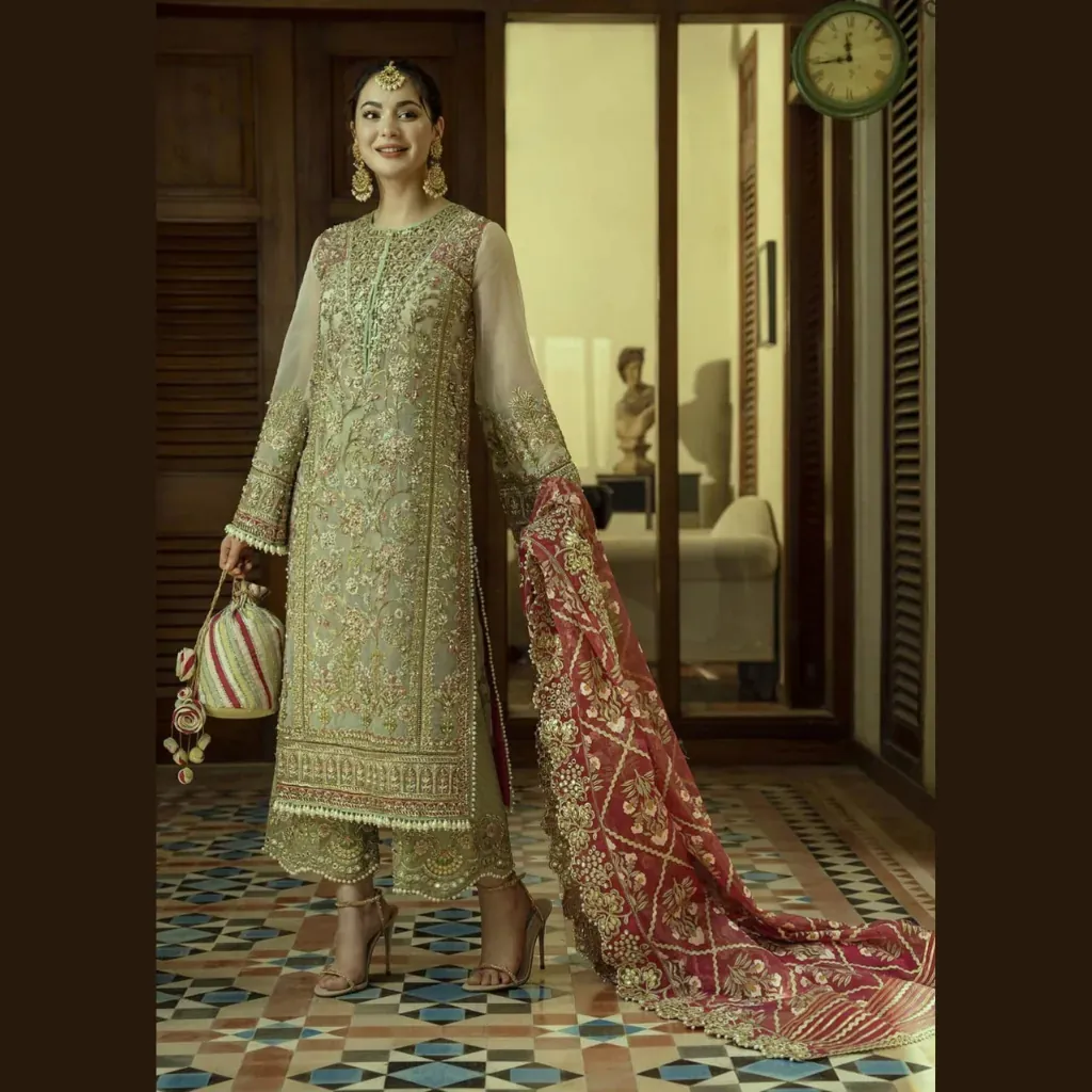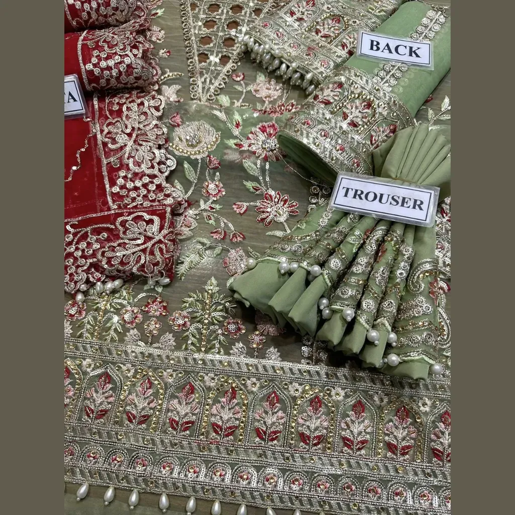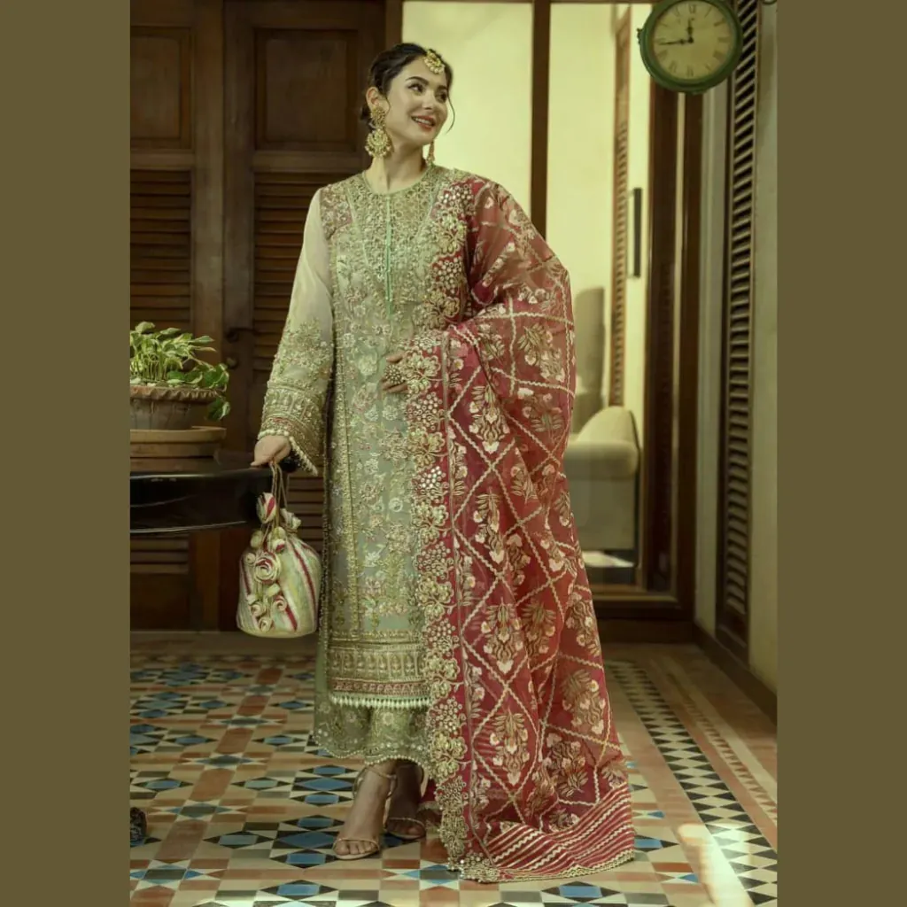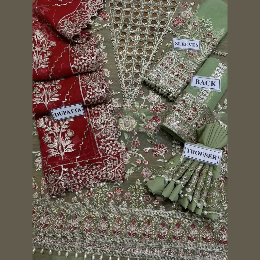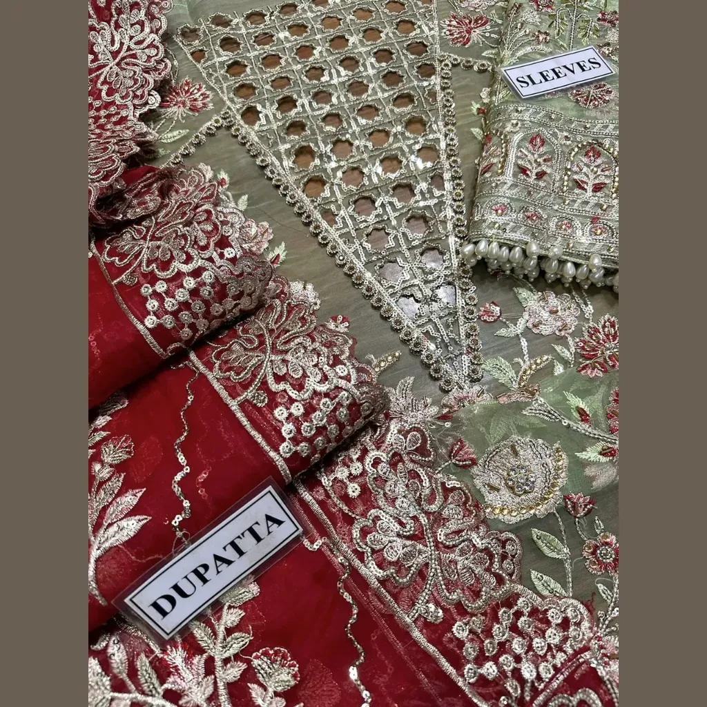 Indulge in elegance with this Crimson Hand Embellished Organza 3Pc Luxury Suit. Designed with intricate embroidery and hand embellishment on the front, sleeves, and dupatta, paired with a plain malai trouser and embroidered patch. A perfect choice for weddings, parties, and festive occasions.