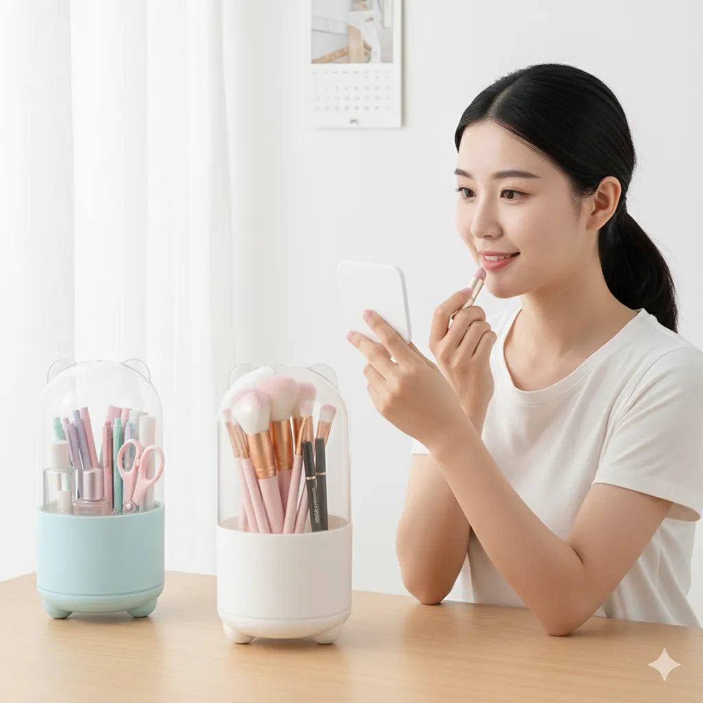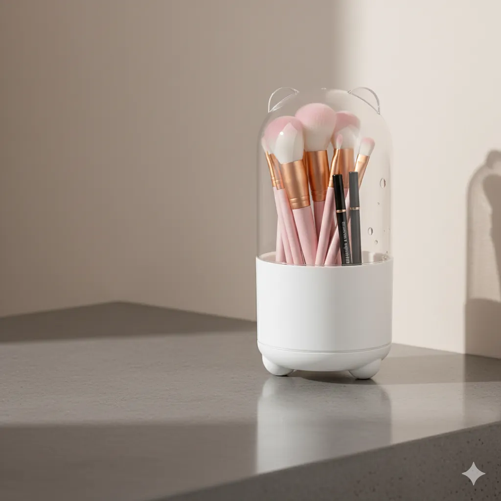 Cute Bear Ear Dustproof Makeup Brush Holder & Desk Organizer. Organize your space with charm and efficiency using the Cute Bear Ear Desktop Organizer. This product is designed with a durable, opaque base and a tall, transparent dustproof cover that slides or lifts off easily, preventing dust and moisture from settling on your items. The small ear-like protrusions on the lid add a playful, adorable touch to your room's decor.