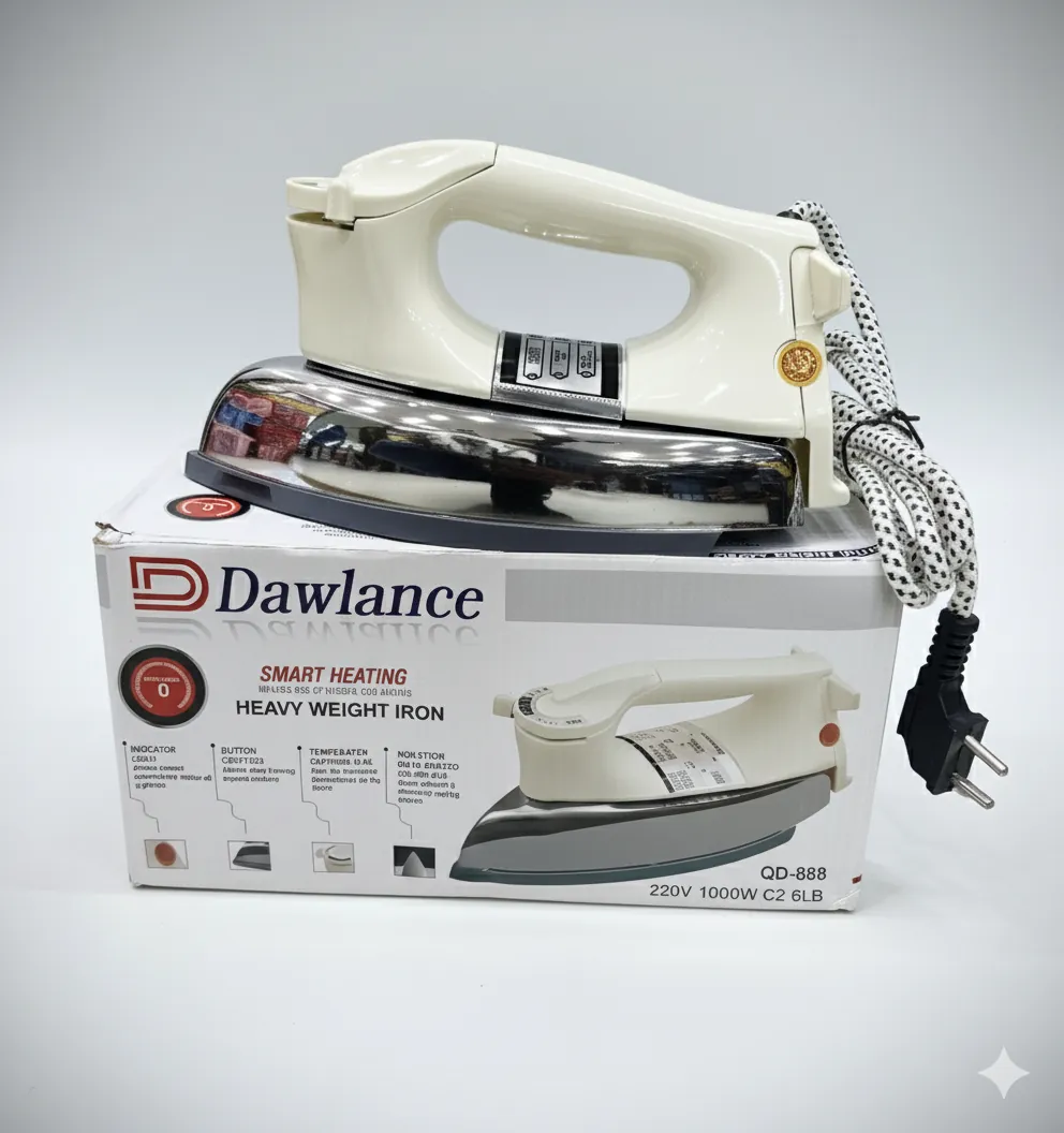 Experience effortless and professional-grade ironing with the Dawlance QD-888 Heavy Weight Dry Iron. Designed for durability and efficiency, this iron features smart heating technology that automatically adjusts the temperature to prevent clothes from burning. Its powerful 1000W motor ensures quick and even heating, while the non-stick coated soleplate glides smoothly over all types of fabrics, from delicate silks to thick cottons and wool. The heavy weight design applies optimal pressure for stubborn wrinkles, making your ironing tasks faster and easier. With its ergonomic handle and robust build, the Dawlance QD-888 is a reliable and long-lasting addition to your home.