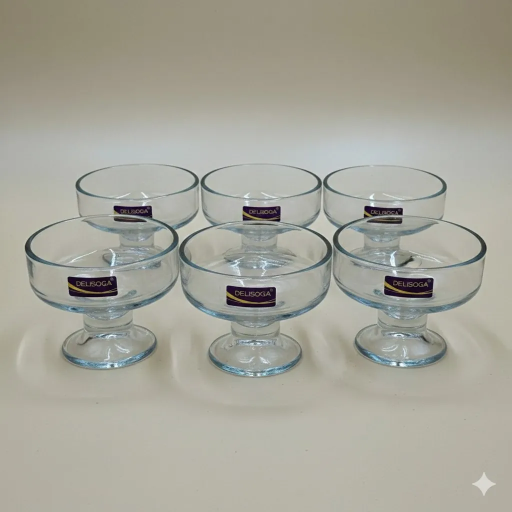 Delisoga Set of 6 Premium Clear Glass Ice Cream Bowls | Elegant 220ml Footed Dessert Cups for Pudding, Fruit, & Sundaes | Durable Lead-Free Glassware for Home, Cafes & Parties