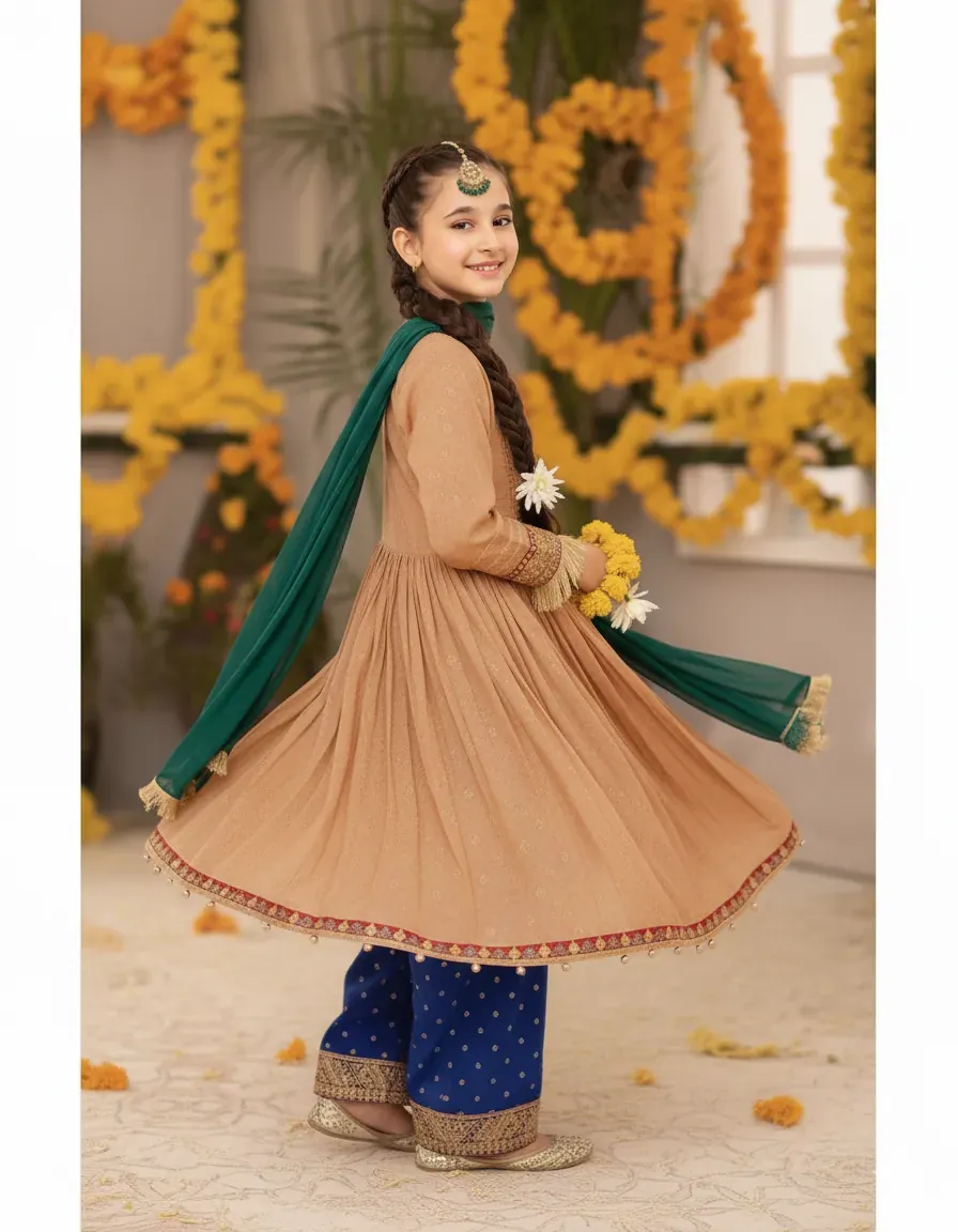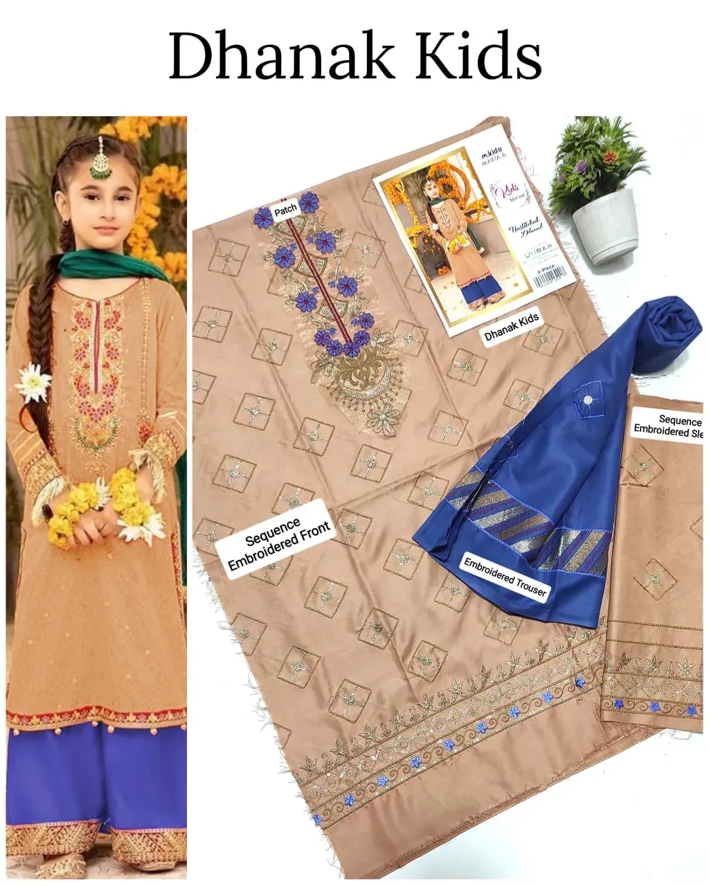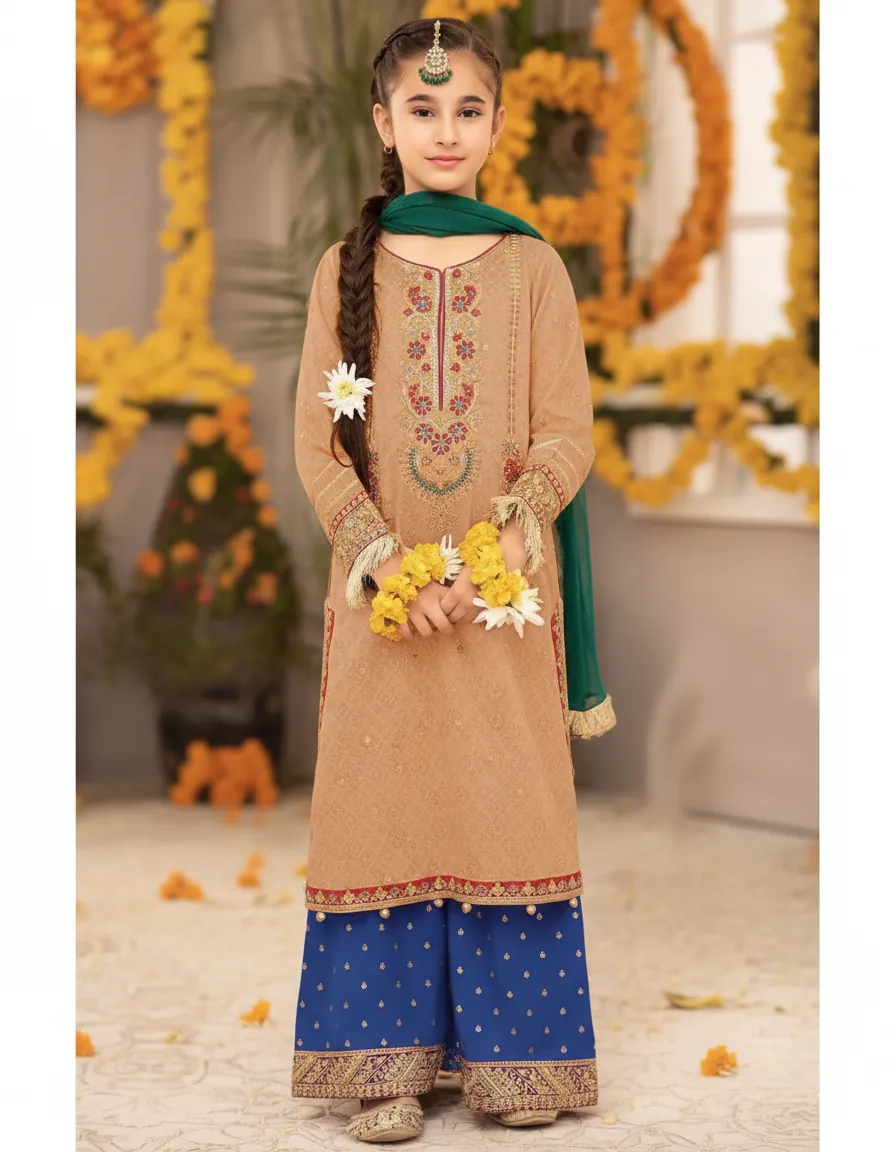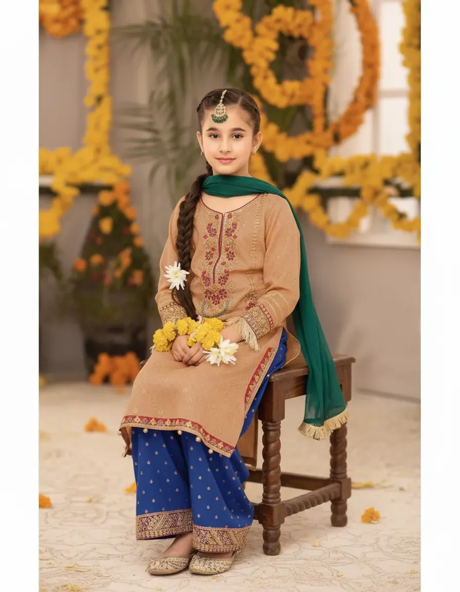 Add charm to your little one’s wardrobe with our Dhanak Kids 2PC Embroidered Suit, a premium quality outfit designed for grace and comfort. The soft beige tone is beautifully contrasted with royal blue embroidered trousers, complemented by delicate sequin and thread embroidery throughout. Intricate patches add a regal touch to this traditional ensemble, making it ideal for weddings, Eid, family functions, or festive celebrations.