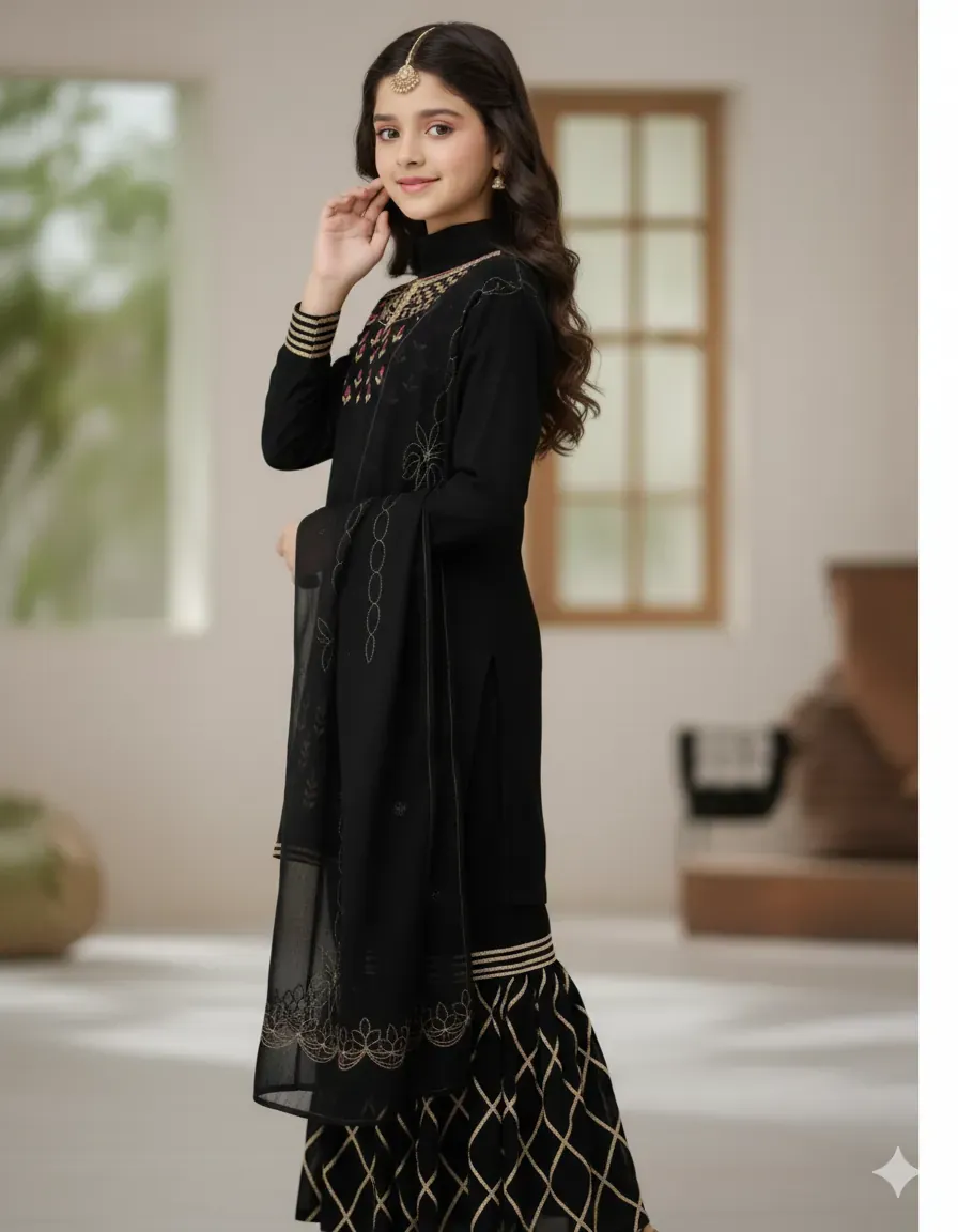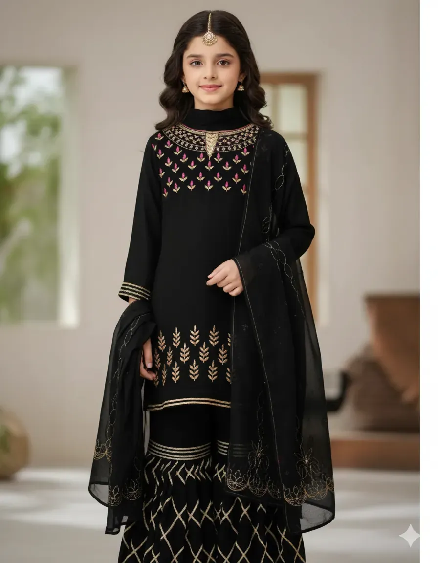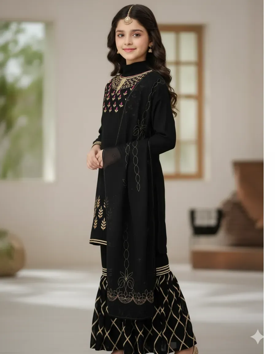 Elevate your child's festive wardrobe with the elegant Dhanak Kids Black 2PC Embroidered Suit, crafted from premium quality fabric perfect for winter occasions. This striking black outfit is adorned with intricate sequined embroidery on the front, sleeves, and trouser, creating a refined and graceful look.