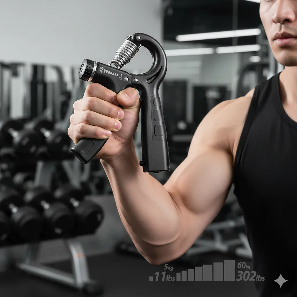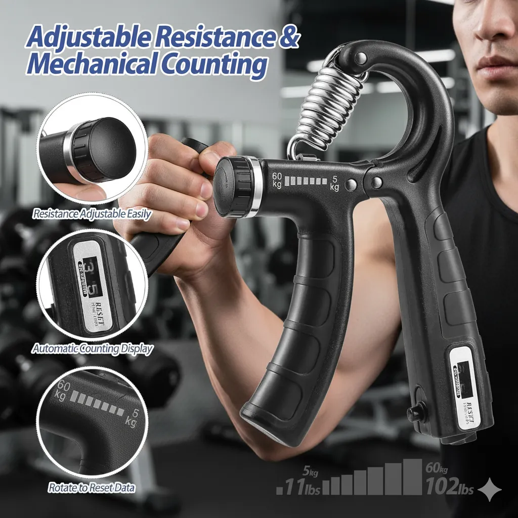 Digital Counting Grip Strengthener | Adjustable 5-60kg Forearm & Hand Exerciser.The Automatic Counting Hand Gripper is the ultimate fitness tool designed to boost your grip strength and track your progress with precision. Whether you’re an athlete, a musician, or simply seeking to improve the strength in your forearms and fingers, this device is your perfect training partner.The standout feature is the Intelligent Mechanical Counter, which automatically records every repetition and displays it clearly on the LCD screen. You no longer need to keep count yourself—just focus on your workout and watch your results grow. The counter can be easily reset at any time with a simple twist of the knob.Achieve personalized training with the adjustable resistance feature. You can effortlessly change the resistance range from 5 kg all the way up to 60 kg (11 to 132 lbs). This wide range makes the gripper suitable for users of all levels, from beginners undergoing rehabilitation to advanced users building serious muscle.