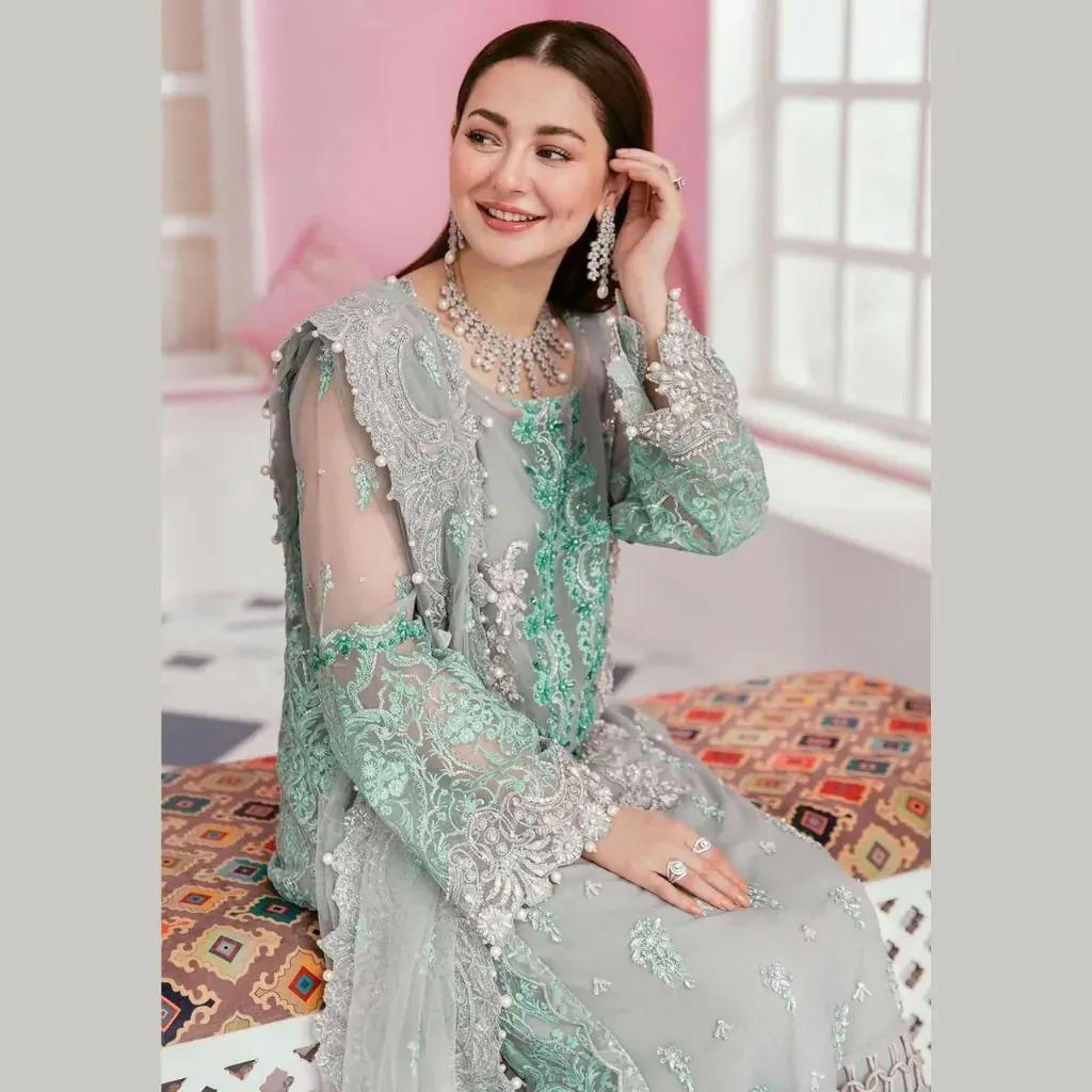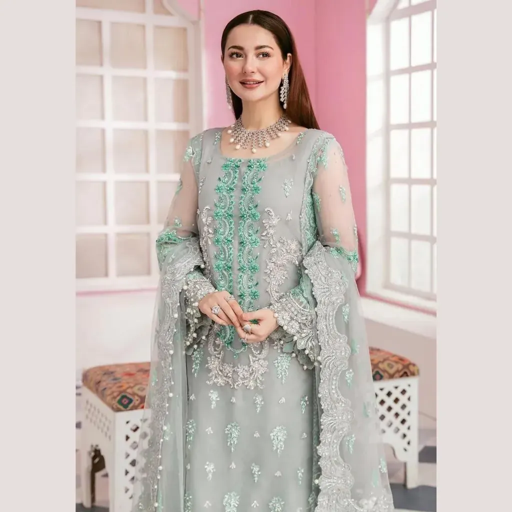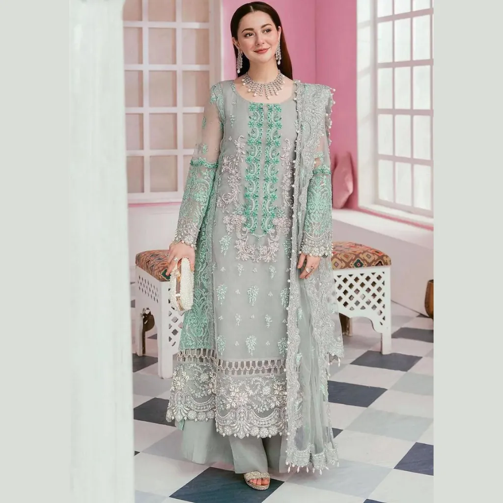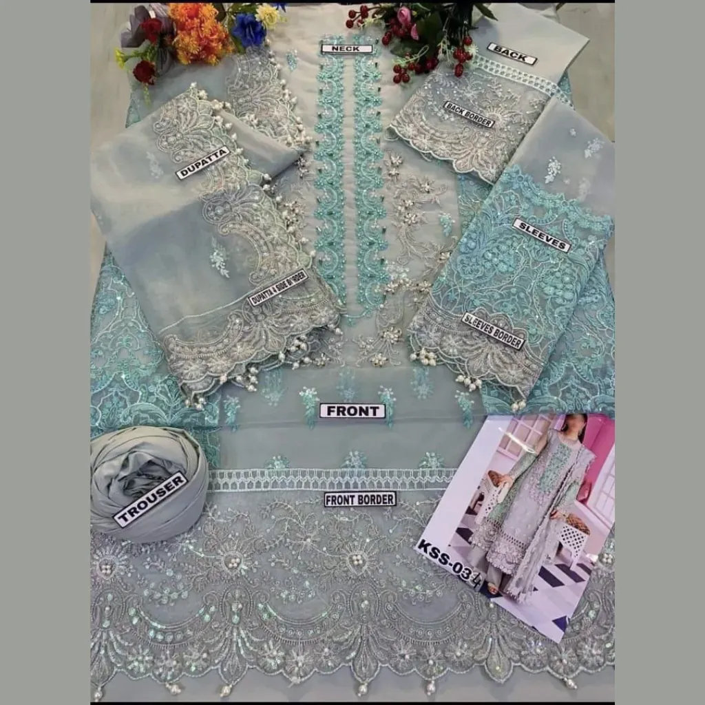 Elevate your festive wardrobe with the timeless charm of ELAF’s Luxury Organza Embroidered 3PC Suit. This designer piece is an exquisite blend of traditional craftsmanship and modern flair. The organza front is adorned with intricate embroidery, shimmering sequence, and hand-placed stones, while the neckline features detailed adda and stone work that adds a regal touch. The back boasts elegant cutwork embroidery on sheer organza, and the sleeves are beautifully designed with embroidery and delicate pearl embellishments.