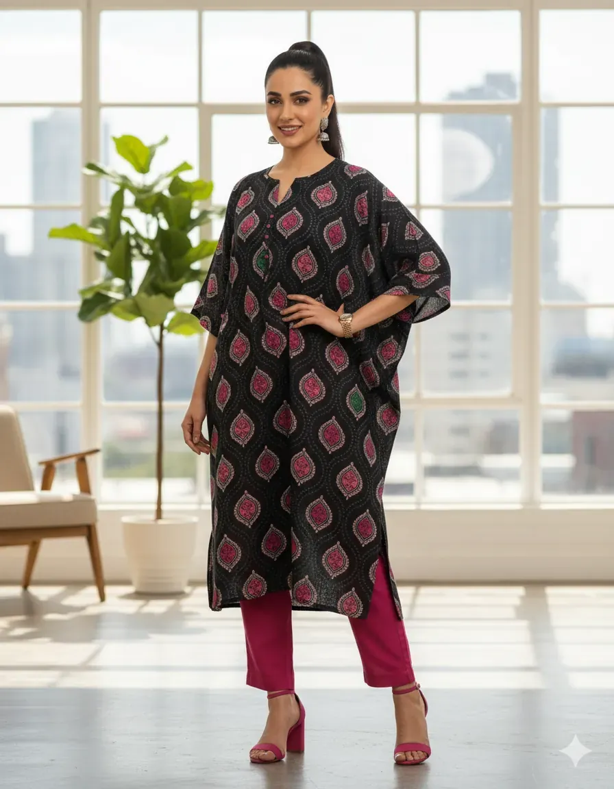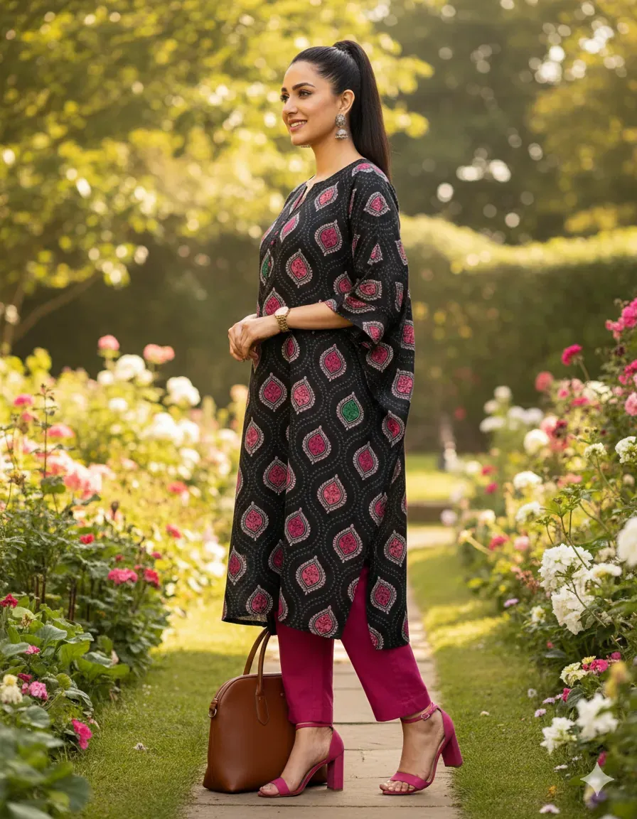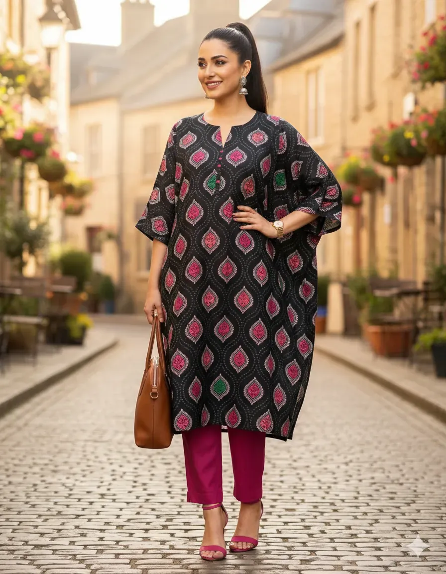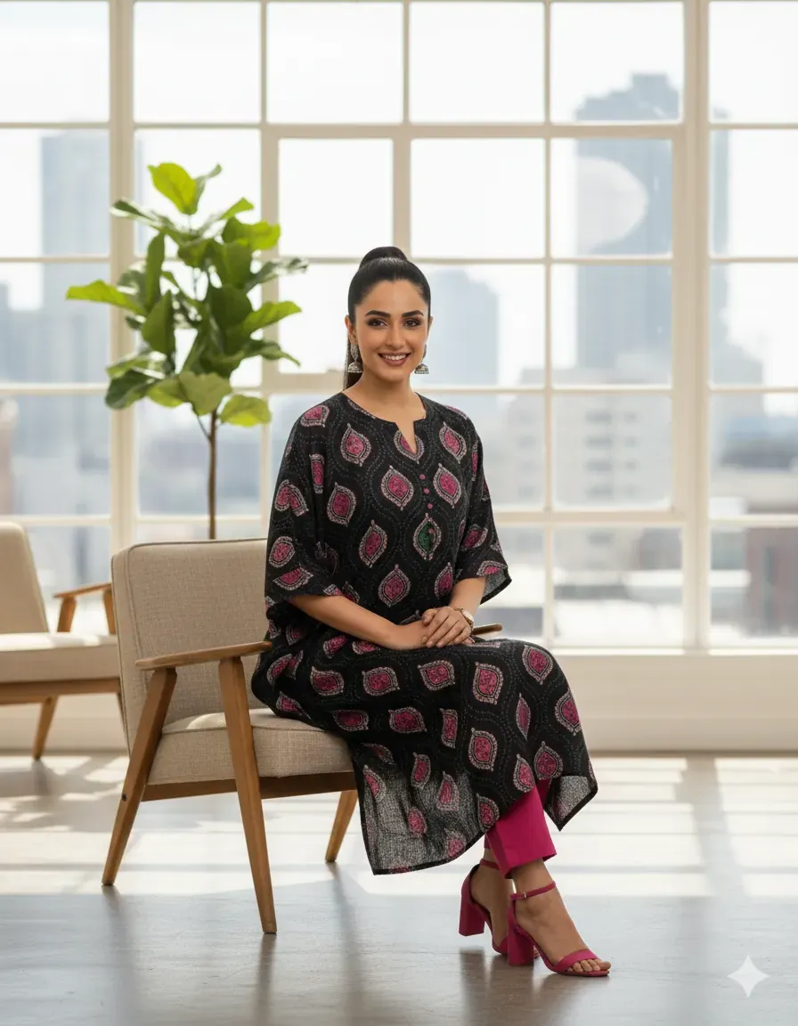 Discover the perfect blend of style and comfort with our elegant 2-piece women's linen suit. This stunning set features a sophisticated black printed shirt adorned with an intricate pink and green paisley design, complemented by a subtle dotted pattern. The shirt is crafted from premium, breathable linen fabric, ensuring maximum comfort throughout the day. Paired with solid pink linen trousers, this ensemble offers a chic and cohesive look suitable for various occasions, from casual outings to everyday wear. The natural breathability of linen makes it an ideal choice for warmer climates, providing both elegance and practicality. Elevate your wardrobe with this versatile and fashionable linen suit, designed to make you stand out with effortless grace."