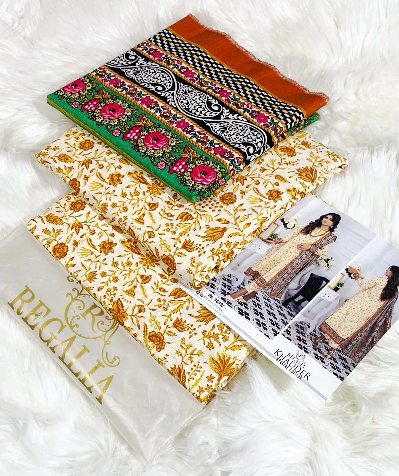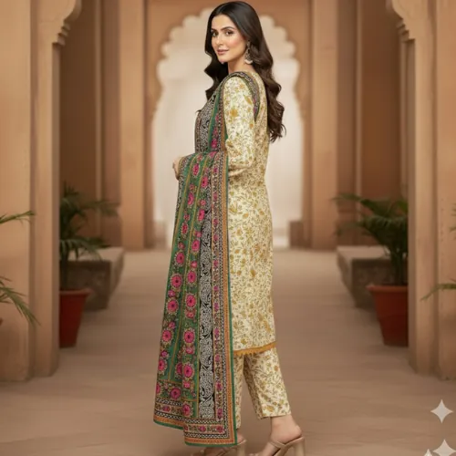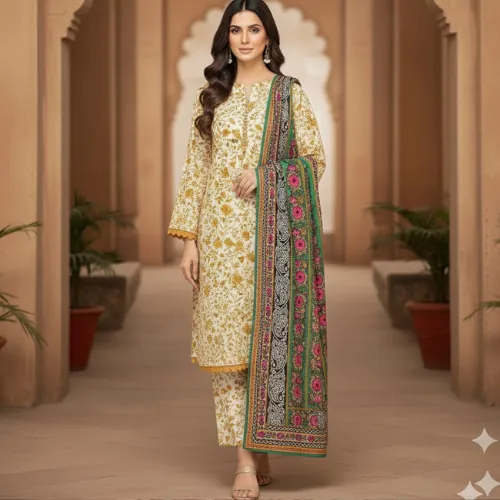 Elegant 3-Piece Stitched Printed Khaddar Suit in Off-White with Contrast Green Dupatta. Embrace classic sophistication with this beautifully crafted 3-piece ready-to-wear Khaddar suit. The outfit is designed on a serene off-white base, adorned with a delicate all-over floral print in a cheerful yellow hue. The kameez is tailored to perfection with subtle lace detailing on the sleeves and hem, adding a touch of refined elegance.