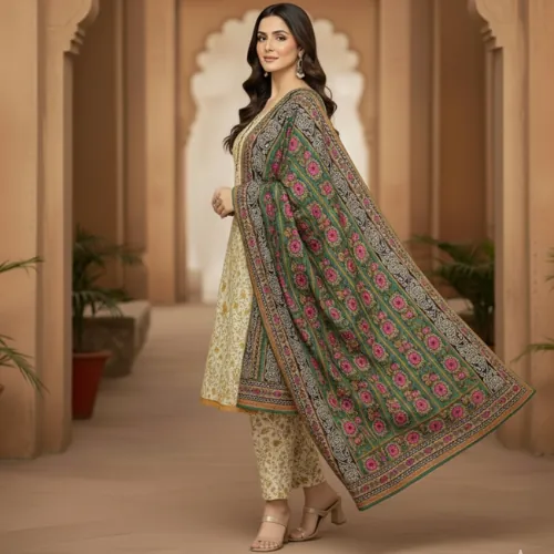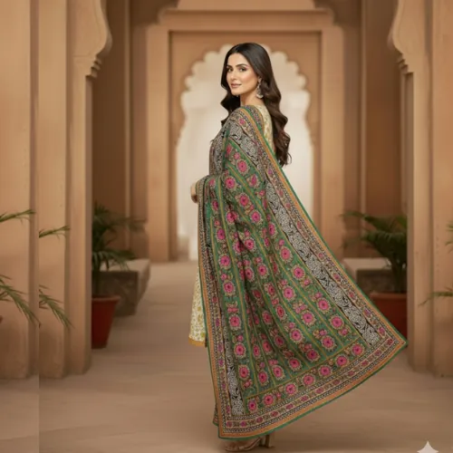 The ensemble includes a matching printed trouser, creating a harmonious and graceful silhouette. The true centerpiece of this attire is its show-stopping dupatta. It features a rich, vibrant green border that frames an intricate multi-colored paisley and floral design in shades of pink, yellow, and black. This beautiful contrast makes the outfit pop, ensuring you stand out. Made from high-quality Khaddar, it's the ideal choice for staying warm and stylish throughout the cool days and evenings of the Pakistani winter.