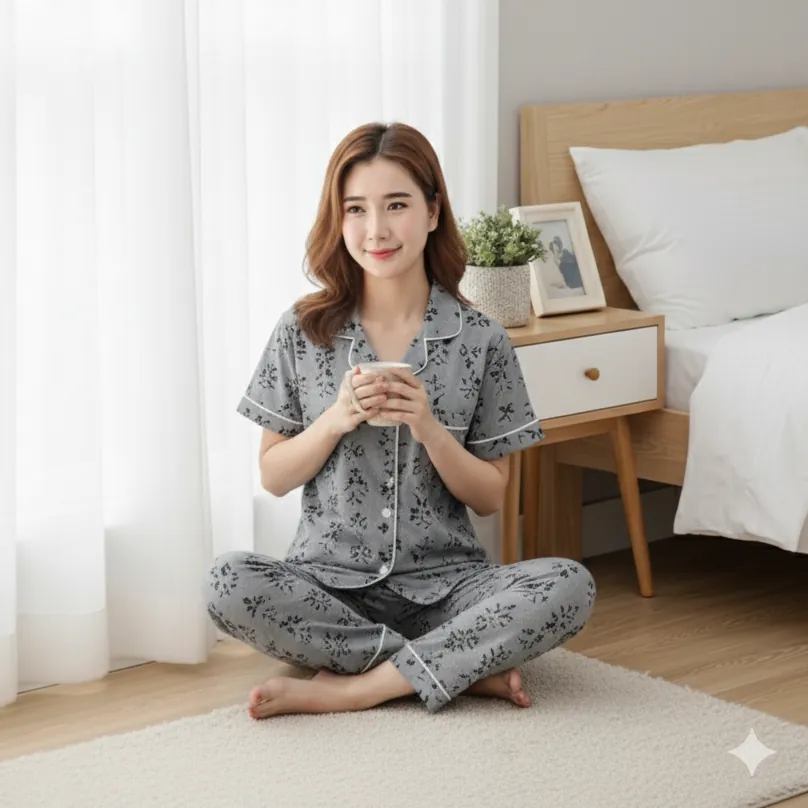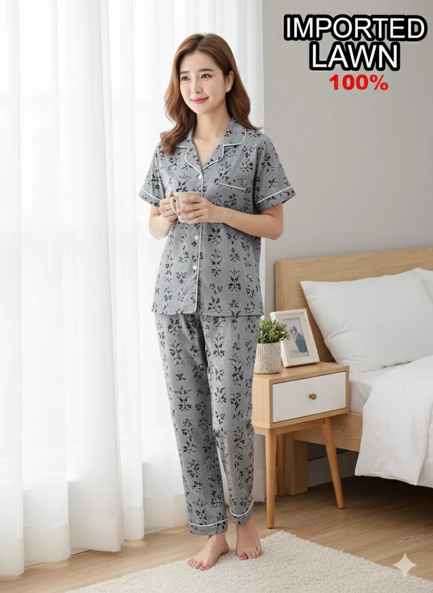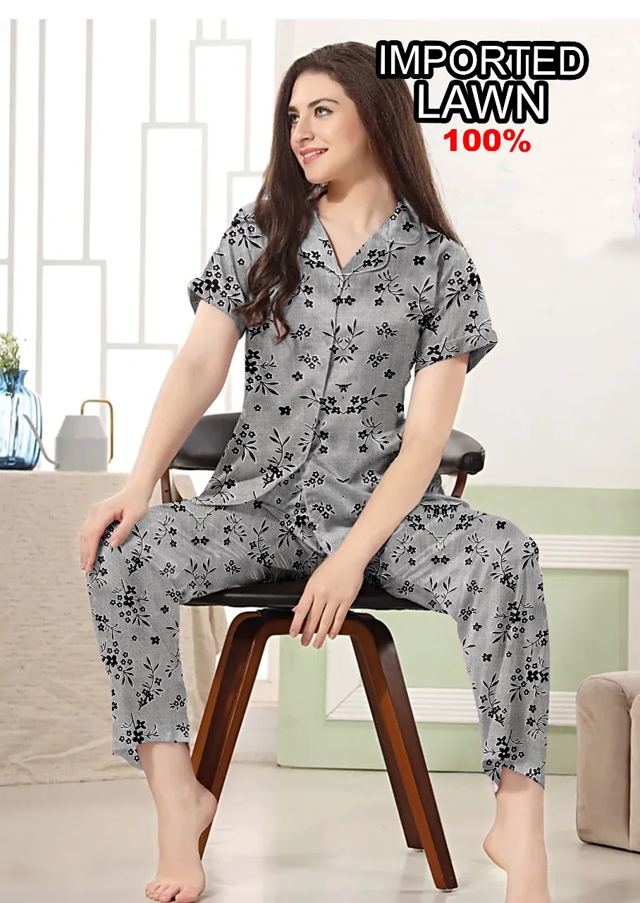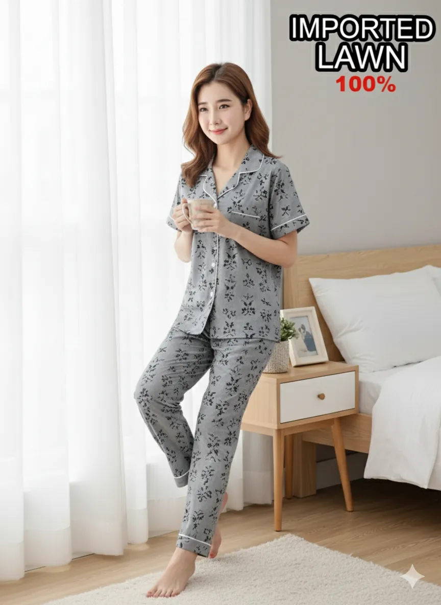 Bring timeless elegance to your nightwear collection with this beautiful 2-piece women’s night suit in a classic grey base with black floral print. Made from 100% imported lawn fabric, this night suit is incredibly soft, breathable, and ideal for keeping you cool and comfortable during warmer nights.