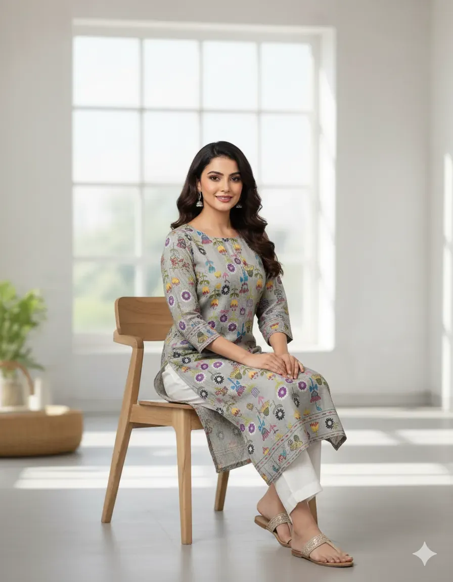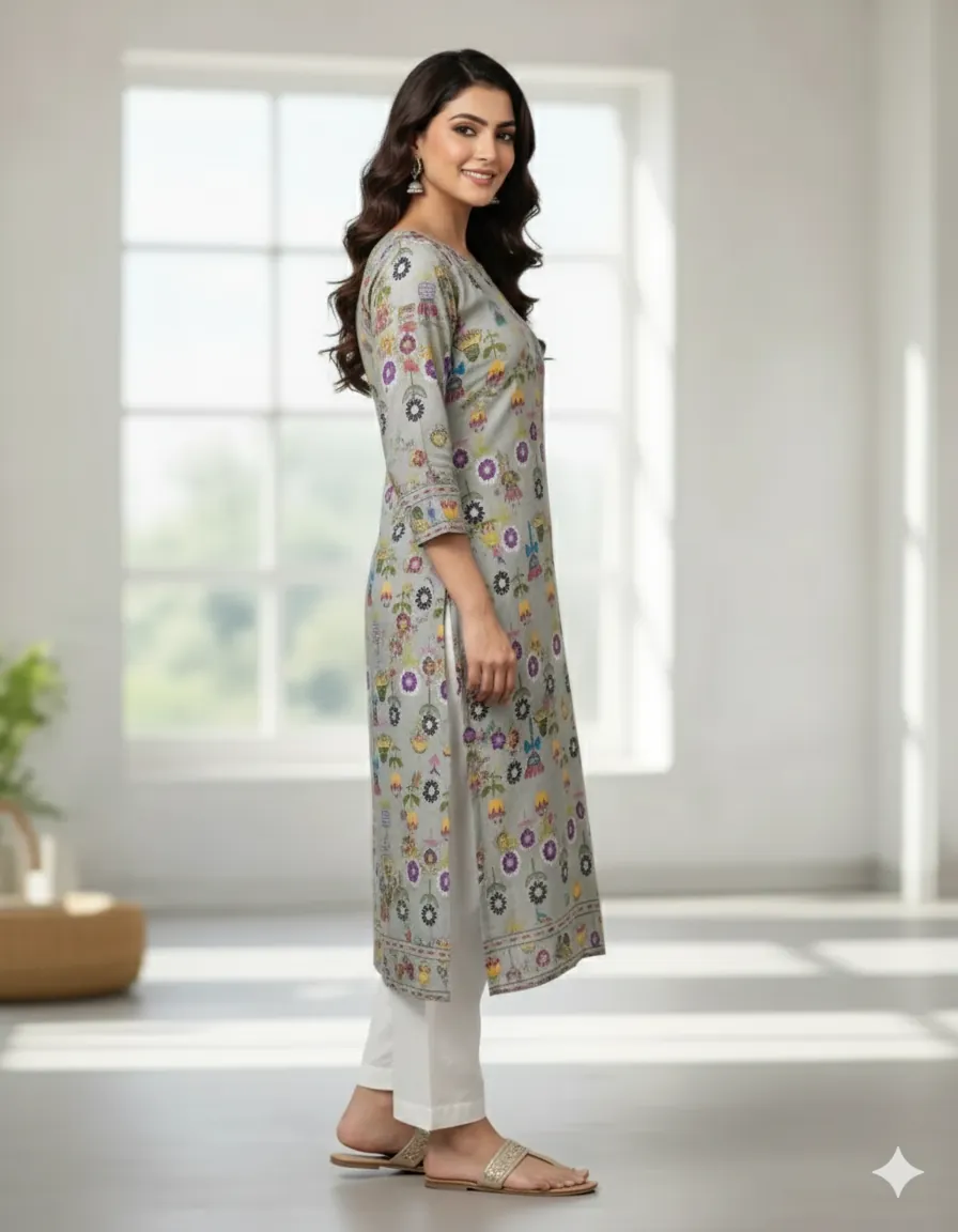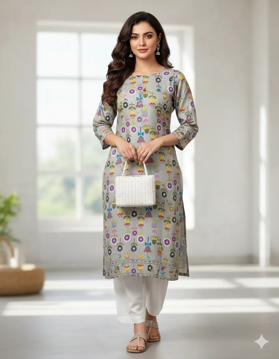 Elegant Grey Floral Print 2-Piece Linen Suit for Women | Unstitched Digital Shirt & Plain Trouser