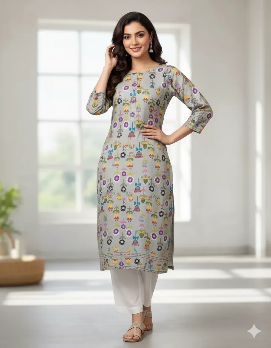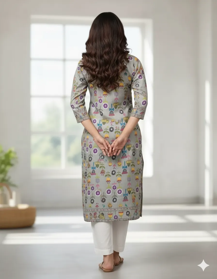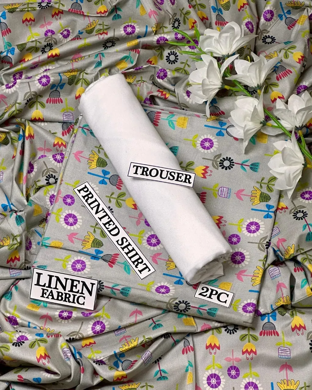 Discover understated elegance with this beautiful 2-piece unstitched linen suit. The set includes a digitally printed linen shirt adorned with a delightful floral pattern, showcasing stylized flowers in shades of purple, yellow, and pink, along with green leaves and black accents, all set against a sophisticated grey background. This serene and artistic design is perfectly complemented by a plain, solid white linen trouser, creating a balanced and graceful ensemble. Made from high-quality, breathable linen fabric, this suit is an excellent choice for everyday wear, casual outings, or daytime events. Tailor it to your perfect fit for a customized and comfortable outfit that exudes subtle charm.\