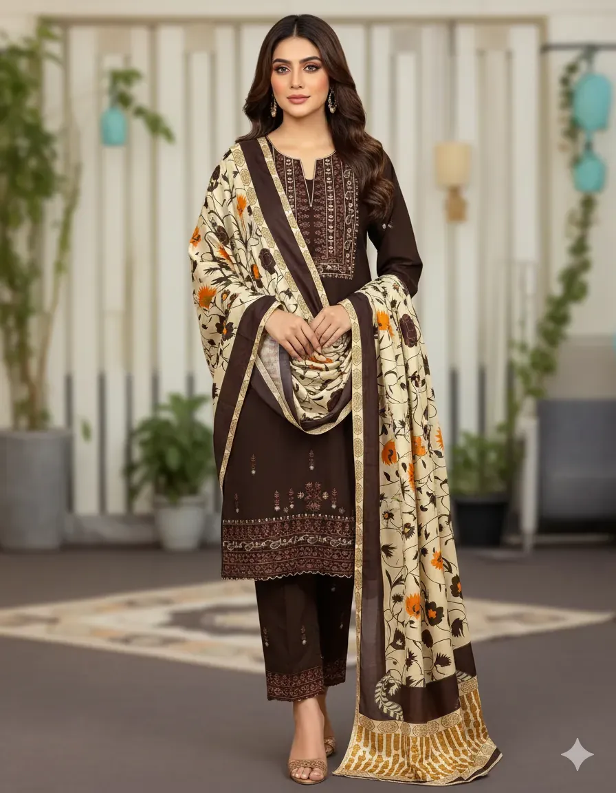 Step out in sophisticated style with this unstitched 3-piece Dhanak suit, designed for the modern woman who appreciates traditional elegance. The rich brown Dhanak fabric offers a luxurious feel and a comfortable drape. This ensemble features an exquisitely embroidered neck patch, adding a focal point to the shirt. The sleeves are also beautifully embroidered, complementing the overall design. What sets this suit apart is the intricately embroidered trouser, which adds an extra layer of detail and charm. Completing the look is a stunning digital printed pashmina shawl, boasting a vibrant pattern that provides a perfect contrast and artistic flair. This unstitched suit allows for a personalized fit, making it an ideal choice for festive occasions, formal gatherings, or elegant everyday wear.