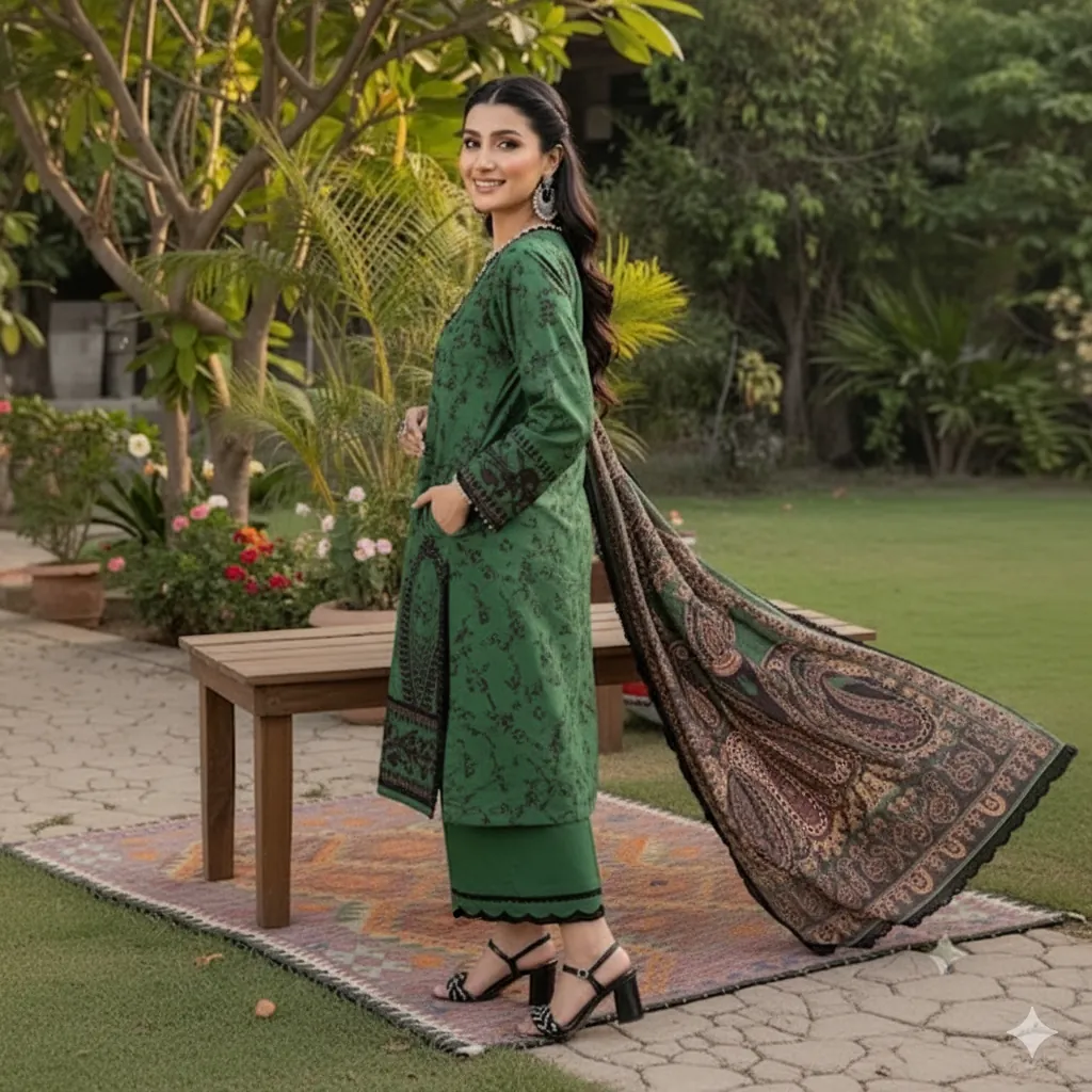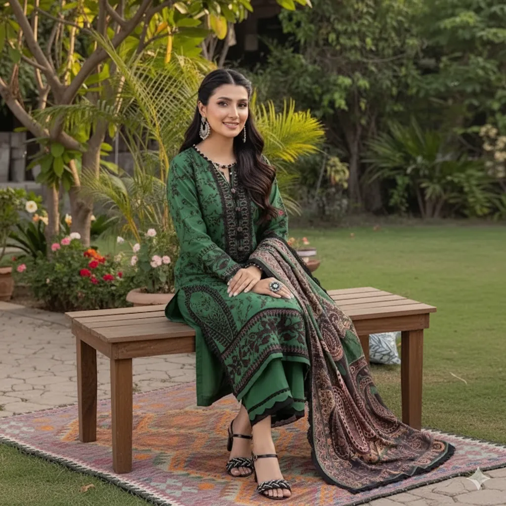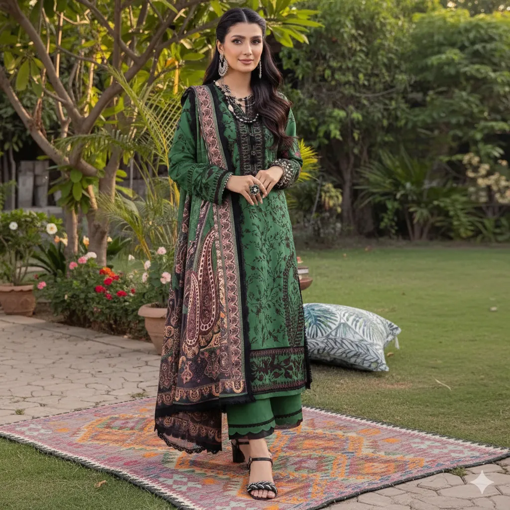 Emaan Fabric Unstitched 3-Piece Teal Embroidered Lawn Suit with Printed Dupatta - Summer Collection.Discover timeless elegance with the Emaan Fabric Teal Embroidered Lawn Suit. This unstitched three-piece ensemble is crafted from high-quality lawn fabric, ensuring comfort and breathability. The shirt showcases exquisite floral embroidery on the front and includes separate embroidered patches for the neckline, sleeves, and daman. The suit is complemented by a rich, multi-colored printed dupatta featuring traditional paisley and geometric motifs. Paired with a solid-colored trouser, this versatile suit is ideal for creating a chic and sophisticated look for any event, from festive gatherings to semi-formal occasions.