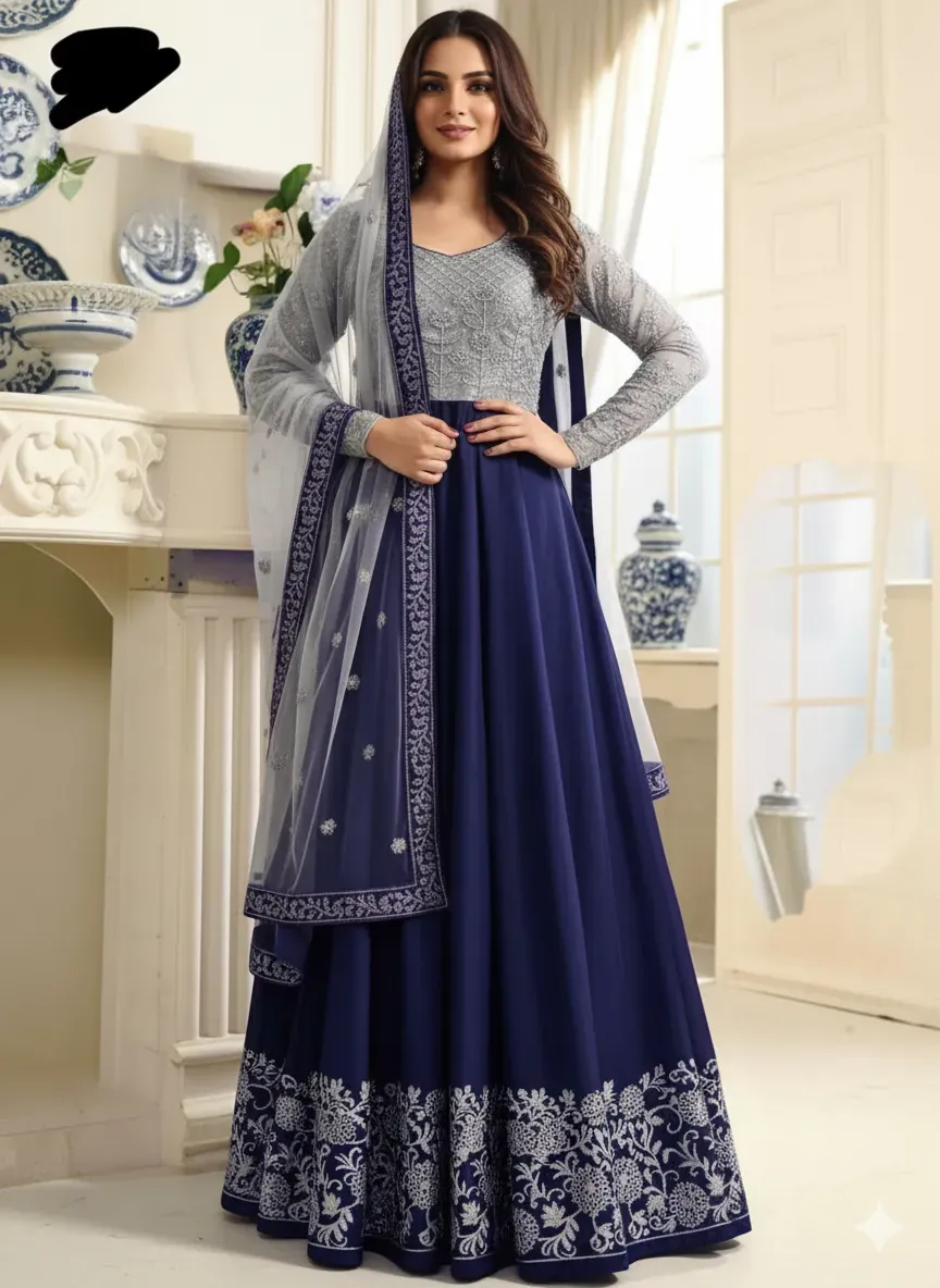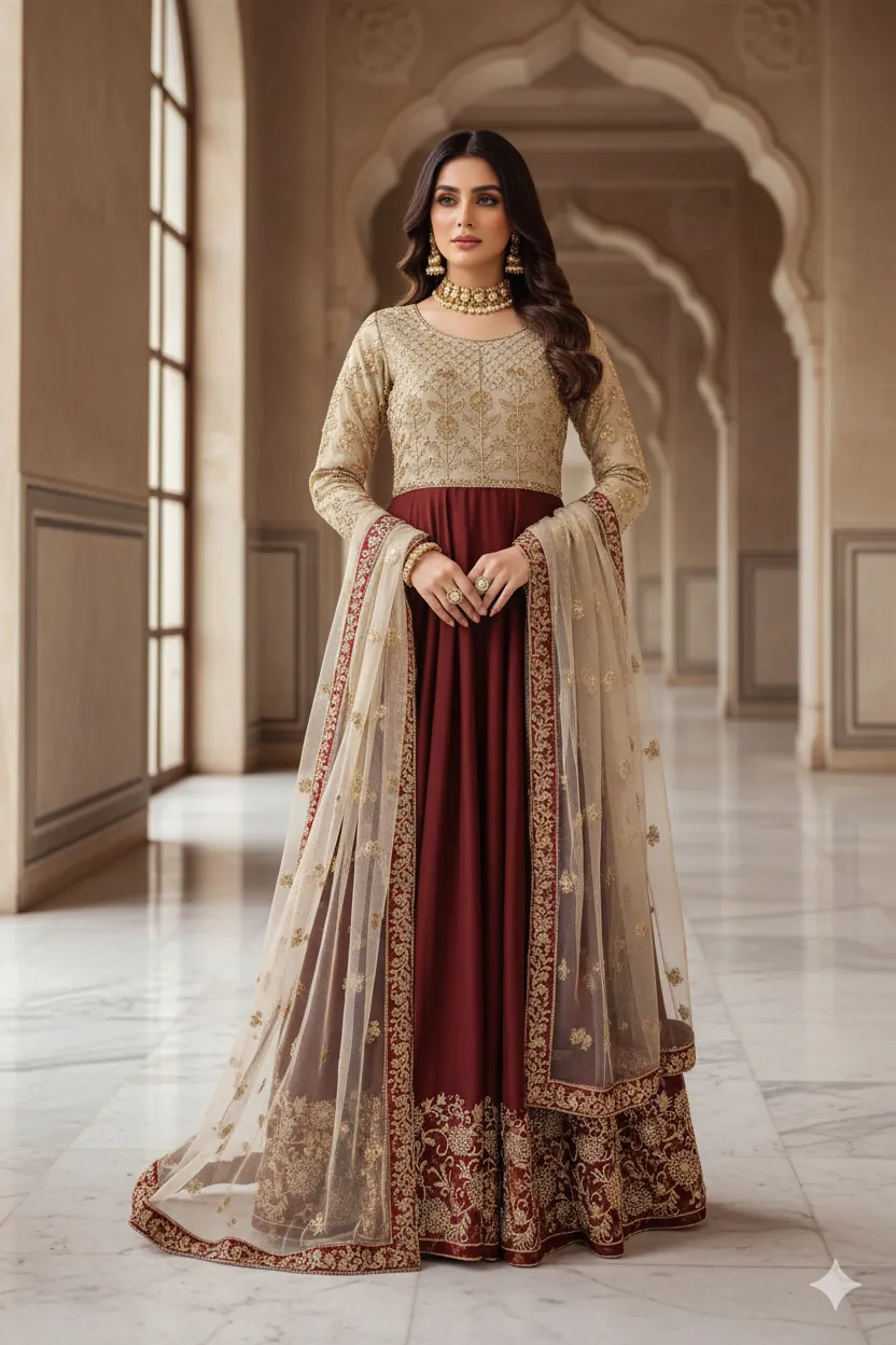 Flowing Elegance: The maxi's lower part, or ghera, is made from premium chiffon that drapes beautifully. It boasts an impressive total width of 95 inches, creating a majestic, flowing silhouette as you walk. The ghera is adorned with a wide, intricate embroidery border on both the front and back, adding weight and grace to the hemline.