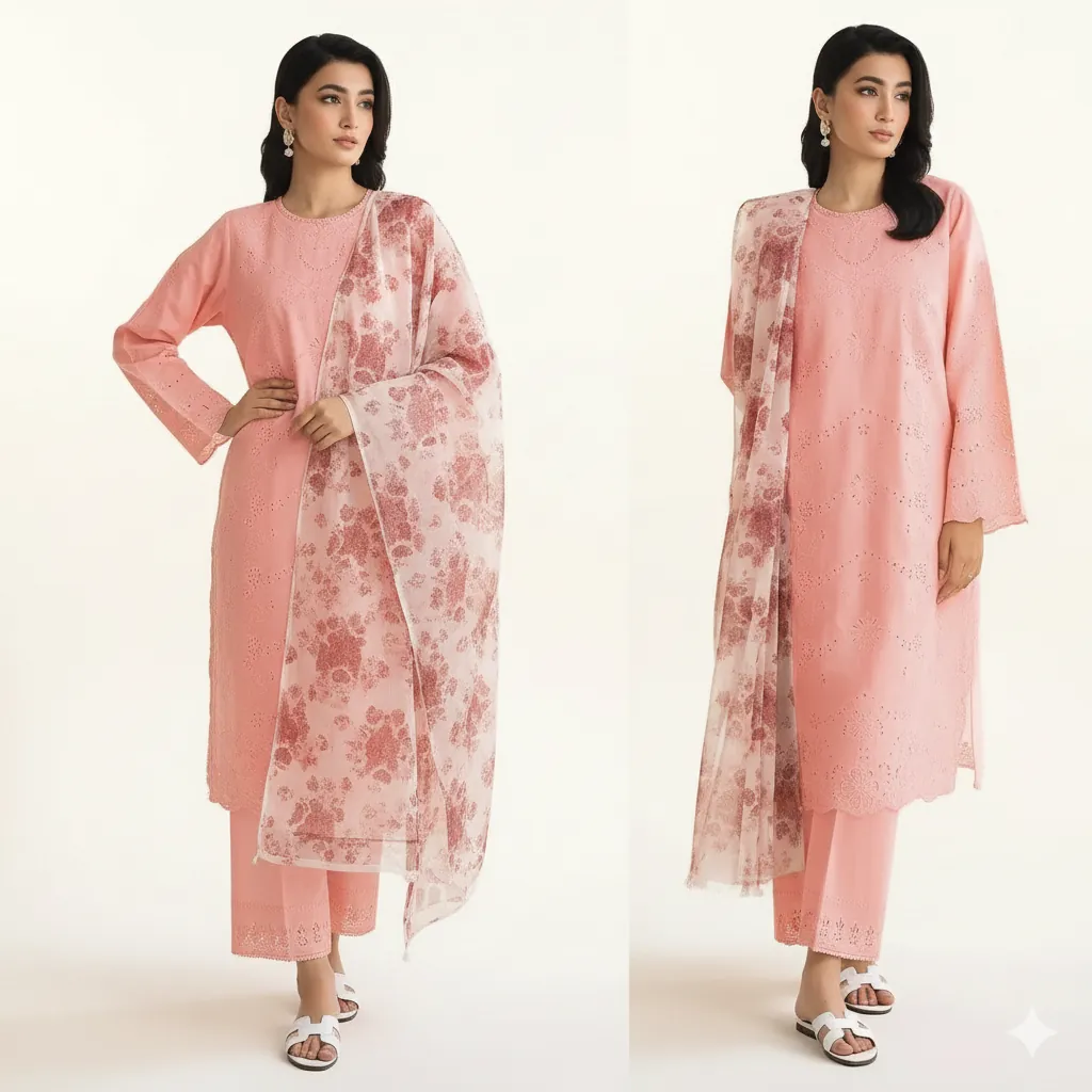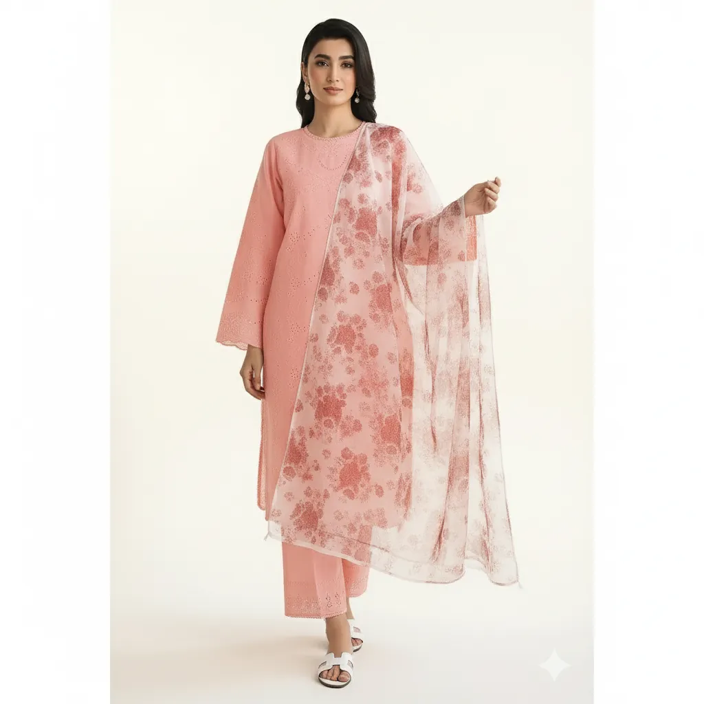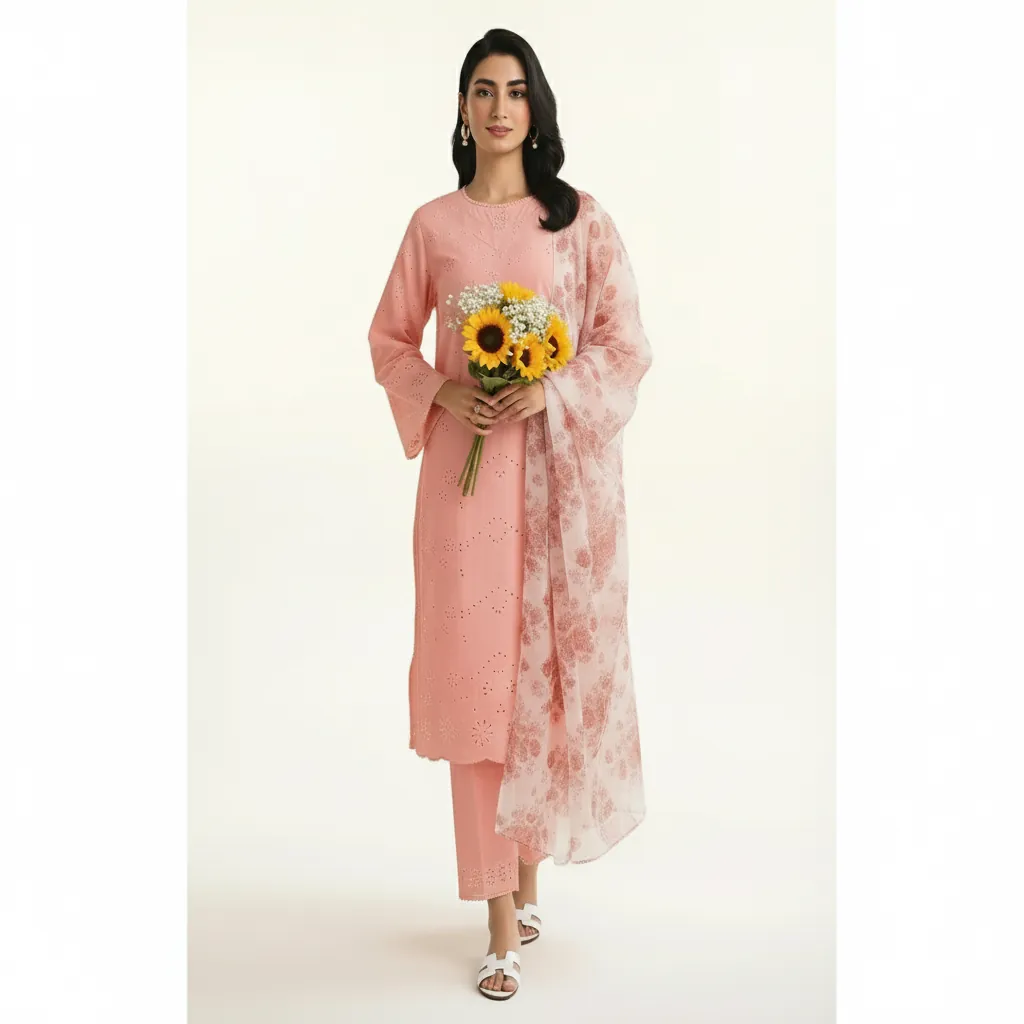 Embroidered Chikankari Lawn Suit | Peach 3-Piece Unstitched | Floral Printed Chiffon Dupatta. Step out in style with this exquisite 3-piece unstitched lawn suit, a perfect blend of traditional craftsmanship and modern design. The shirt is crafted from high-quality lawn fabric in a soft and feminine peach hue, featuring stunning full embroidery and classic chikankari work on the front panel. The back of the shirt is also embroidered, ensuring a cohesive and premium look from every angle.