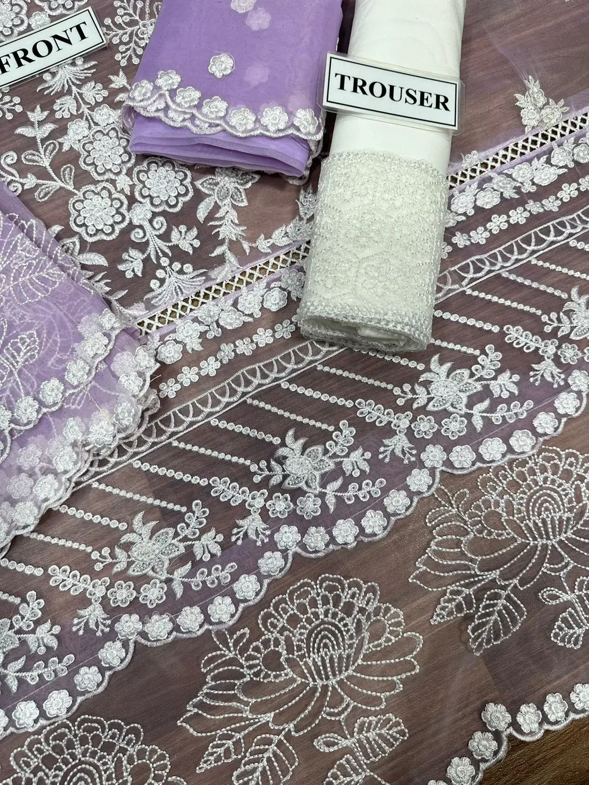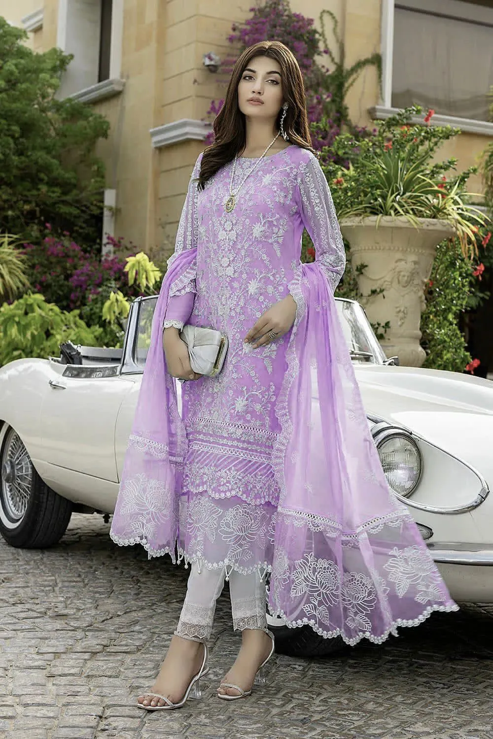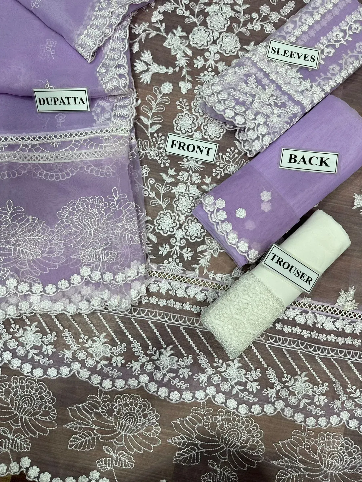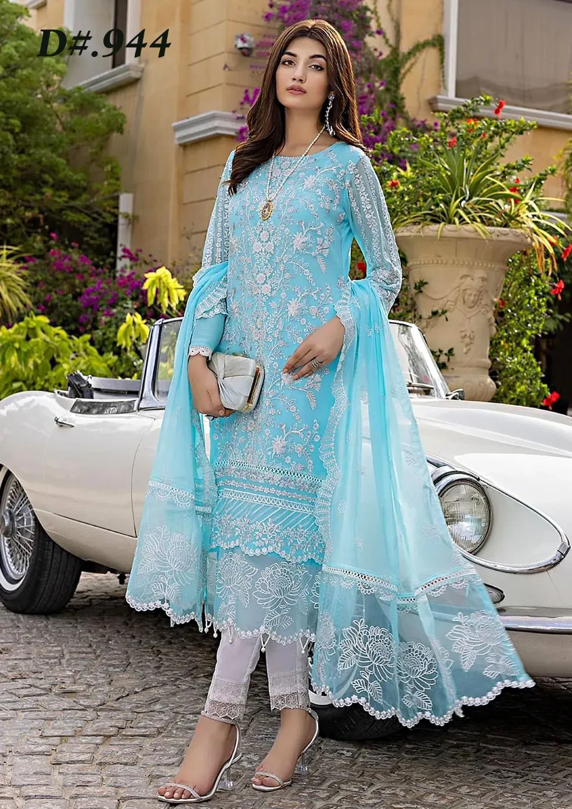 Discover timeless elegance with our Azure Organza Embroidered Suit, a master replica that captures the intricate details and luxurious feel of the original design. This exquisite 3-piece suit features a fully heavy embroidered organza front, meticulously adorned with floral and geometric patterns that create a stunning visual appeal. The front is further enhanced by heavy embroidered front borders with a delicate cutwork lace, adding a touch of sophisticated craftsmanship. The ensemble is completed with a coordinating organza back and fully heavy embroidered organza sleeves that include stylish cuffs. The bottom consists of a comfortable malai fabric trouser with matching heavy embroidered bunches, ensuring a perfect and cohesive look. Whether for a formal event or a special occasion, this suit is designed to make you stand out.