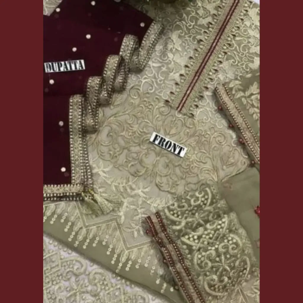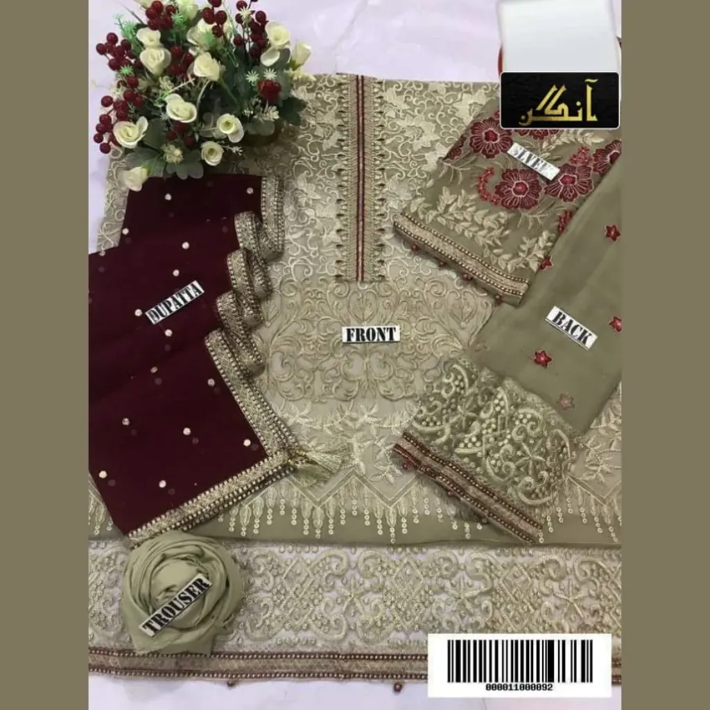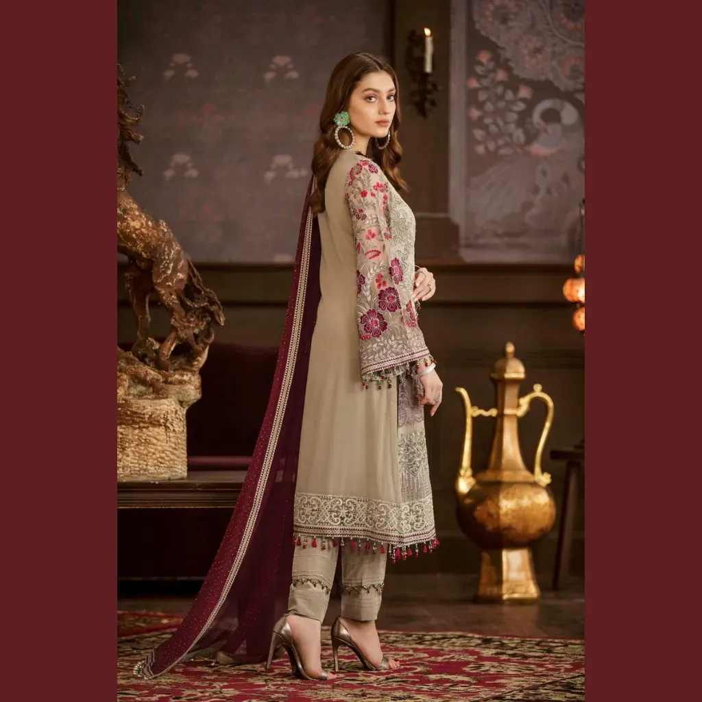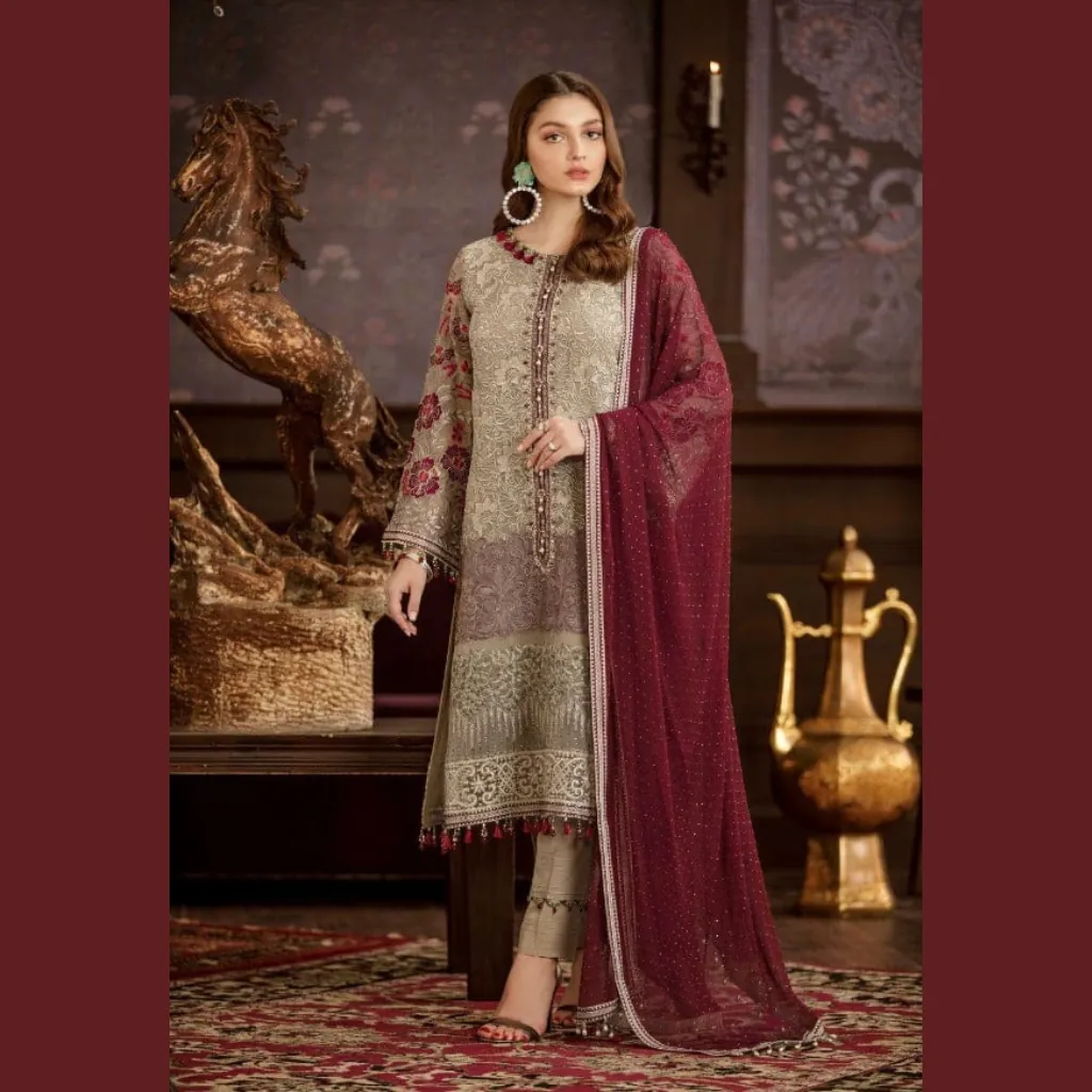The soft malai plain trouser adds comfort and balance, while the ready-to-wear chiffon embroidered dupatta completes the look with sheer sophistication. Perfect for weddings, receptions, parties, and festive occasions, this Flossie luxury suit blends modern trends with traditional elegance, ensuring a standout appearance wherever you go.