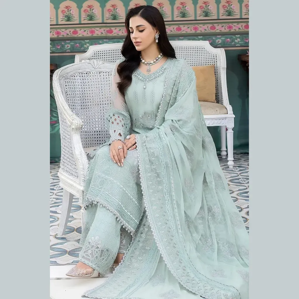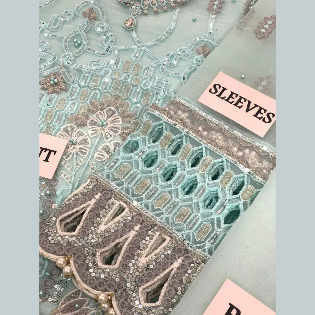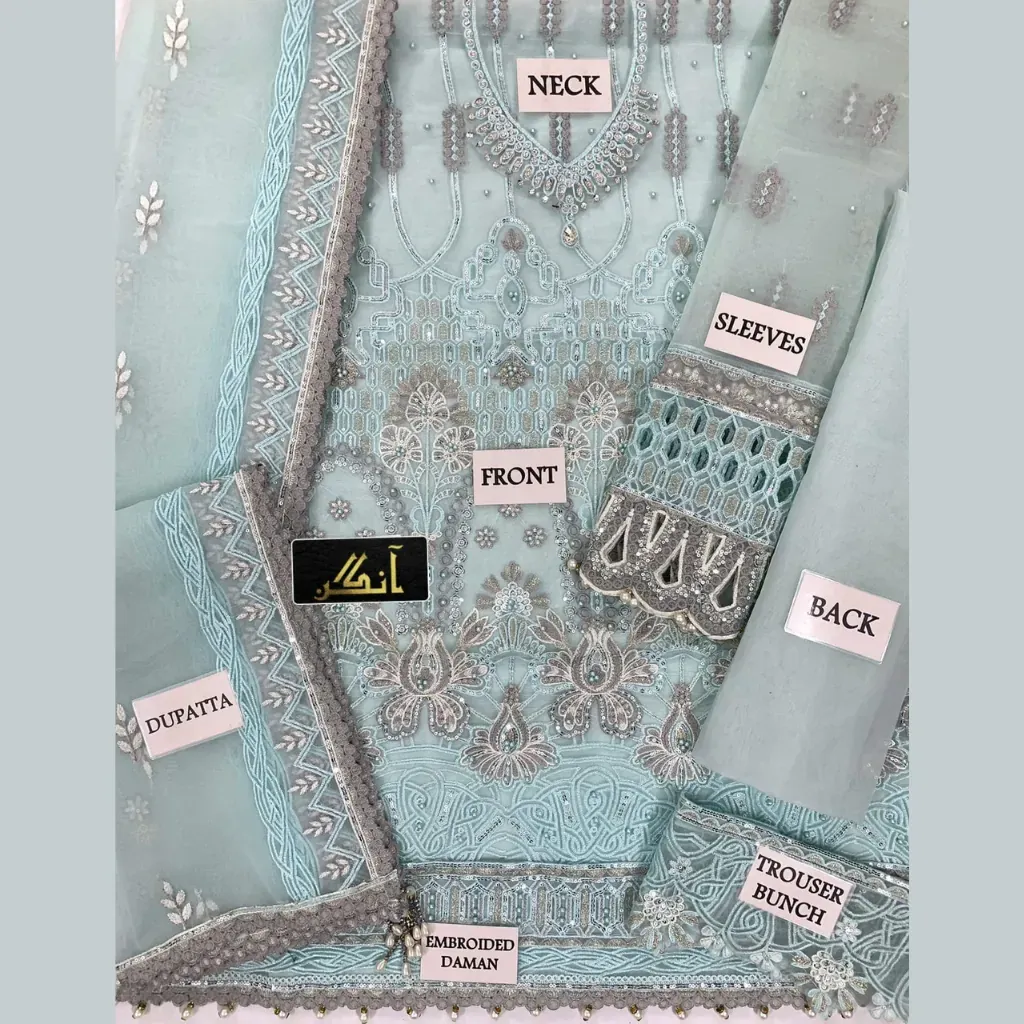 The neckline is highlighted with an embroidered handwork patch, giving the suit a refined touch of craftsmanship. The sleeves are made of embroidered organza, finished with cutwork embroidered cuffs for extra elegance. The back is kept plain organza for a graceful balance.