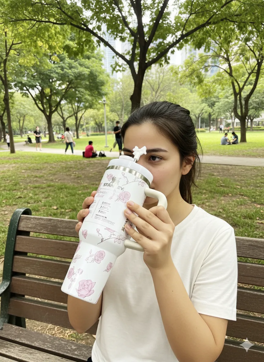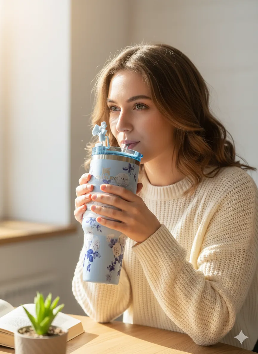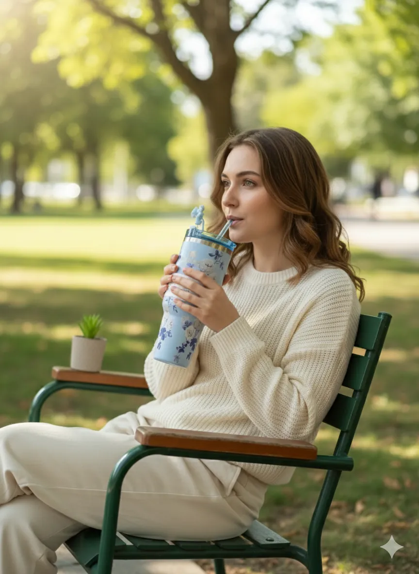 The elegant floral print adds a touch of sophistication, making it a fashionable accessory for any occasion—whether you're at the office, the gym, or on a road trip. The ergonomic handle ensures a comfortable and secure grip, while the innovative lid design accommodates a durable steel straw with a special stopper to prevent spills and leaks.