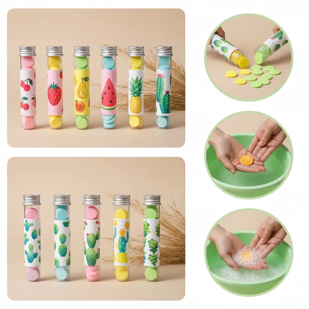 Each tube contains mini fragrant soap sheets shaped like delicate petals — simply take one sheet, add a little water, and wash your hands instantly.
