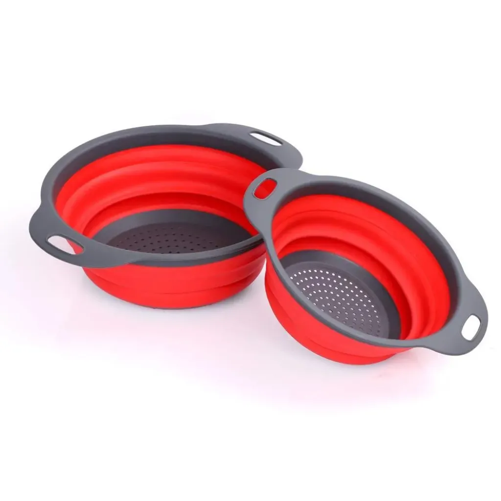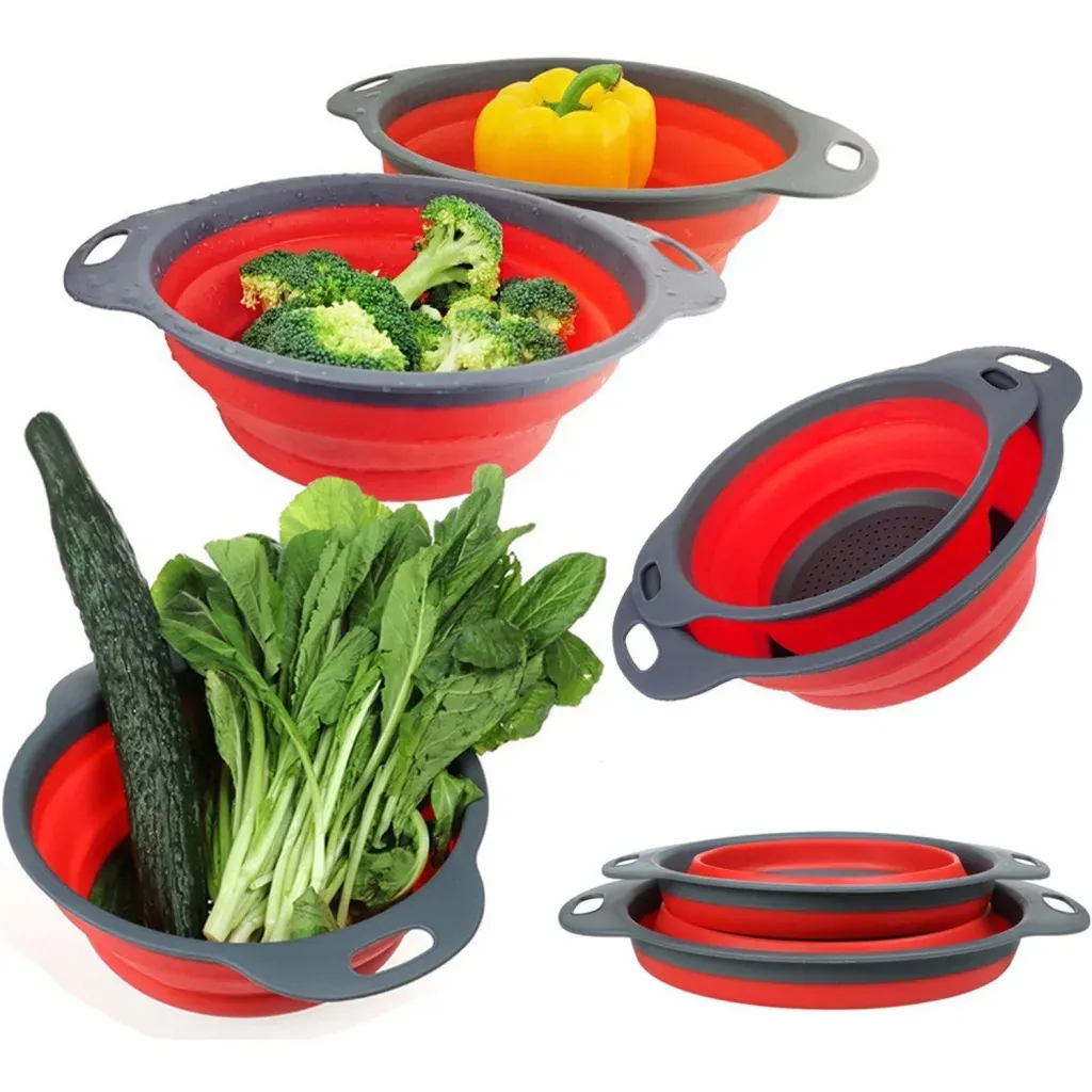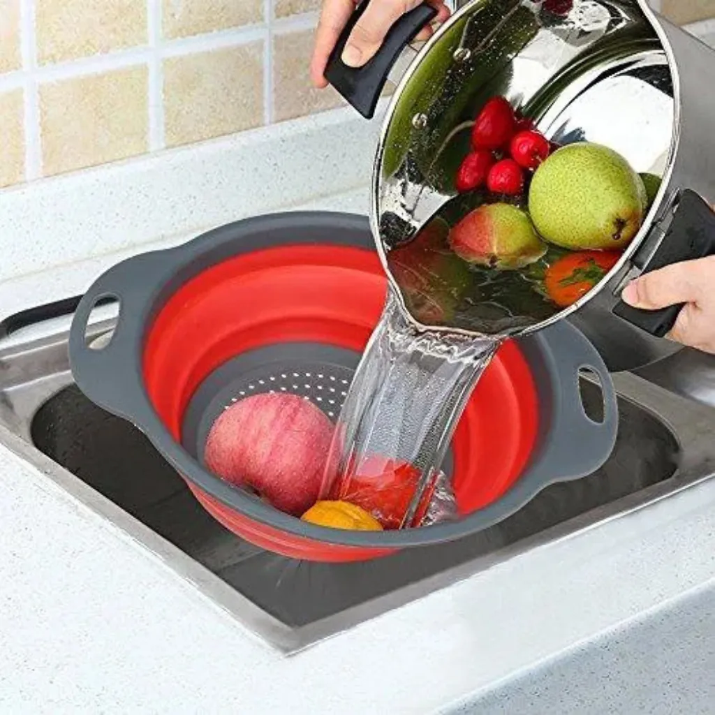 Yeh Foldable Silicone Drain Basket high-quality food-grade silicone se bana hai jo flexible aur durable hai. Foldable design kitchen me space save karta hai, aur sturdy plastic base aur handle stability aur easy handling provide karte hain.