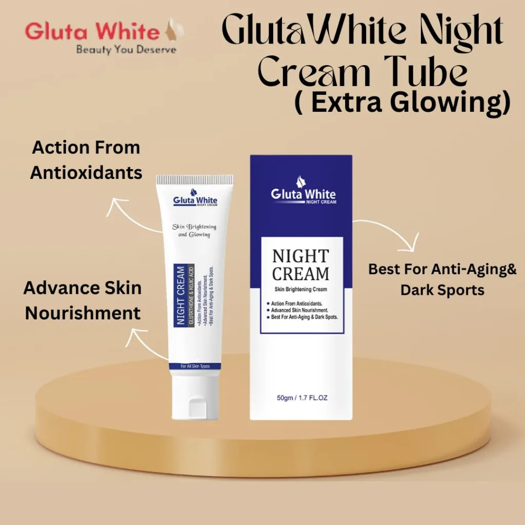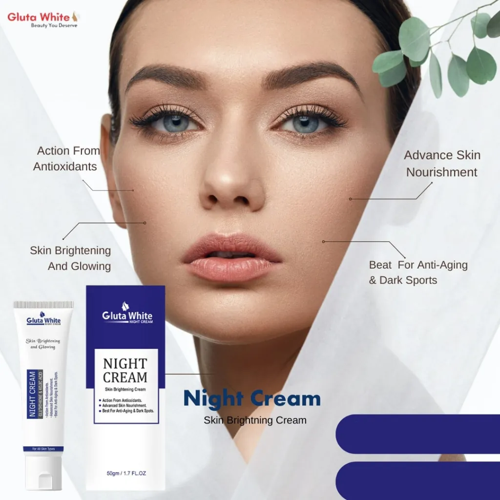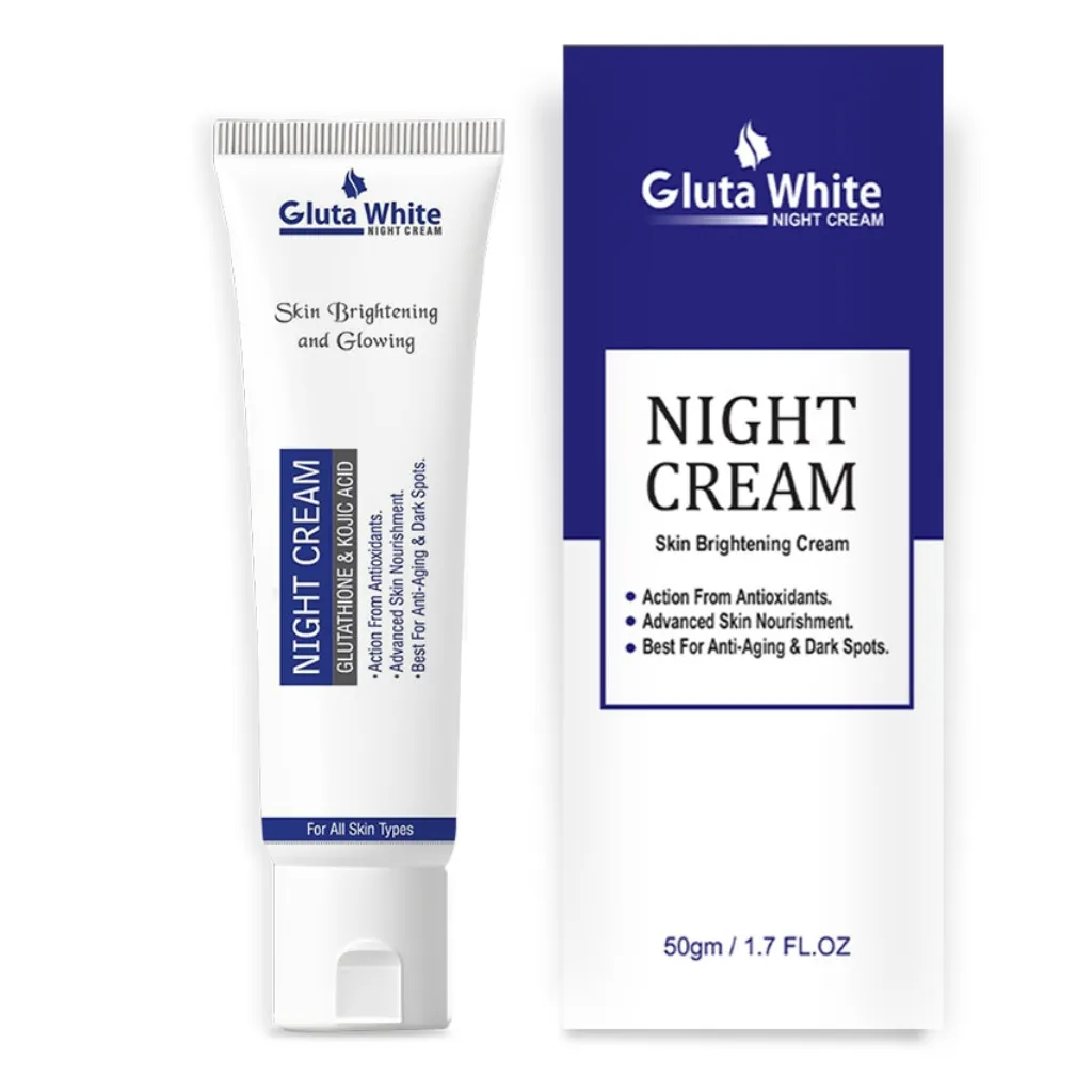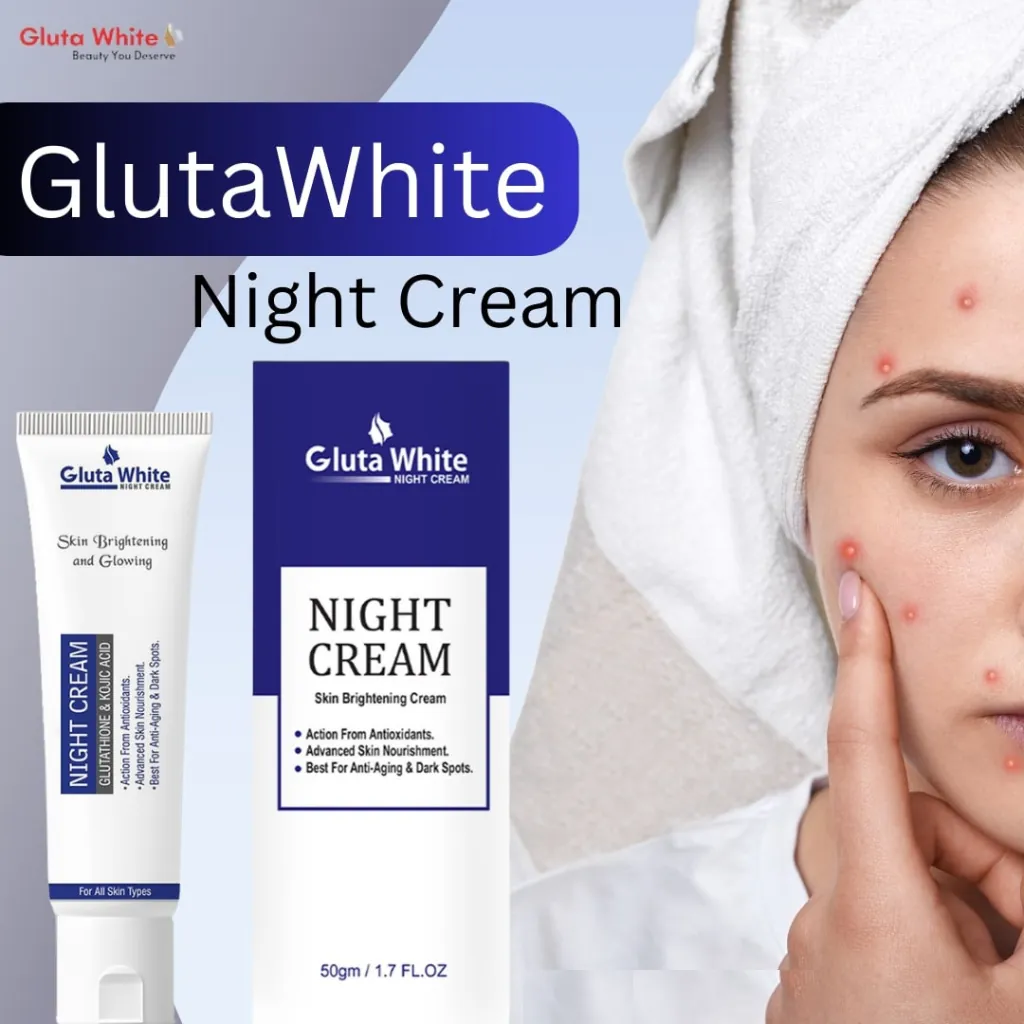 Get radiant and youthful skin overnight with Gluta White Night Cream, enriched with Glutathione and Kojic Acid.