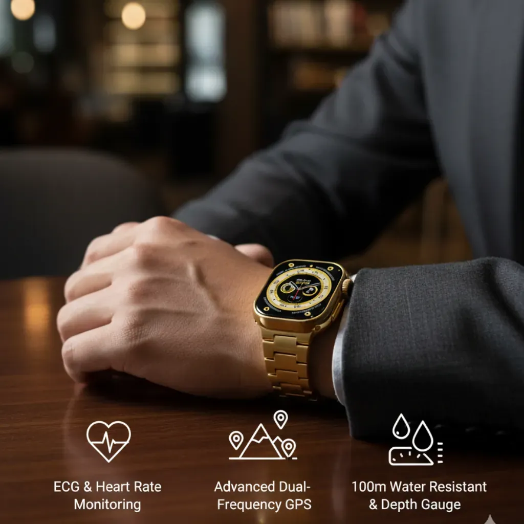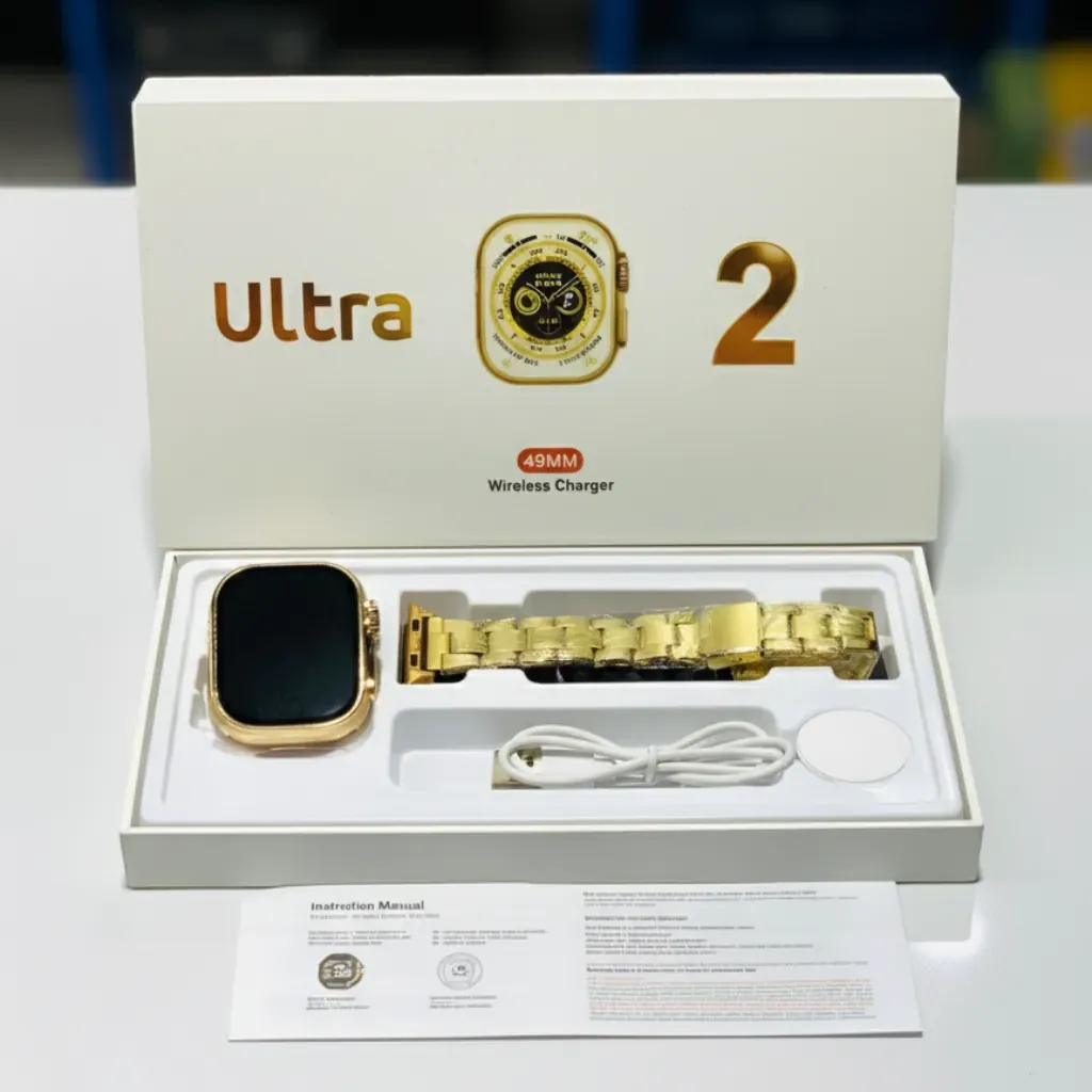 Step up your style with the Ultra 2 Style Smartwatch, featuring a striking 49mm case in a brilliant gold metal color. This smartwatch offers the aesthetic of a premium wearable at an accessible price point, perfect for daily use and fashion-forward individuals.Stay connected and track your fitness with its comprehensive suite of features, all powered by a long-lasting battery designed to keep up with your busiest days.