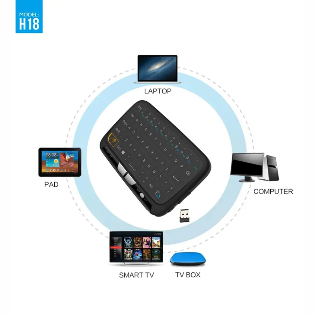 The H18+ 2.4GHz Wireless Keyboard with Full Touchpad and Backlight is a modern, all-in-one wireless controller designed for effortless navigation, typing, and media control. Compact yet powerful, this innovative keyboard combines a smooth touch-sensitive surface with a responsive keyboard layout, making it ideal for Smart TVs, Android TV boxes, laptops, PCs, tablets, and projectors.