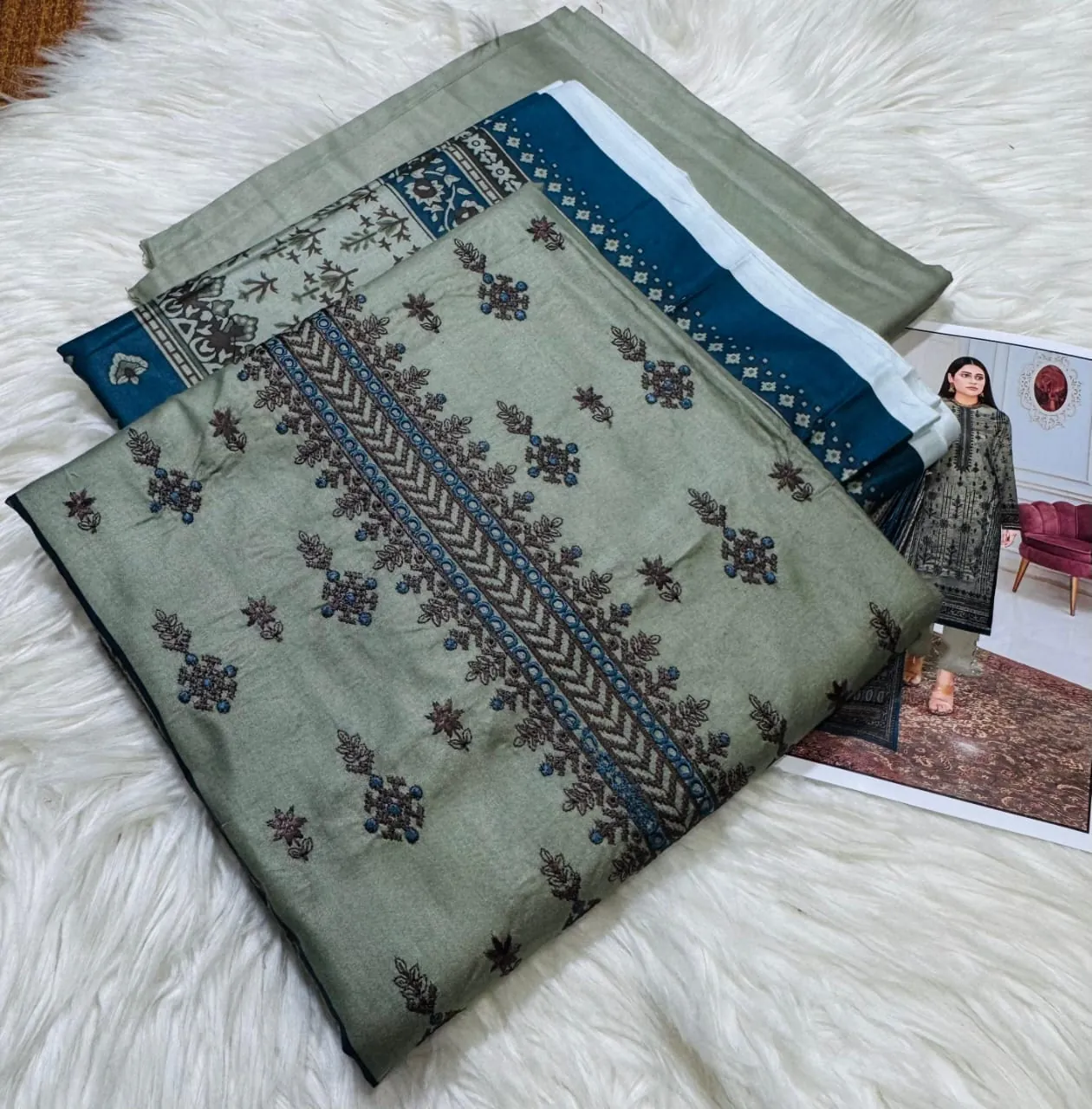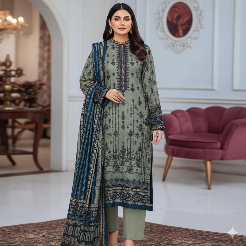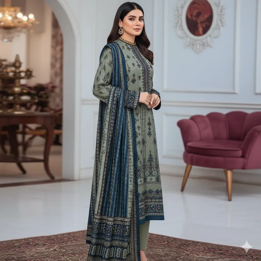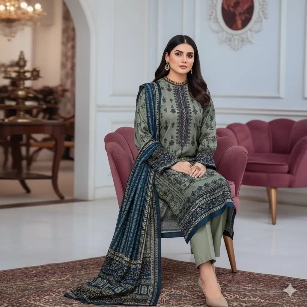 The set includes a digitally printed linen dupatta that adds a rich contrast to the muted yet classy base tones. The plain/printed trouser complements the overall outfit, providing both comfort and style for winter gatherings or everyday wear.