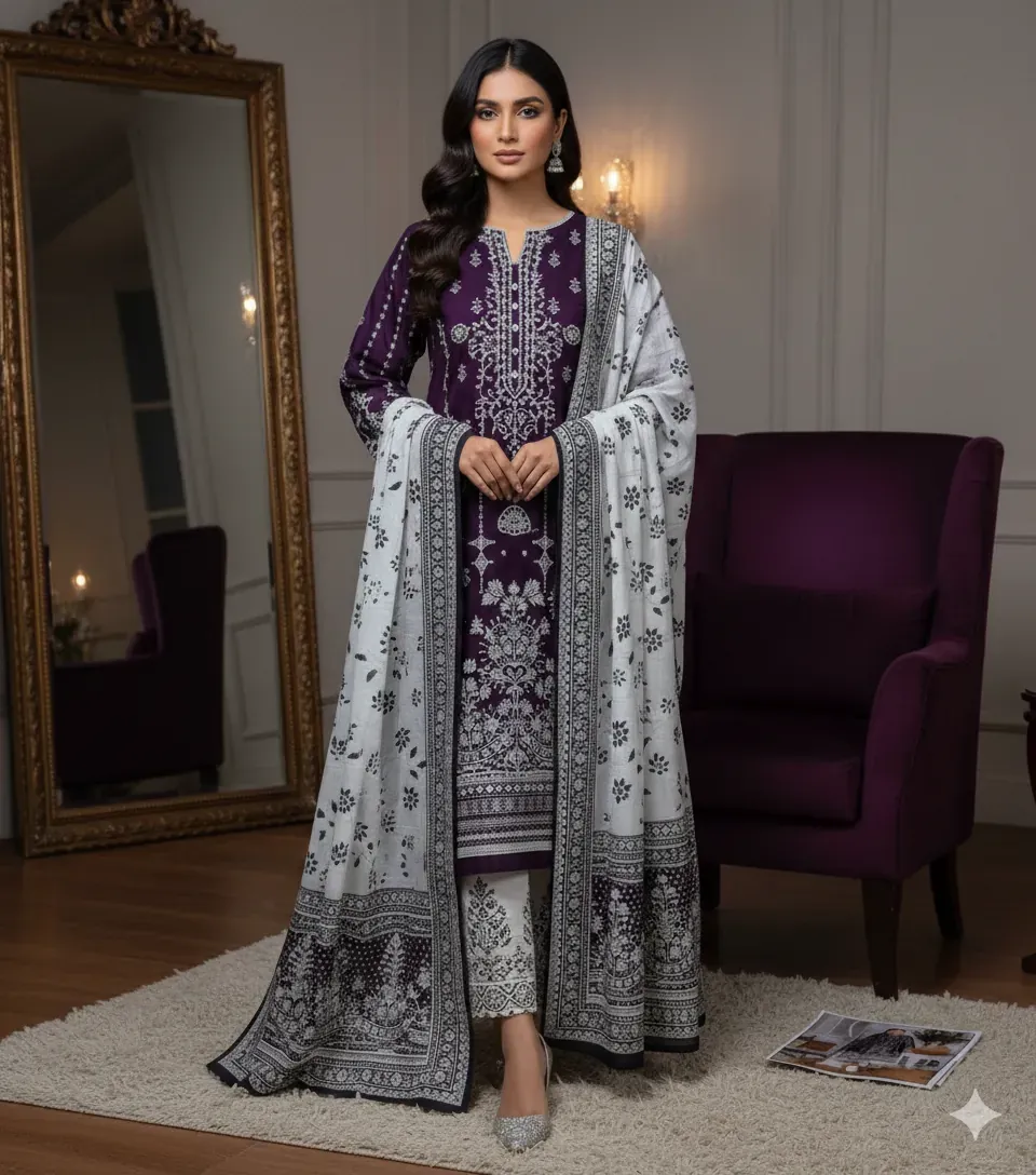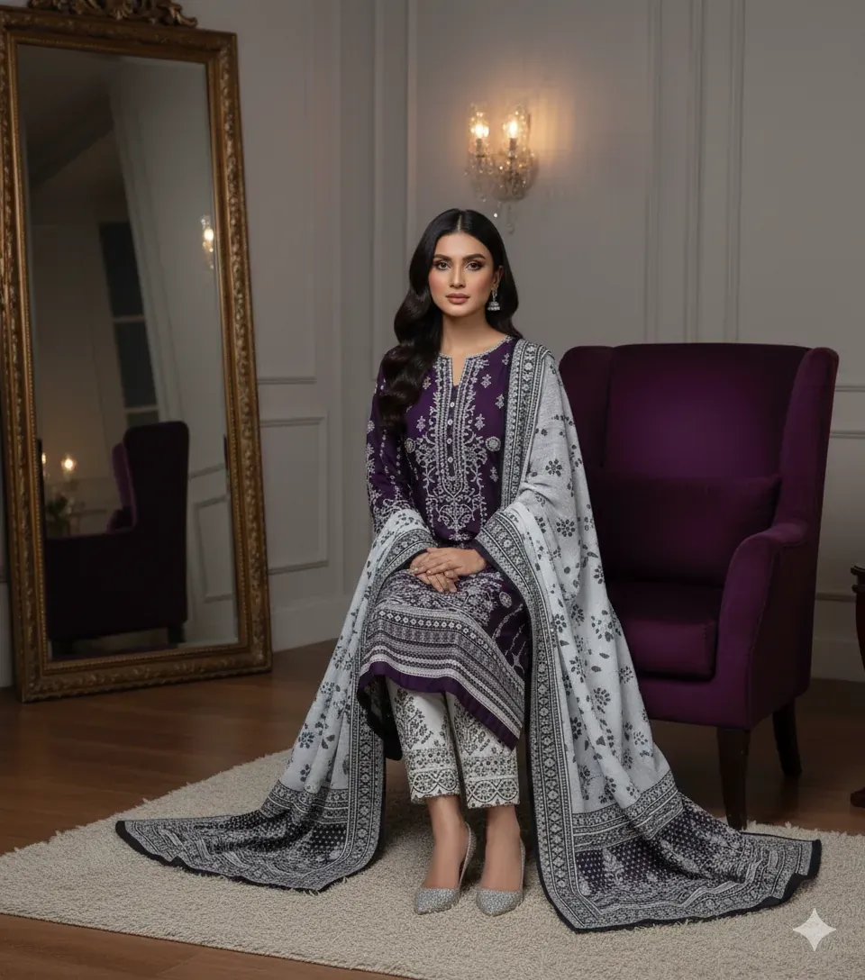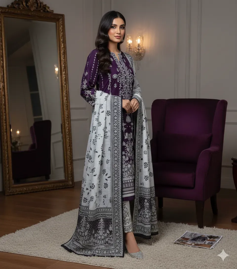 The set includes a digitally printed linen dupatta that adds a rich contrast to the muted yet classy base tones. The plain/printed trouser complements the overall outfit, providing both comfort and style for winter gatherings or everyday wear.