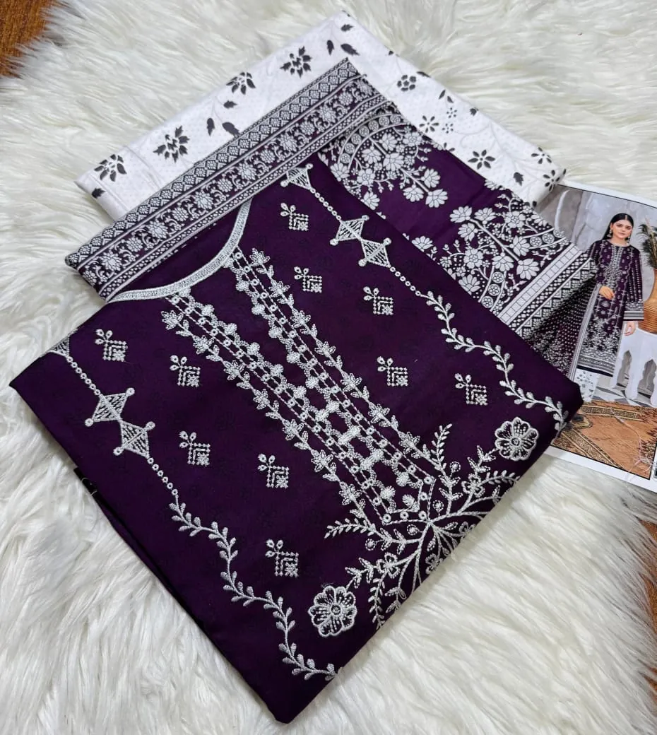 Elevate your winter wardrobe with this elegant 3-piece unstitched suit from the Hajra Emaan Winter Collection 2025. Crafted from premium 72/72 linen fabric, this ensemble features a fully embroidered front with intricate sequence work, offering a perfect blend of traditional elegance and contemporary design.