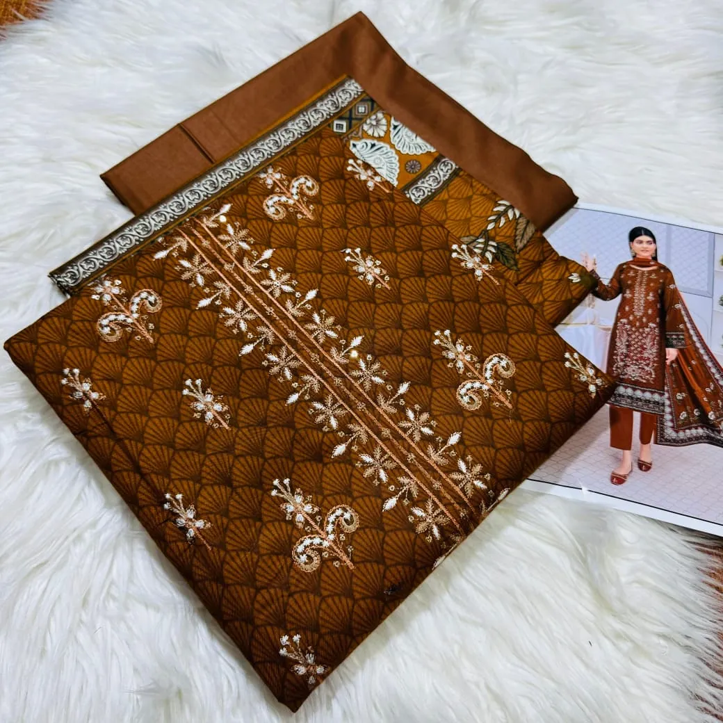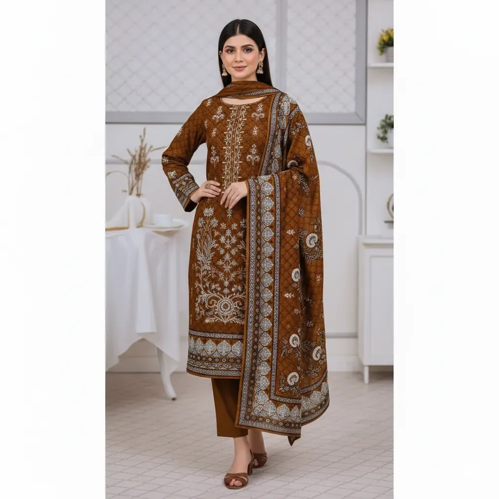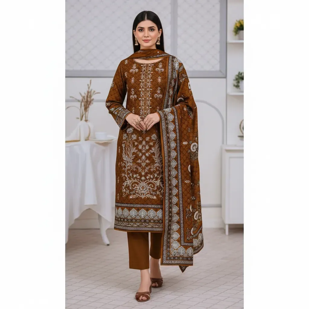 The accompanying digital printed linen dupatta is vibrant and soft, perfectly complementing the intricate embroidery. The ensemble is completed with a plain or printed trouser, offering versatility and a perfect match. With a 100% guarantee on fabric quality and colors, this collection boasts outclass fabrics and a beautiful color scheme. Choose from 20 original designs, each crafted to make you stand out. This Pakistani salwar kameez offers the perfect blend of traditional style and modern comfort, making it a valuable addition to your winter collection.