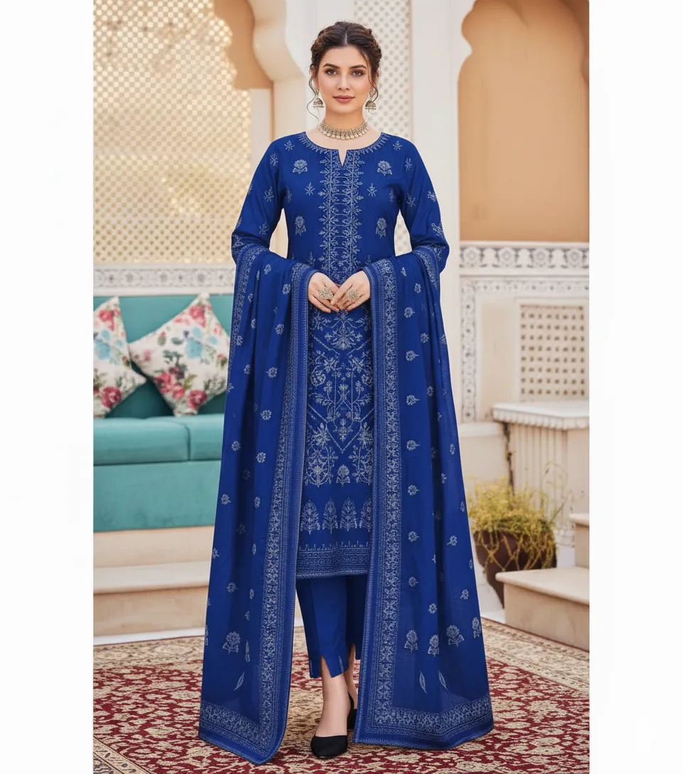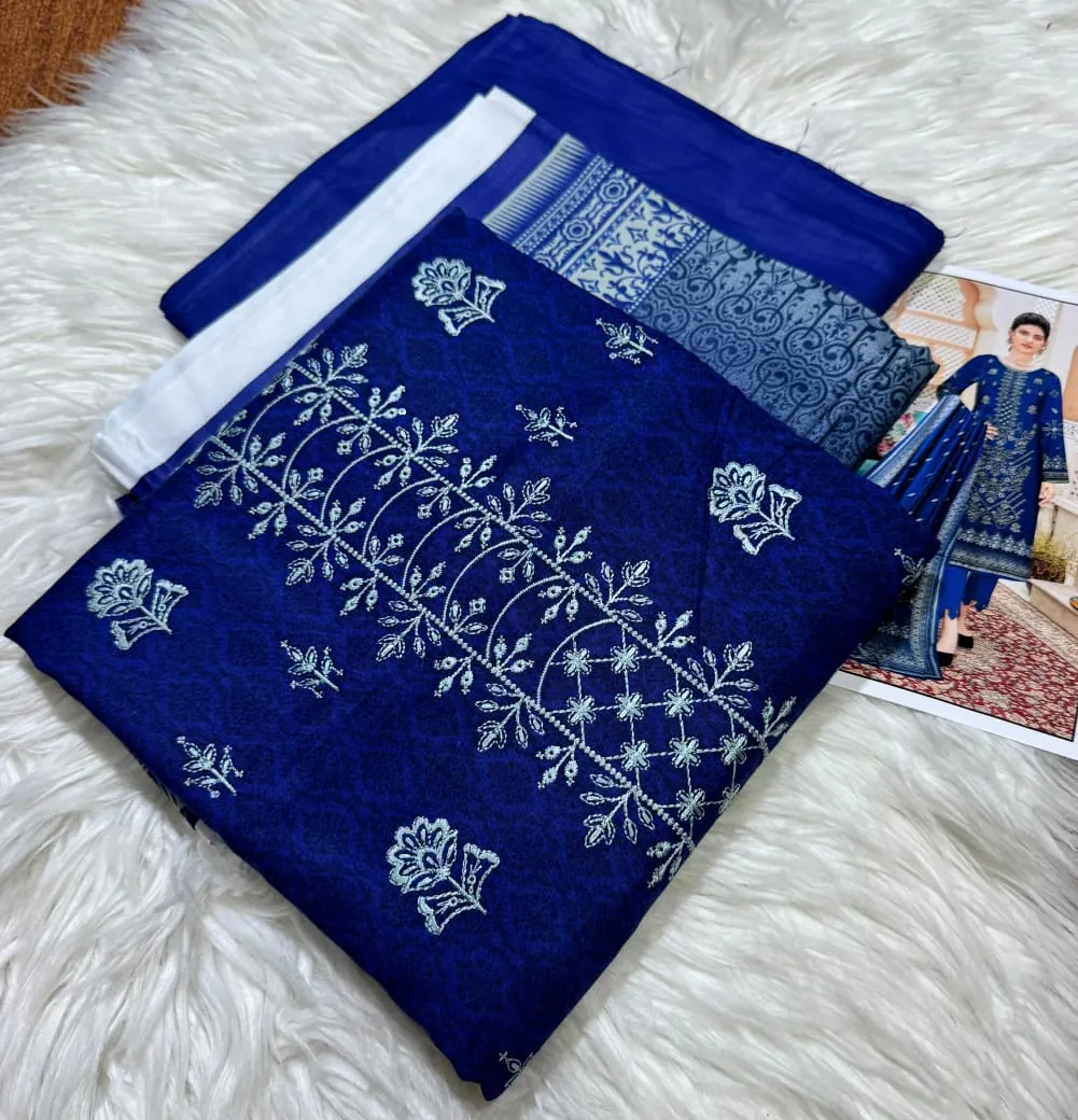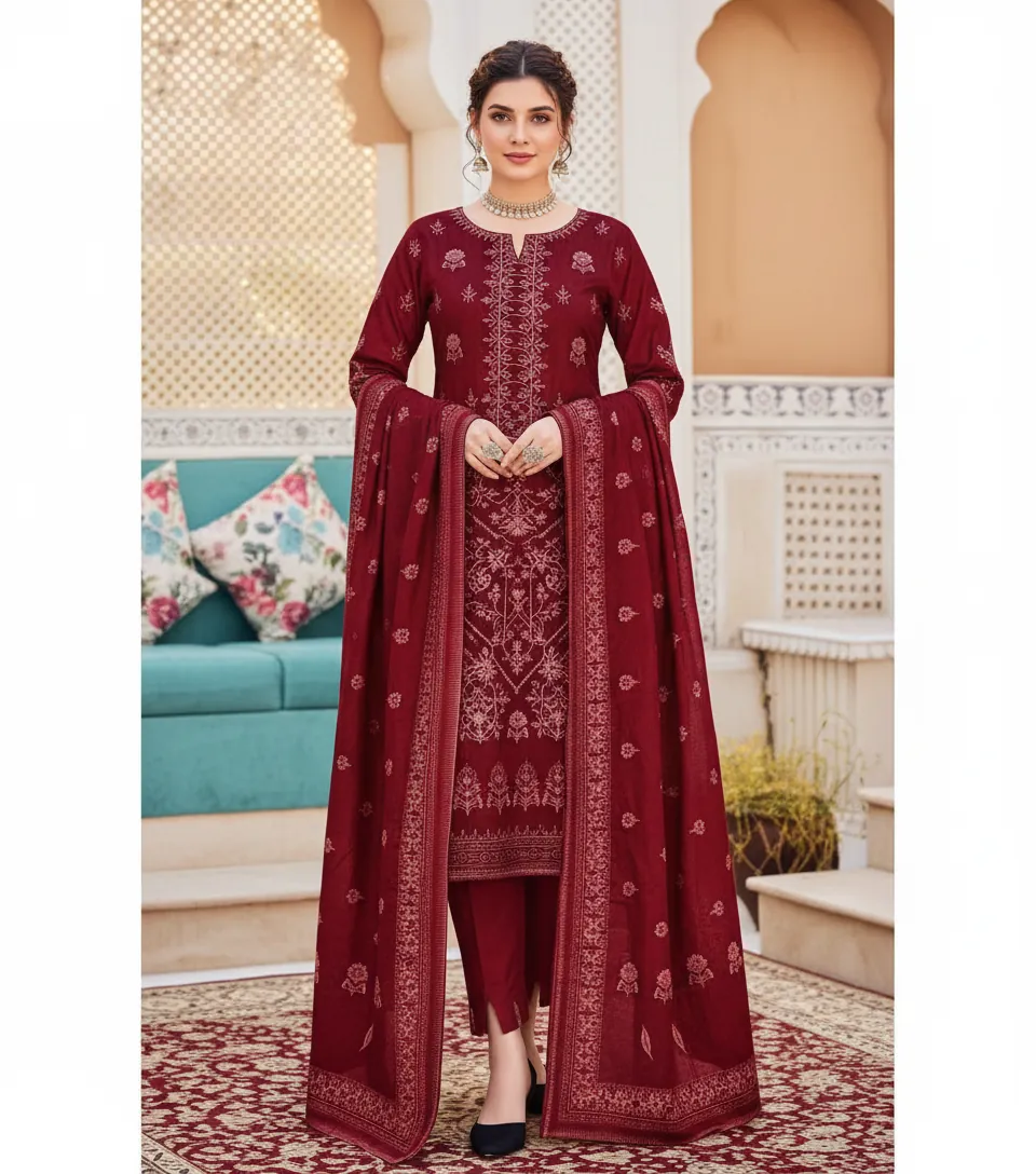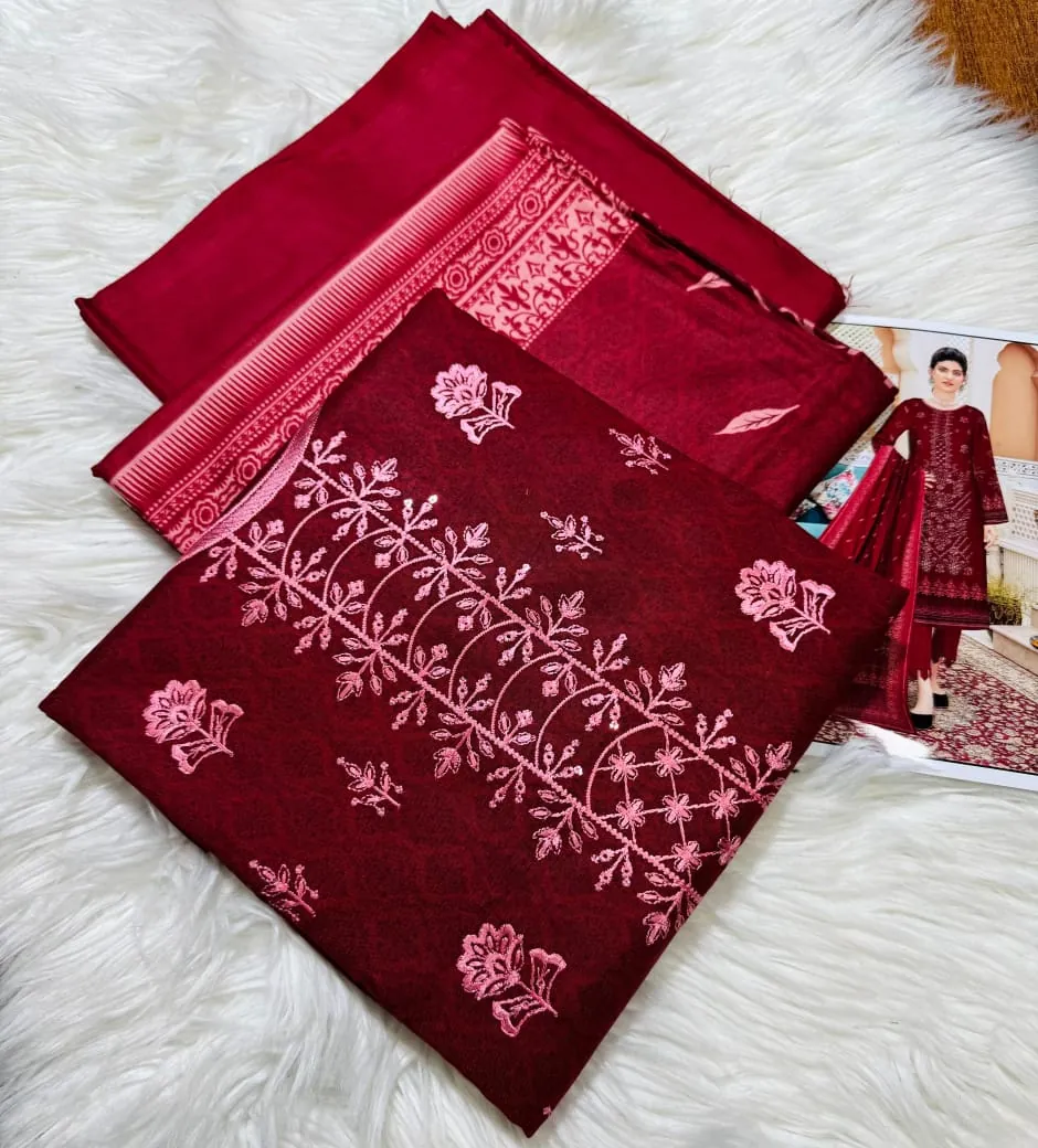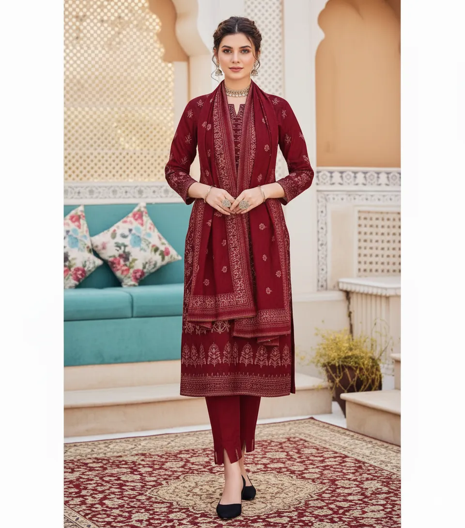 Elevate your winter wardrobe with the stunning Hajra Emaan Winter Collection 2025. This exquisite 3-piece unstitched suit features a premium Linen 72/72 fabric, perfect for the cooler months. The shirt is beautifully adorned with full sequence and panel embroidery on the front, creating a luxurious and intricate design. The digital printed linen dupatta complements the embroidery with its vibrant patterns and soft texture, offering a touch of elegance.