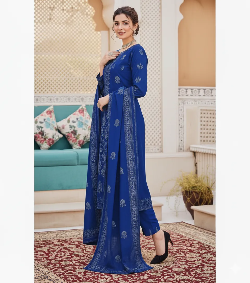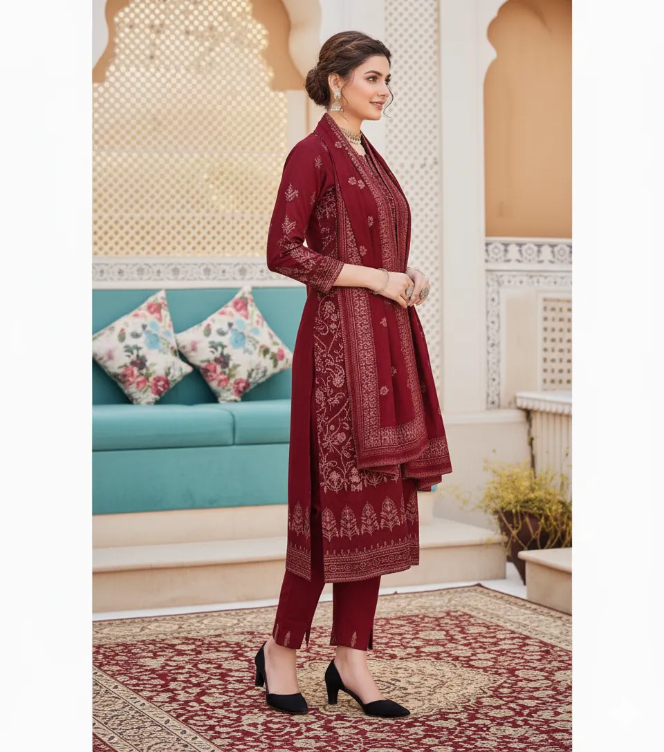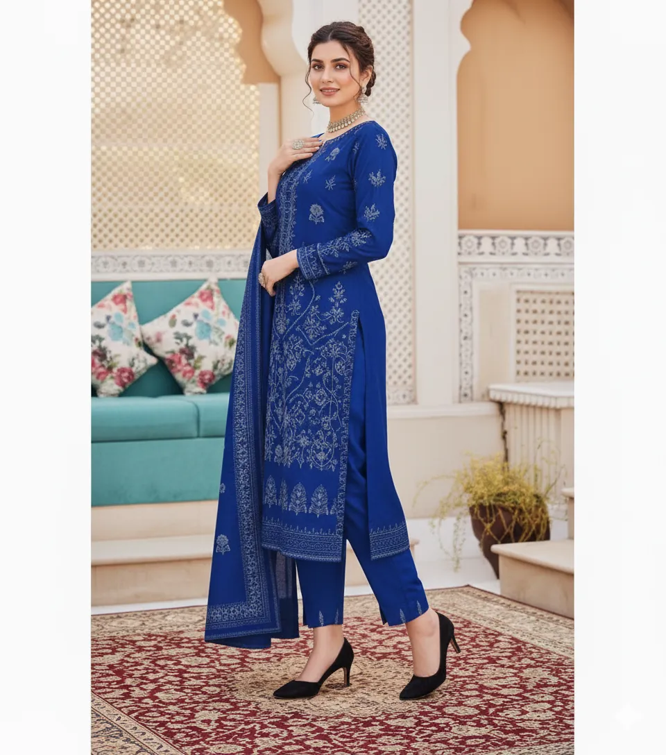 The ensemble is completed with a plain or printed trouser, ensuring a perfect match. With a 100% guarantee on fabric quality and colors, this collection promises outclass fabrics and a beautiful color scheme. Choose from 20 original designs, each crafted to make you stand out. This is a must-have addition to your winter collection, offering both style and comfort.