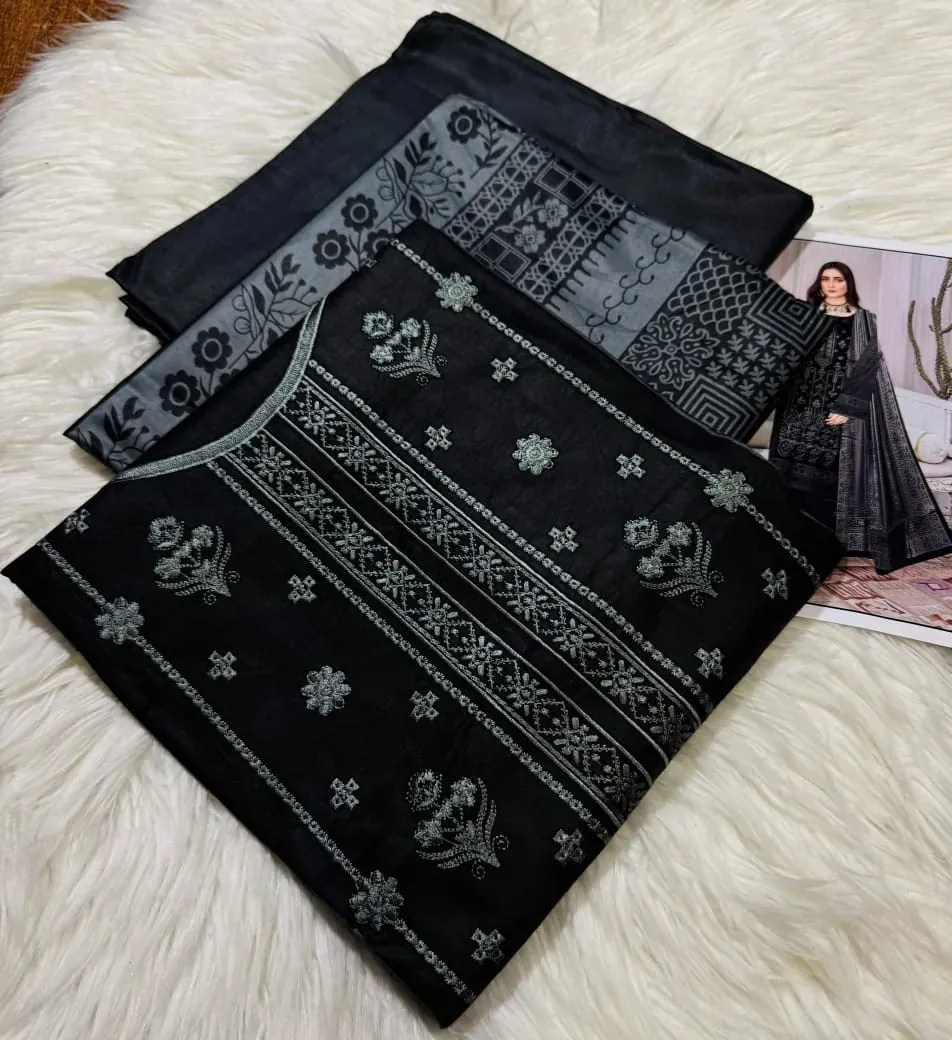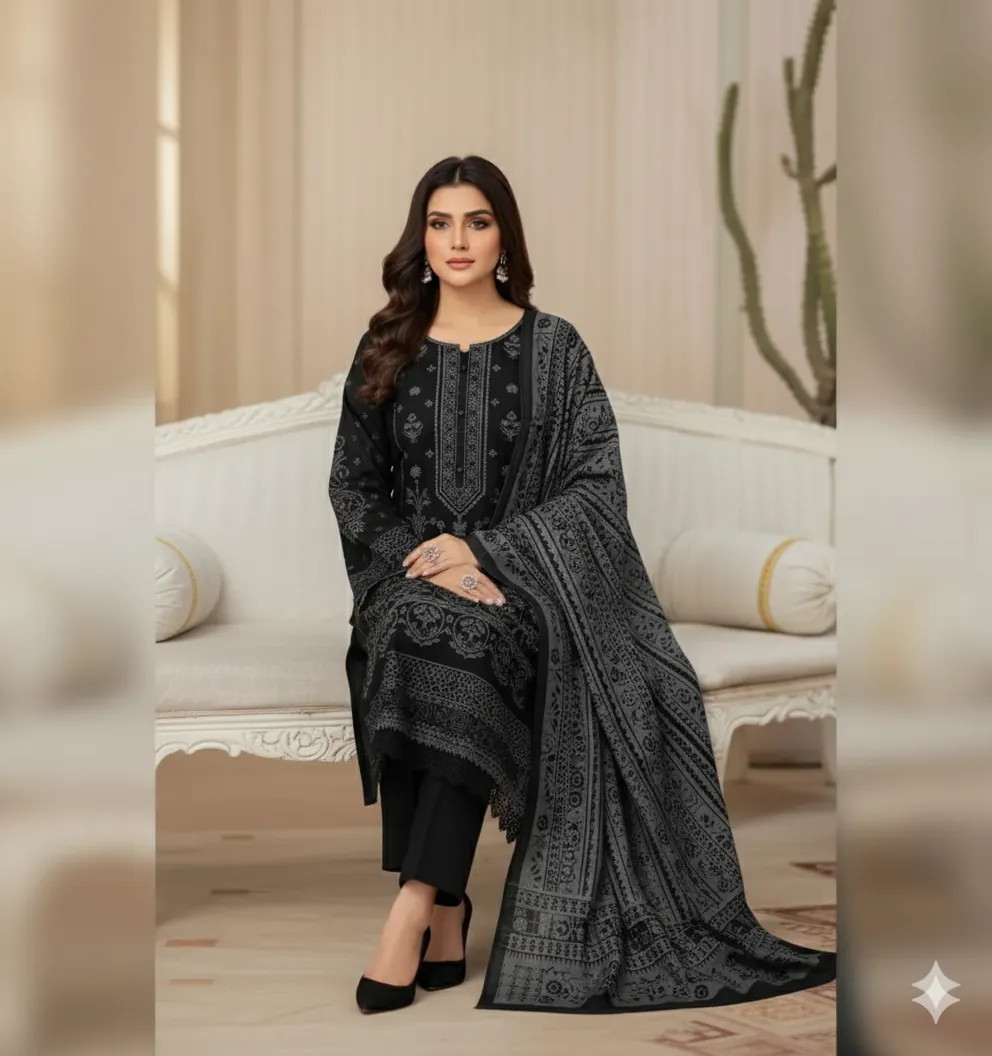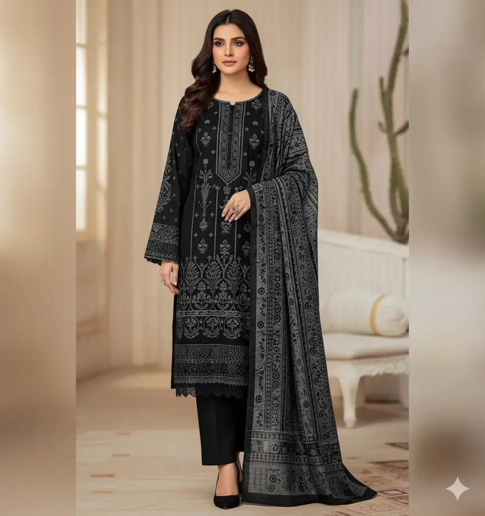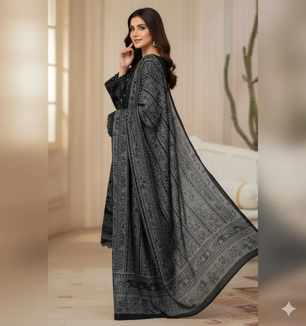The digital printed linen dupatta blends traditional motifs with modern aesthetics, while the plain/printed trouser fabric provides flexibility for personalized tailoring. With a rich and deep black base color, complemented by intricate silver-grey embroidery, this ensemble is ideal for festive gatherings, evening wear, or winter occasions.