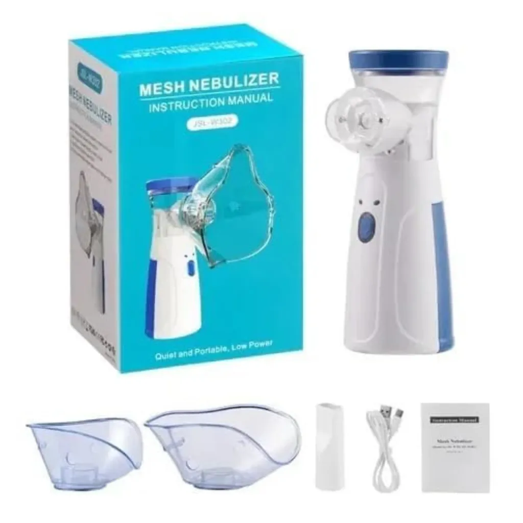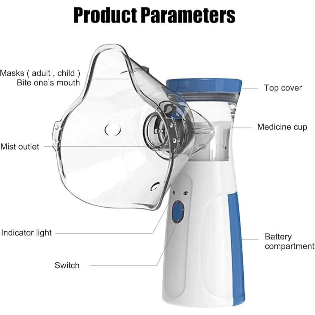 Experience convenient and effective respiratory therapy with the Handheld Mini Nebulizer, a portable device perfect for home or on-the-go use. This compact inhaler features a sleek blue and white design, delivering fine mist medication through its included adult/child mask or mouthpiece for targeted relief from asthma, allergies, or other breathing issues. Powered by batteries or USB (not included), it operates quietly and efficiently, ensuring quick sessions without hassle. The package comes with a durable storage box, making it ideal for travel or daily routines. Easy to assemble, clean, and maintain, this nebulizer is suitable for all ages and promotes better lung health with its atomization technology.