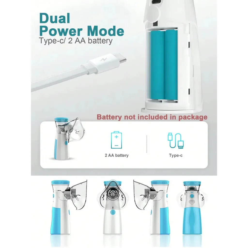 Nebulizer USB rechargeable / battery operated option ke sath aata hai (model ke mutabiq), jis se electricity ke baghair bhi use mumkin hota hai. Ye device low medicine wastage, fast nebulization aur easy cleaning ke features ke sath respiratory care ko simple aur reliable banata hai.