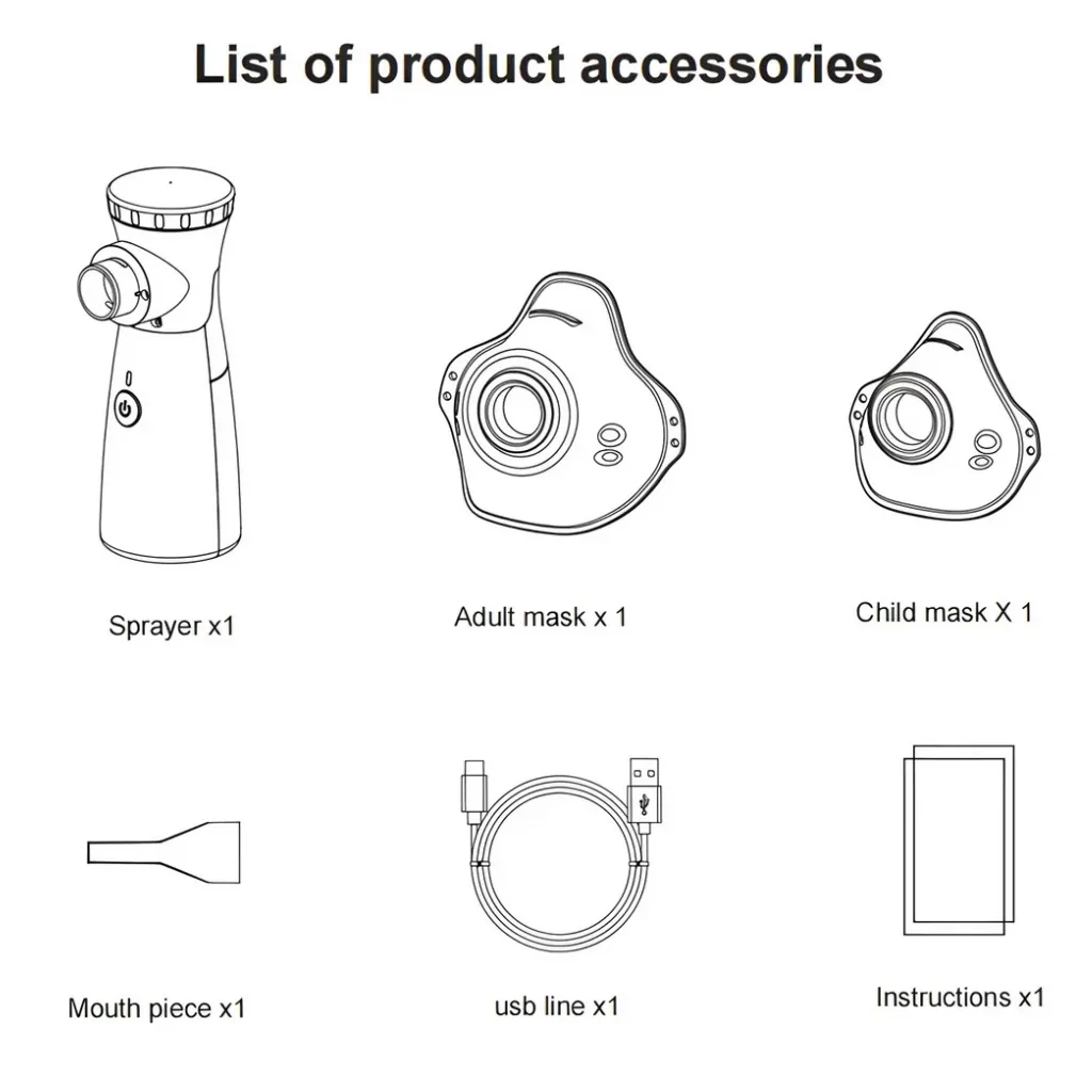 Is portable nebulizer ke sath adult mask, child mask aur mouthpiece milta hai, jo ise har age group ke liye suitable banata hai. Iska silent operation bachon aur raat ke use ke liye ideal hai. Travel size design ki wajah se aap isay ghar, office ya travel ke dauran asaani se use kar sakte hain.