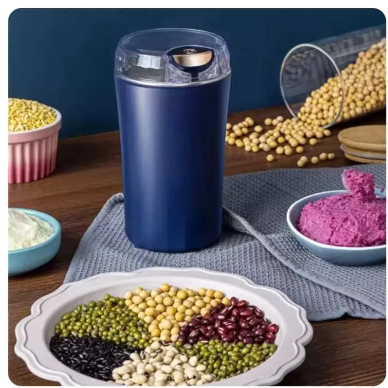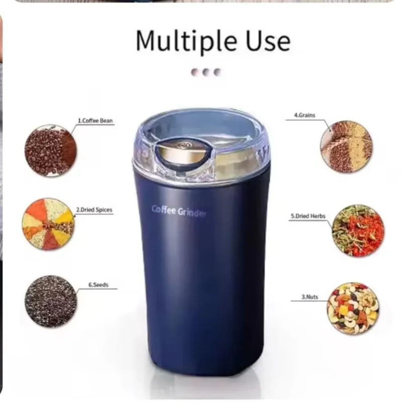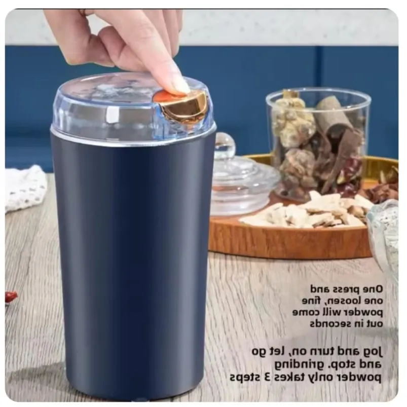 The grinder features a powerful motor and sharp blades, ensuring a fast and consistent grind from coarse to fine powder. Its sleek, modern design and compact size (likely in a durable metal or plastic housing) make it a stylish and space-saving addition to any countertop. The lid typically functions as a one-touch switch, making operation safe and simple. Whether you are preparing fresh espresso grounds or making homemade spice rubs, this grinder is an essential tool for achieving the best flavor and texture.